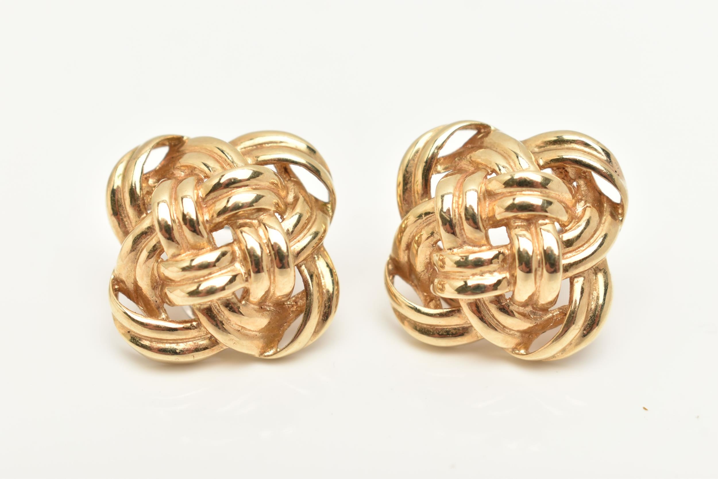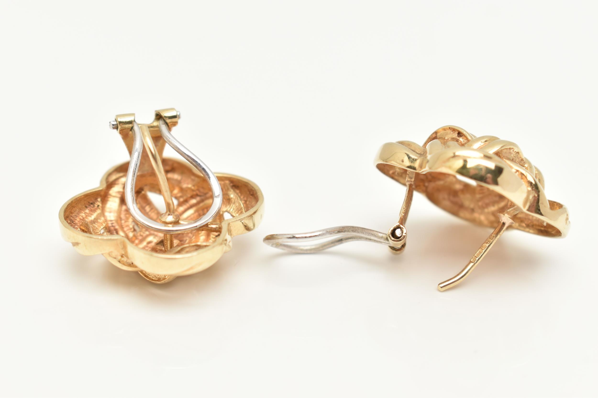 A PAIR OF 9CT GOLD QUATREFOIL EARRINGS, of an open work woven design, fitted with posts and lever back fittings for pierced ears, hallmarked 9ct Sheffield import, approximate diameter 21.7mm, approximate gross weight 7.1 grams (condition report: general light wear)