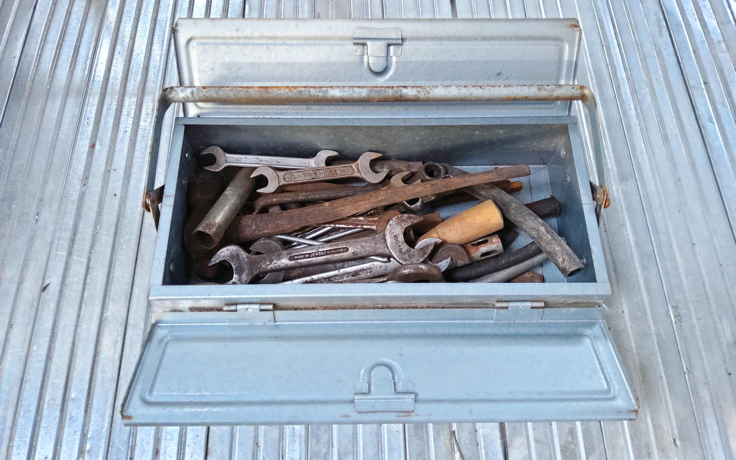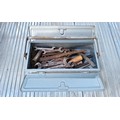 Metal tool box with a collection of spanners including Brit tool, King Dick and Jenbro.
