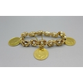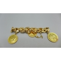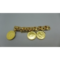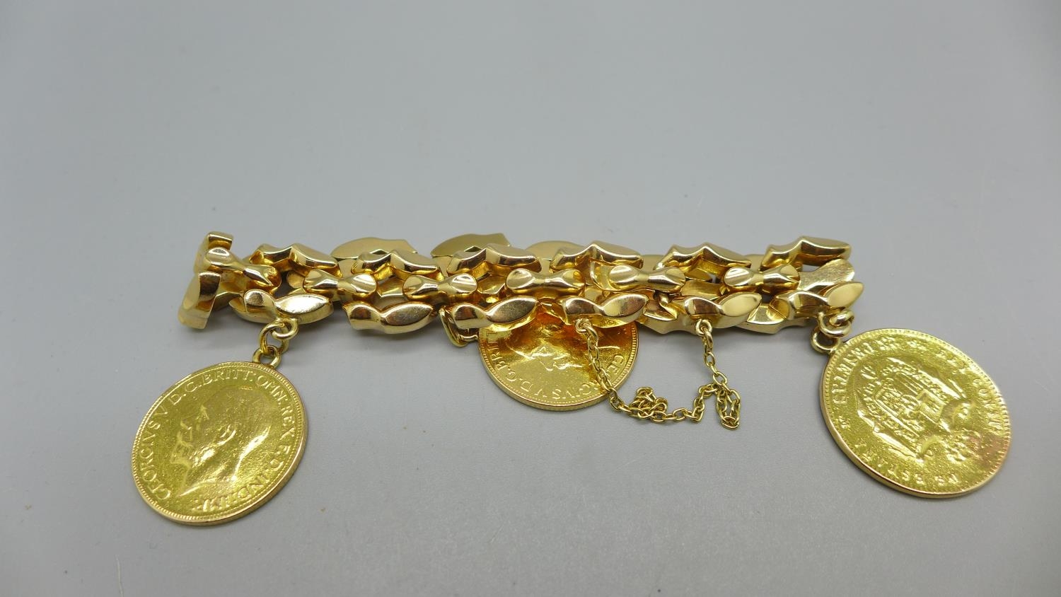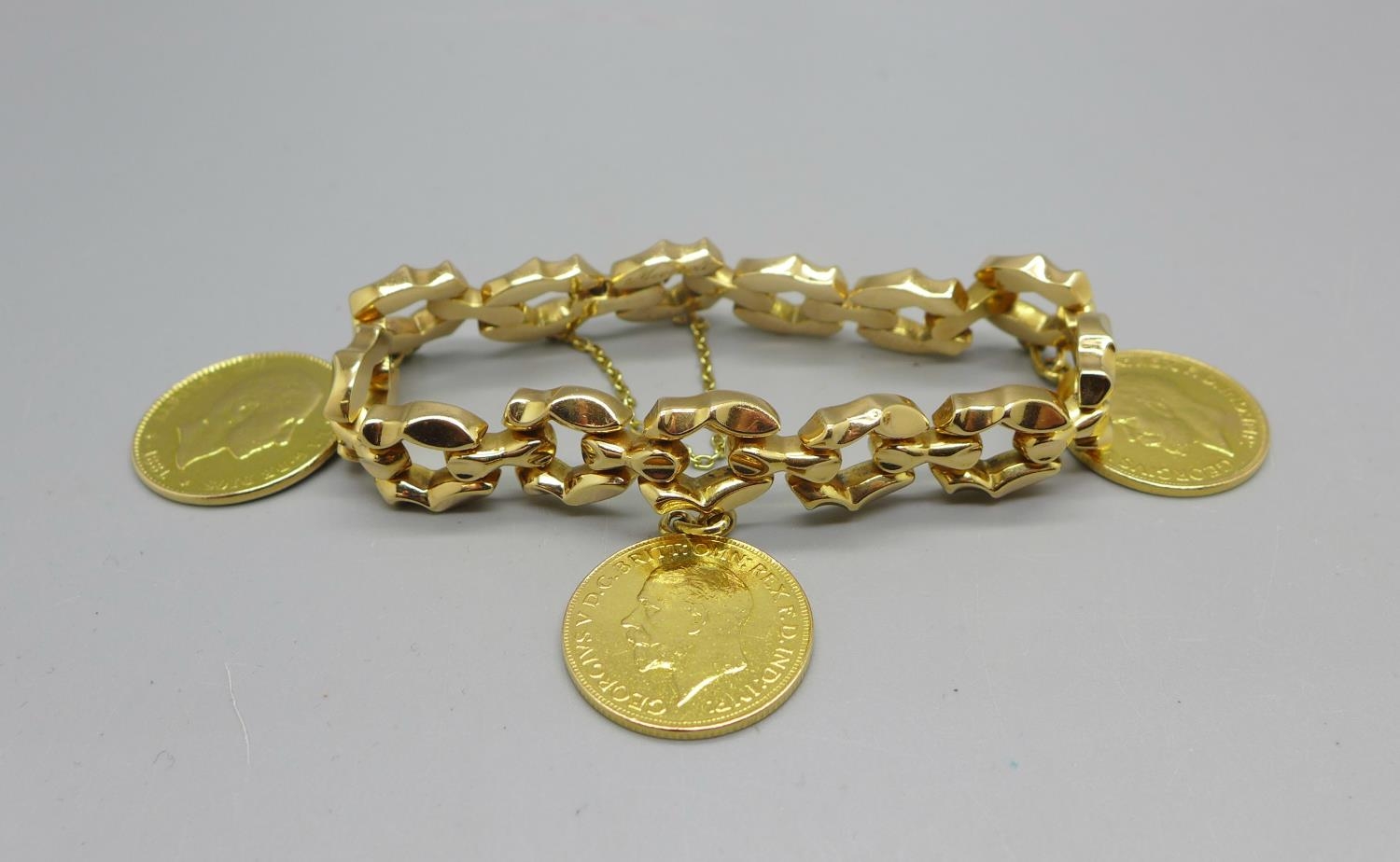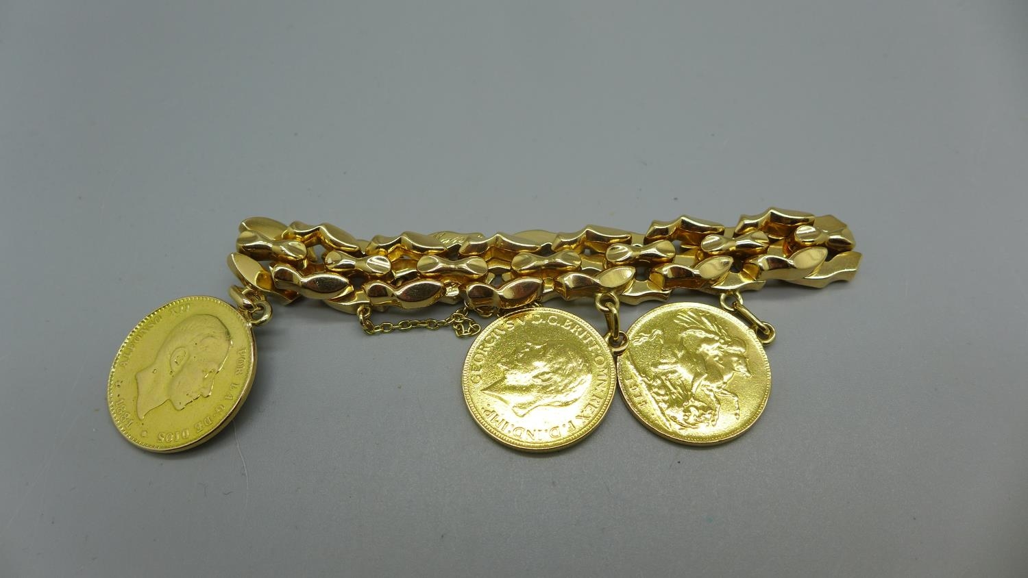 A 14ct gold bracelet set with two 1913 full sovereign charms and an 1881 25 pesetas gold coin, total weight 53.9g