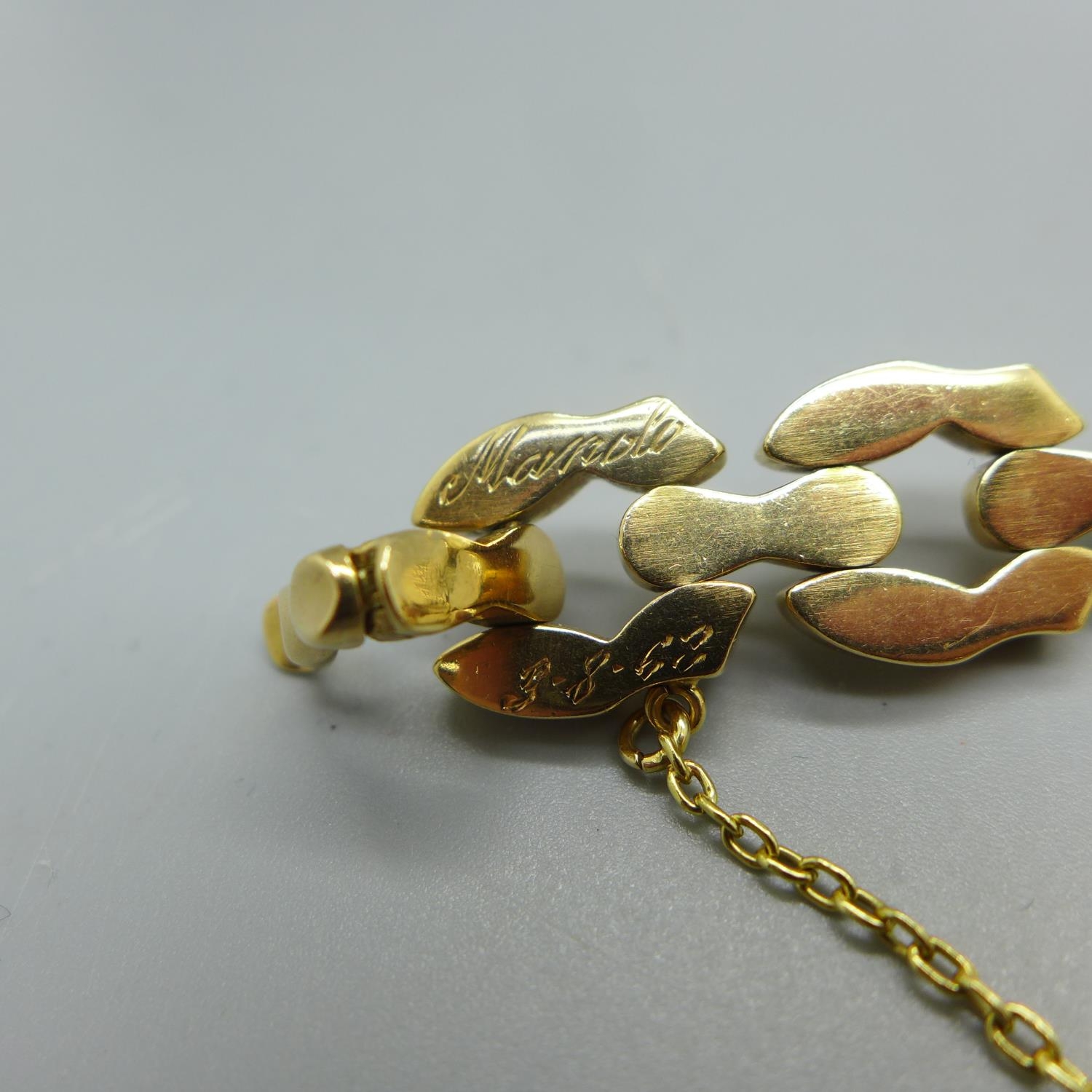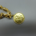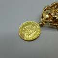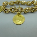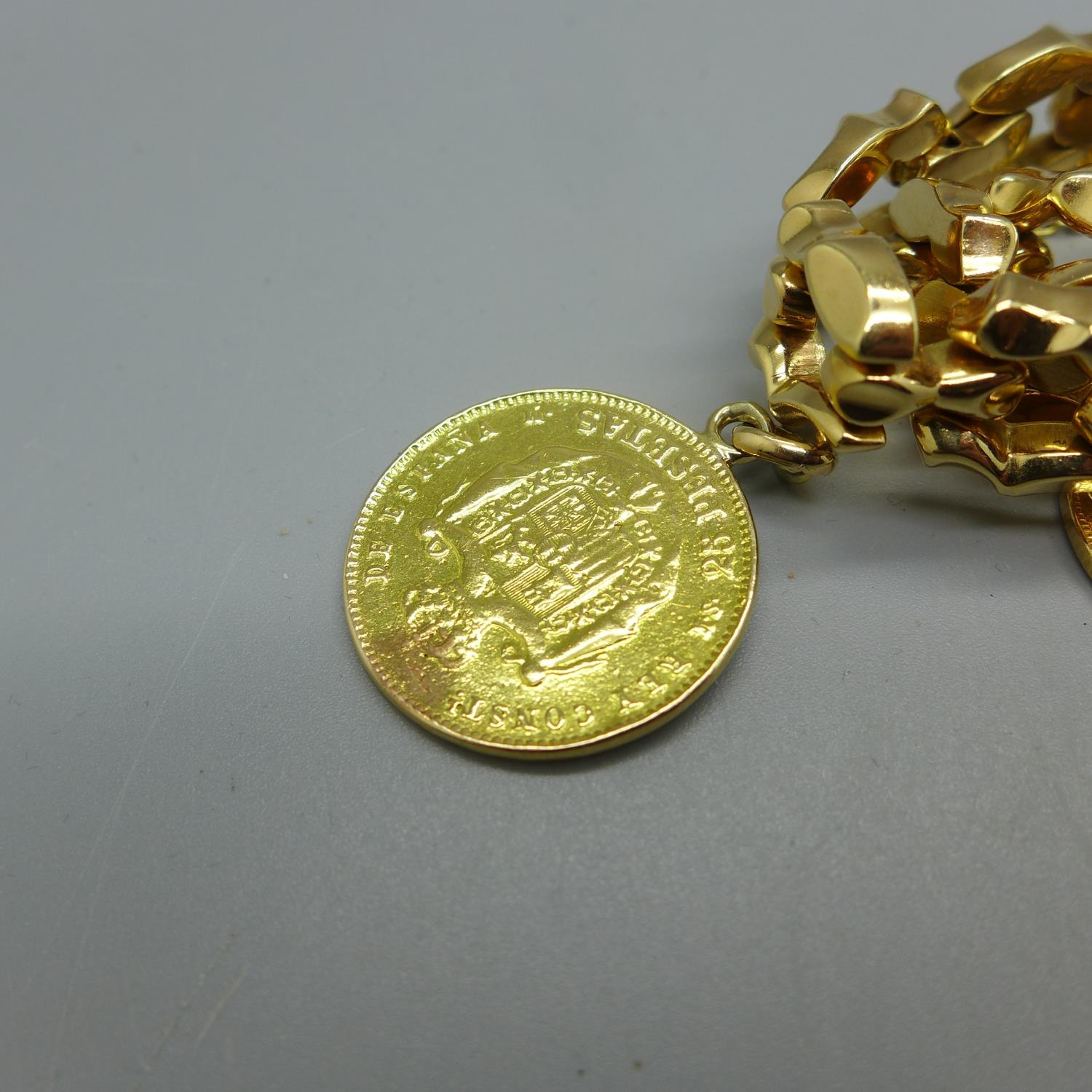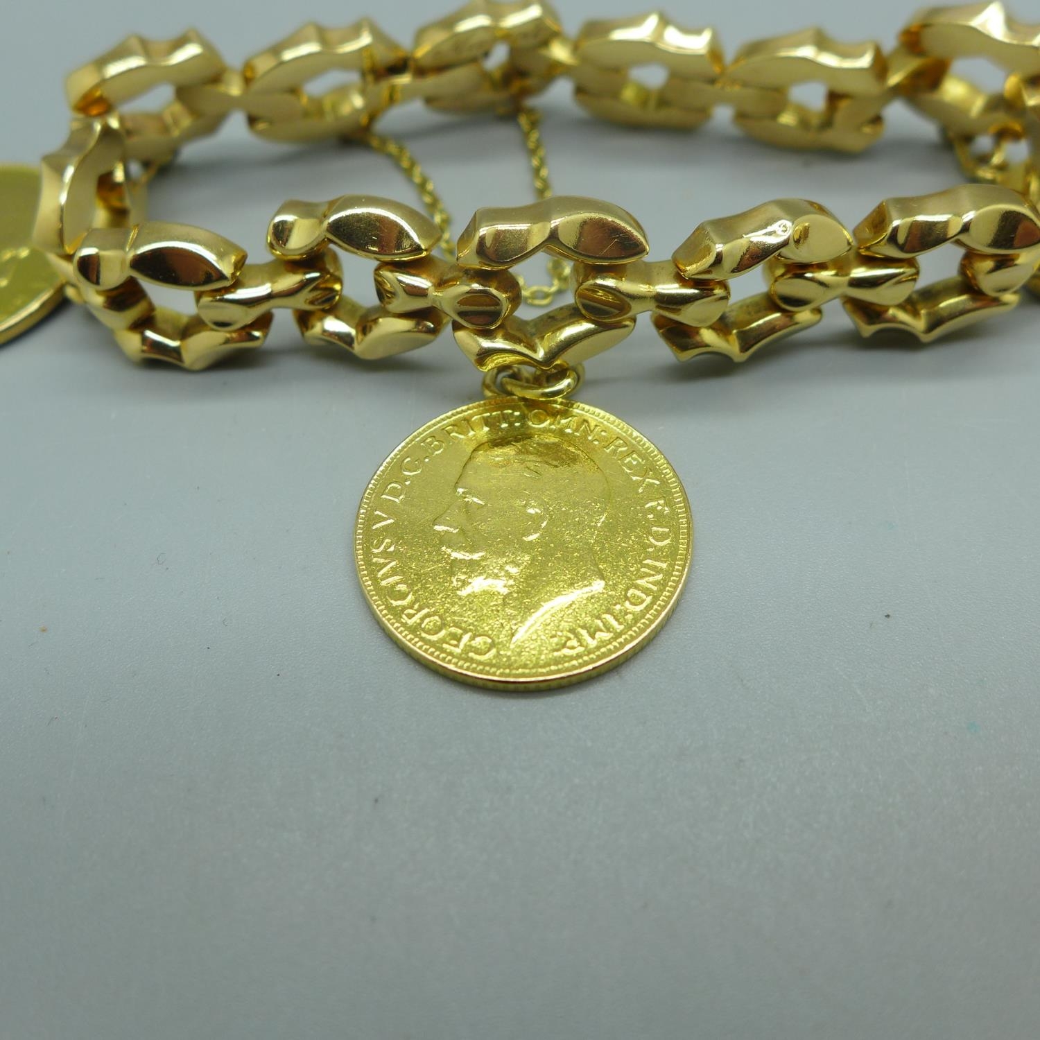 A 14ct gold bracelet set with two 1913 full sovereign charms and an 1881 25 pesetas gold coin, total weight 53.9g