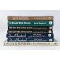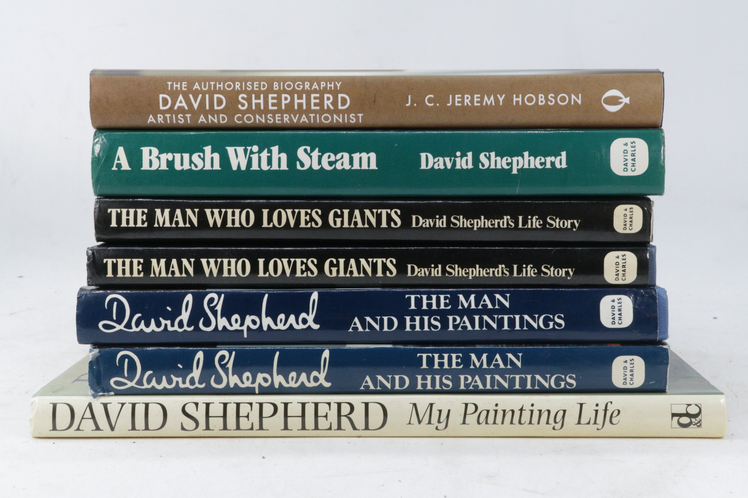 David Shepherd books to include biography with signed insert together with 2 copies of "Man who loves Giants", "A brush with steam", "The man and his paintings", "My painting life"