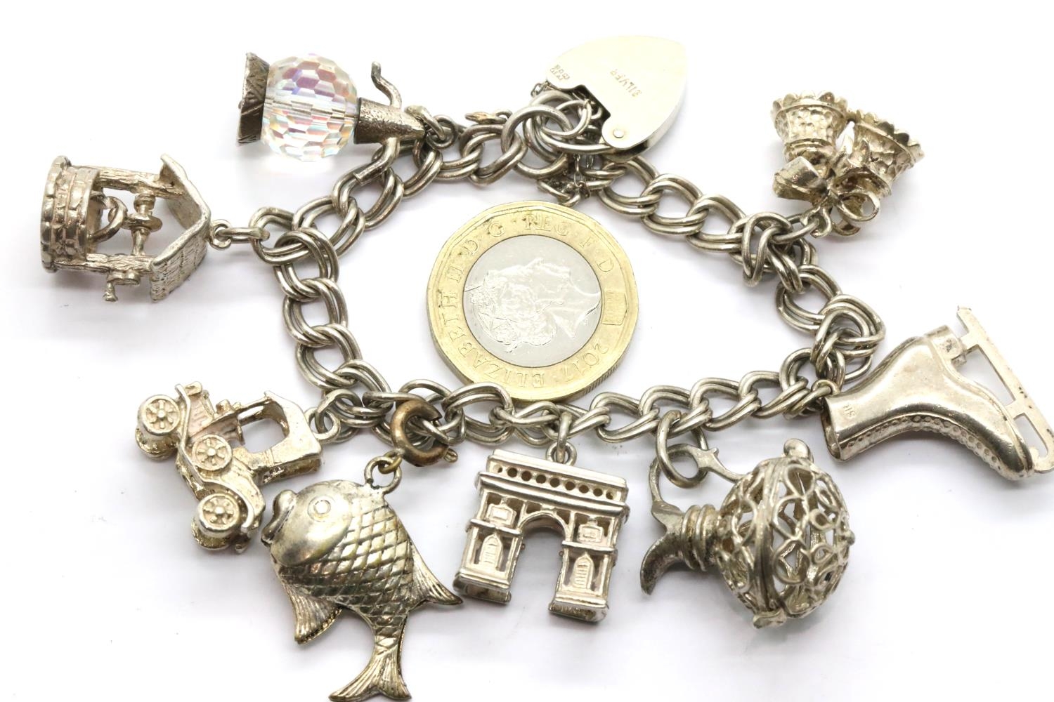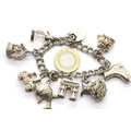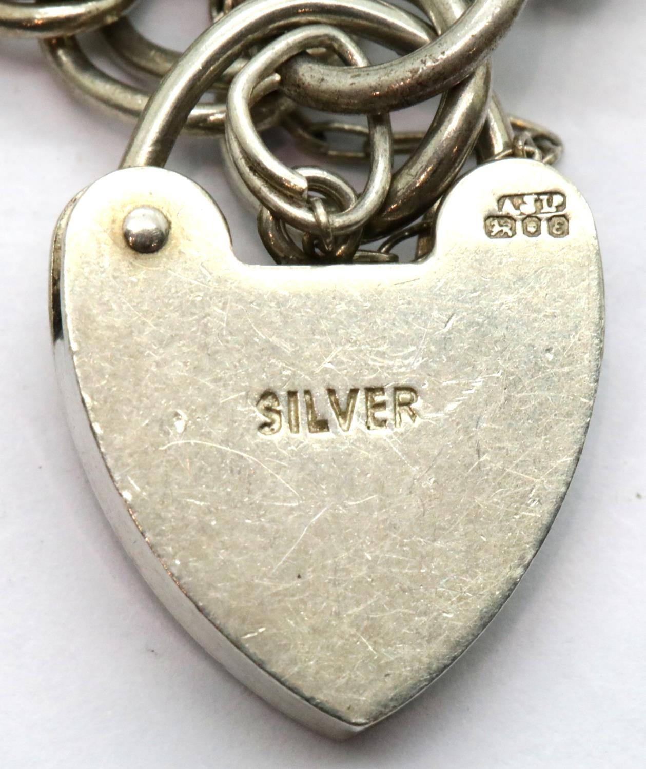 Hallmarked silver charm bracelet with padlock clasp and eight large charms. P&P Group 1 (£14+VAT for the first lot and £1+VAT for subsequent lots)