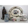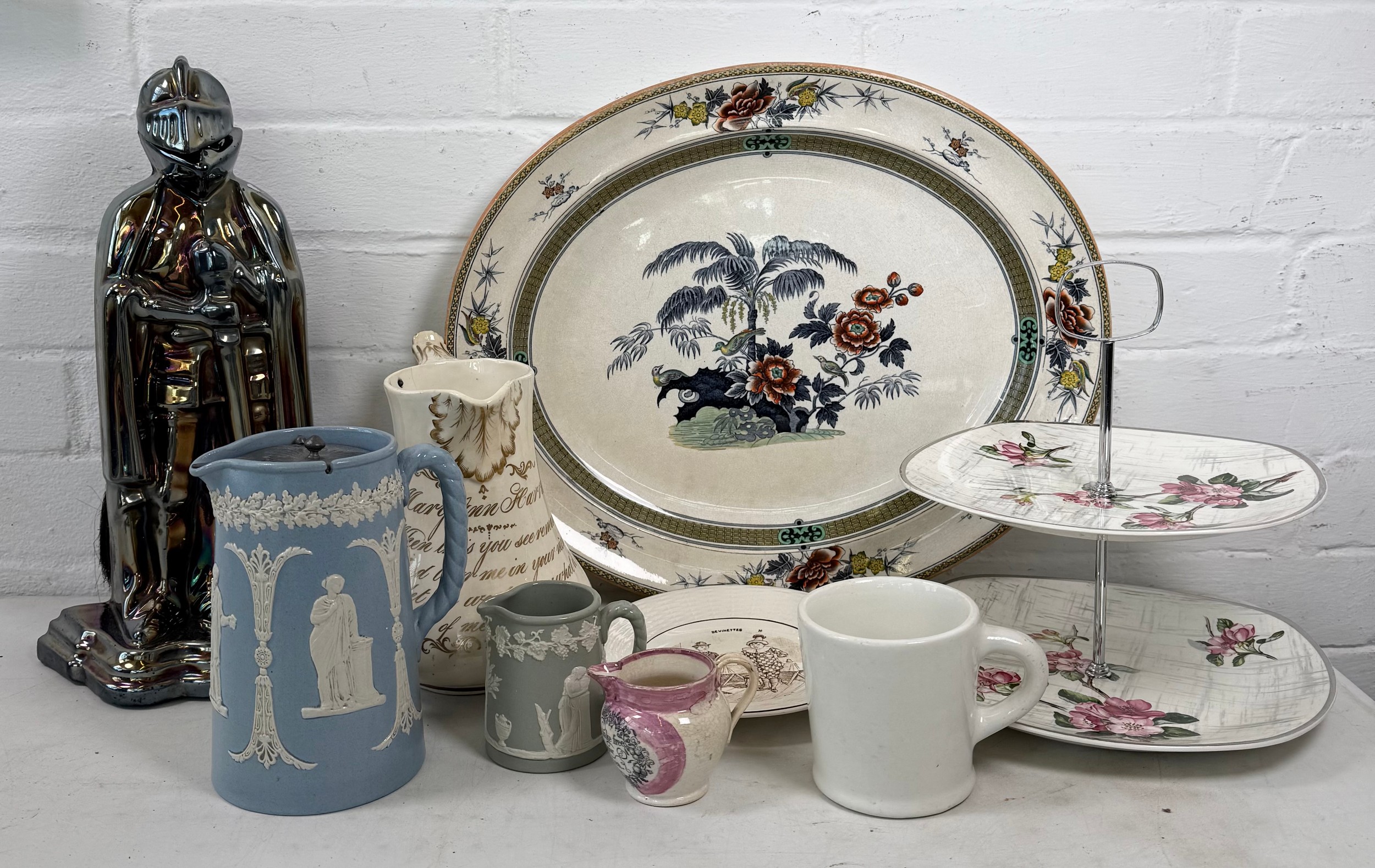 WW2 Crescent china mug dated 1942, Stylecraft cake stand, large antique meat plate, Jugs, commemorative pitcher and fireside Knight companion set etc