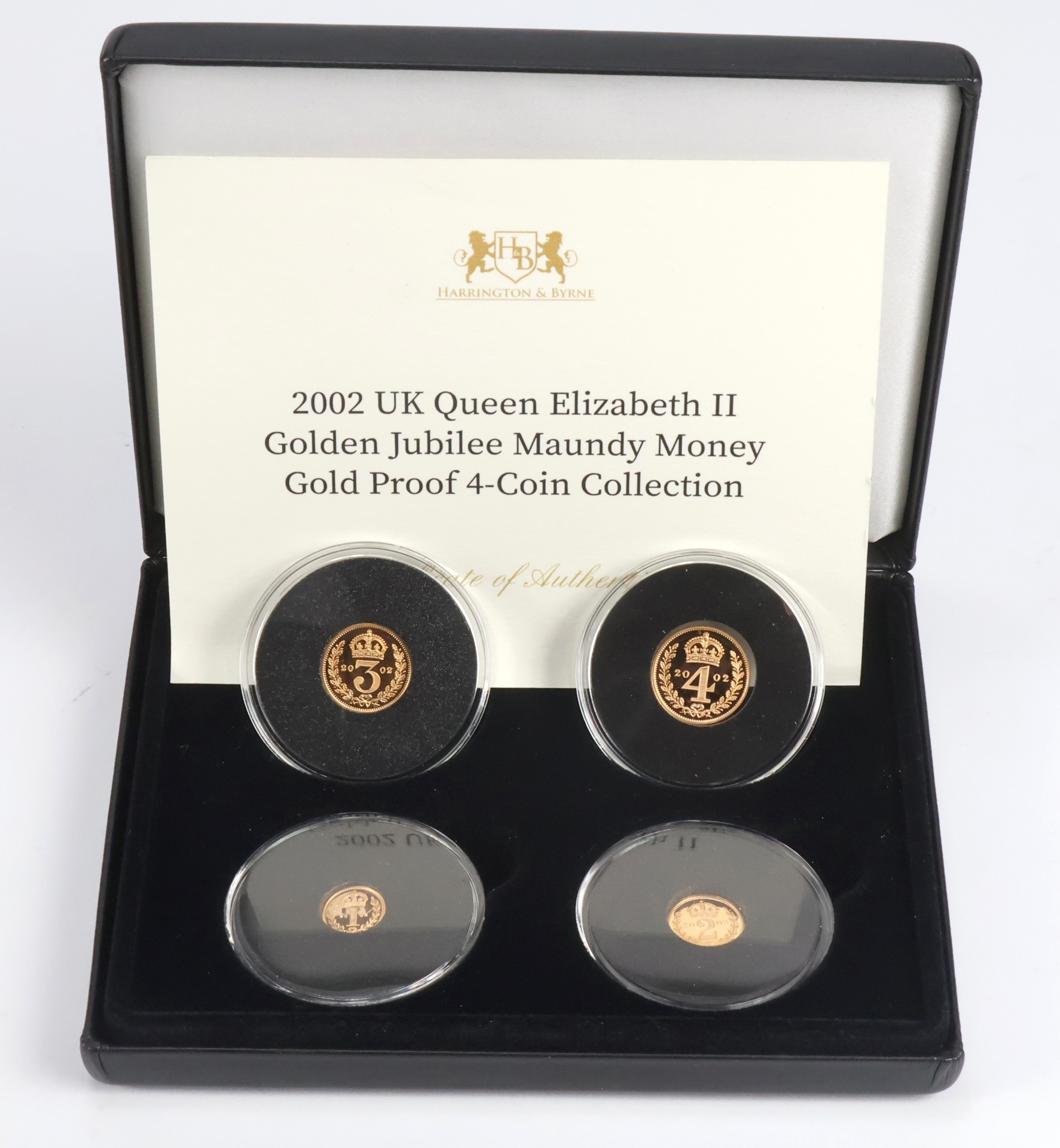 Maundy Set 2002 gold Proof issue. FDC in a "Harrington & Byrne" box with certificate