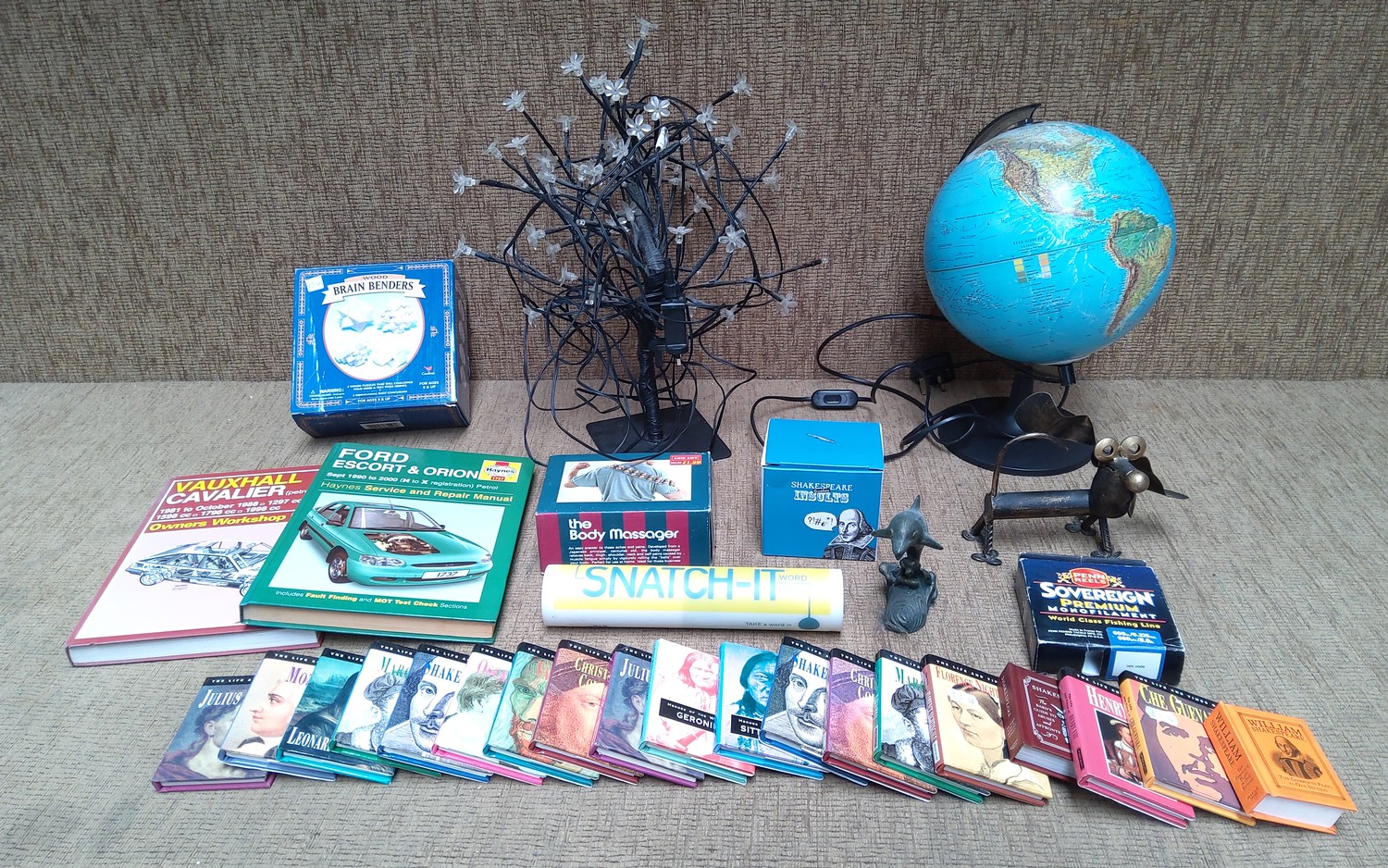 Mixed items including a set of Life and times books, globe lamp and Hynes manuals.