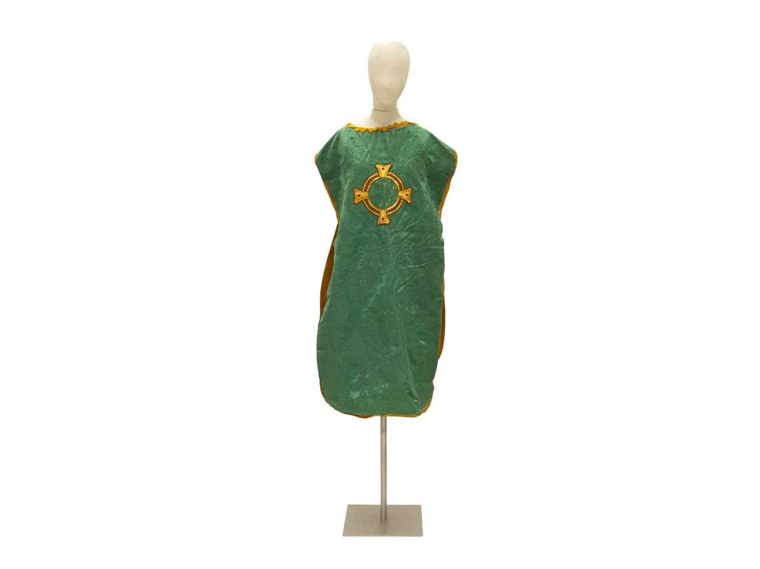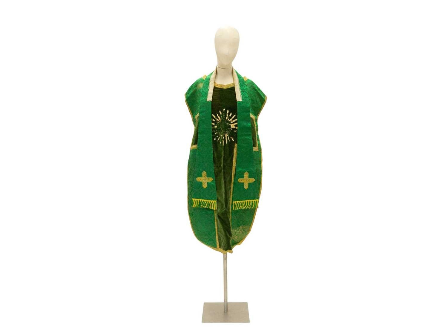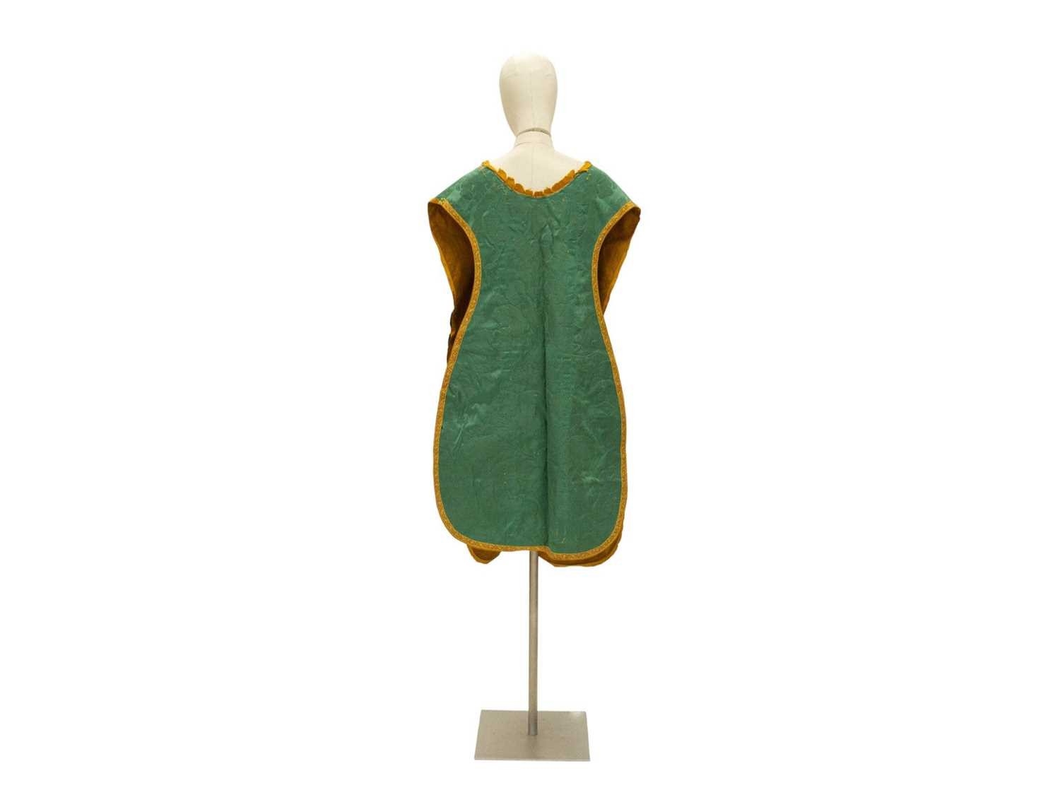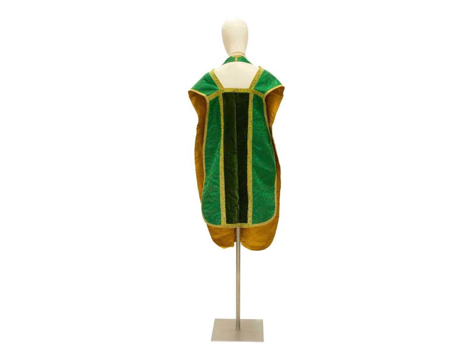 Liturgical Vestments - a green velvet and brocade chasuble, with yellow border and lining. 20th century. Together with a matching stole, and one other green chasuble (3).