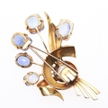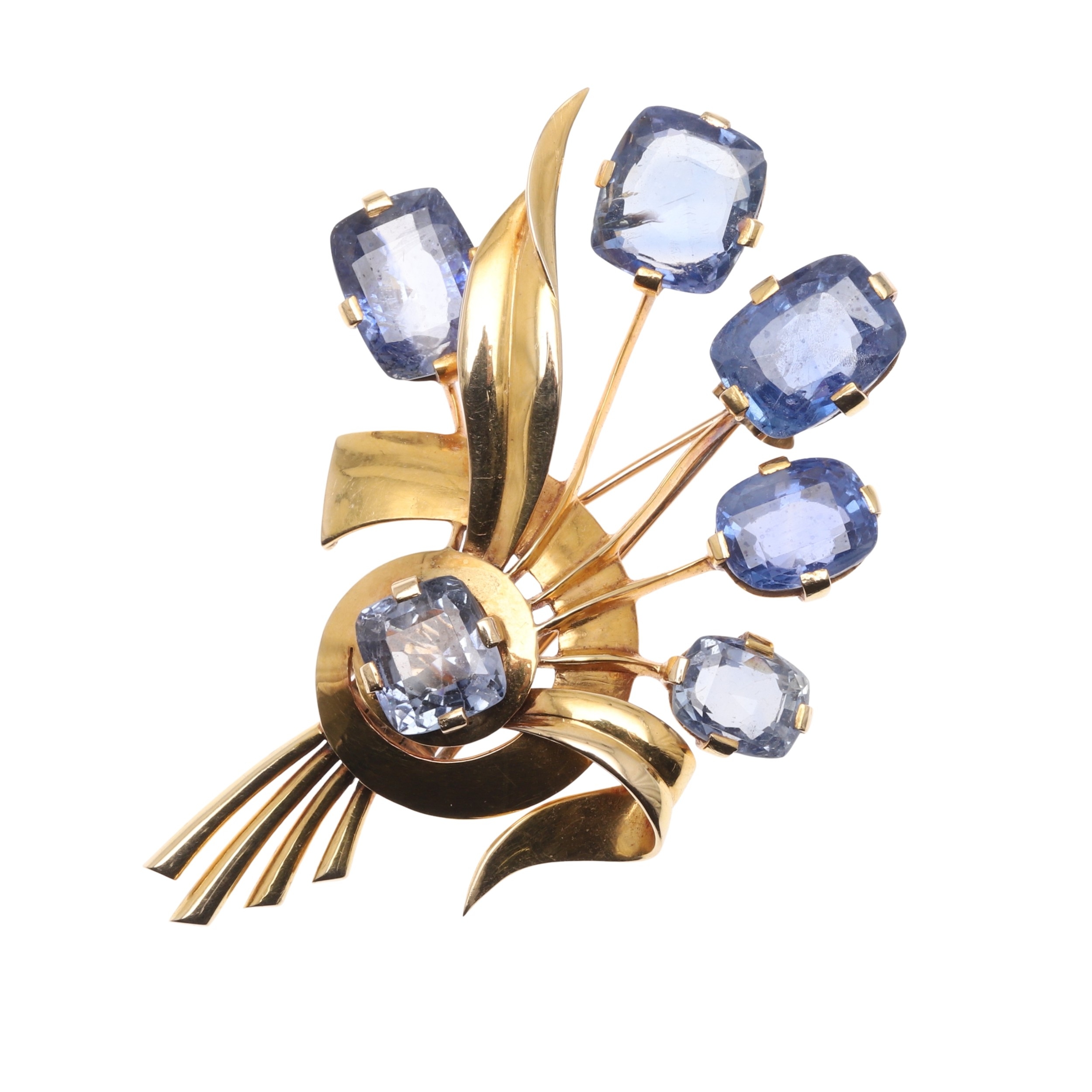 A SAPPHIRE AND GOLD FOLIATE SPRAY BROOCH. mounted with six sapphires of cushion and rounded rectangular-shape, 7cm high, 27.2 grams.