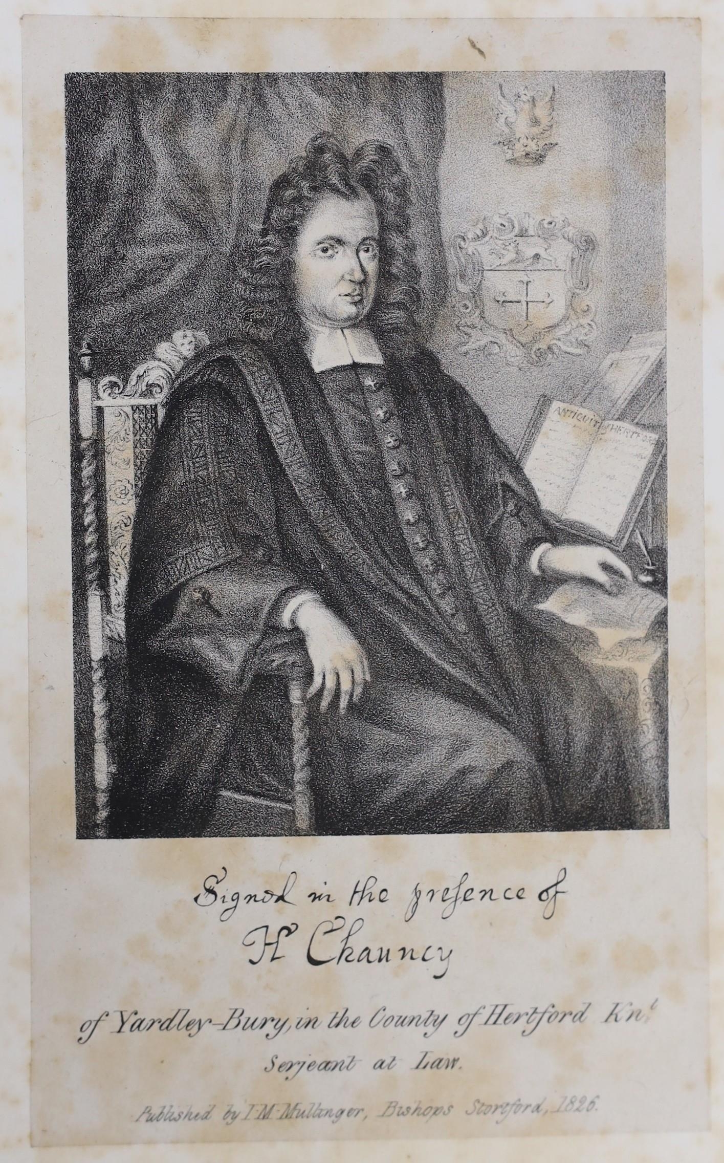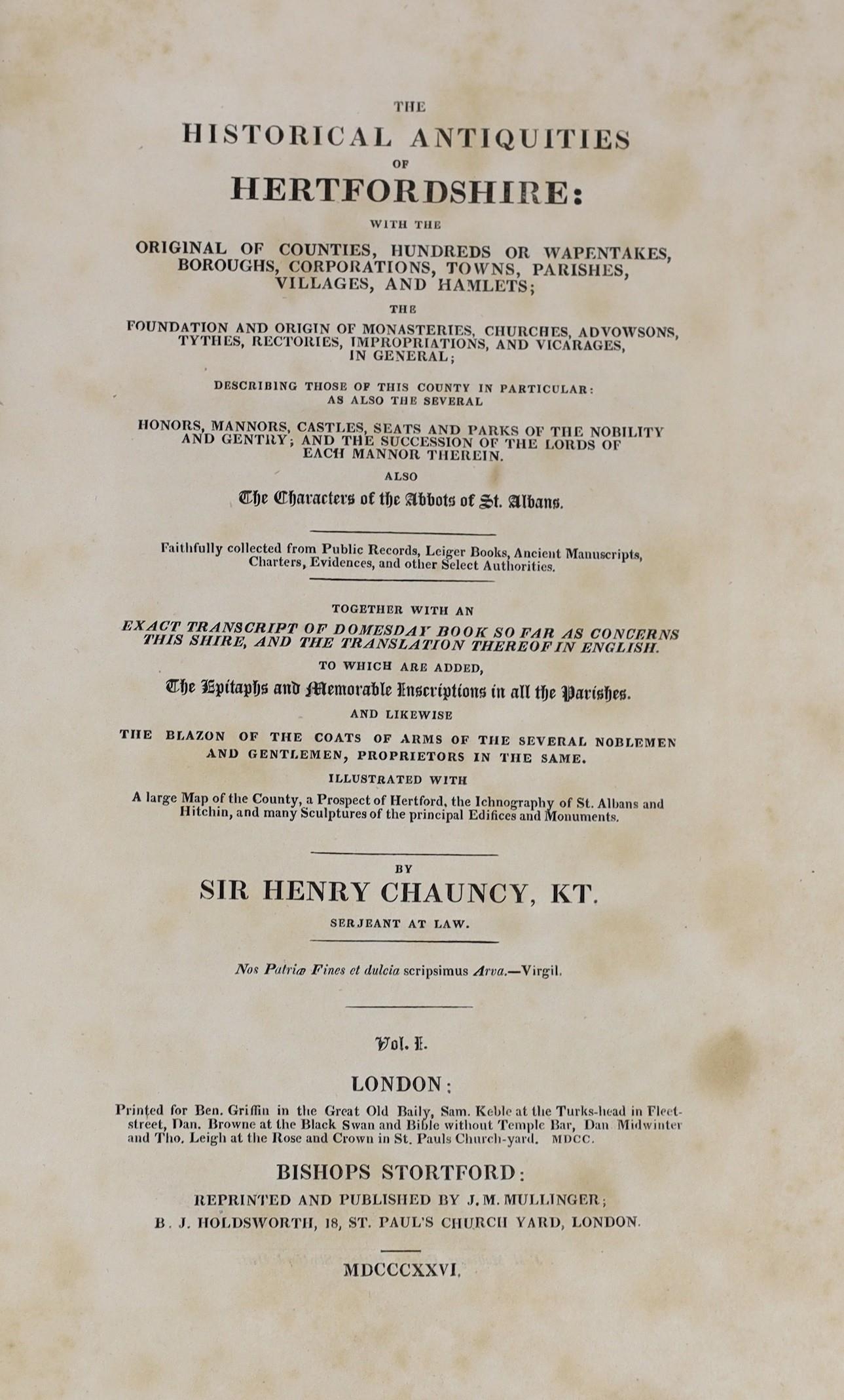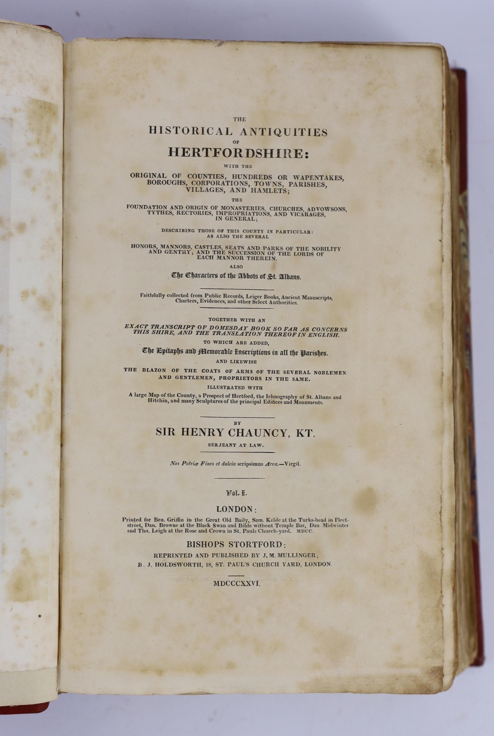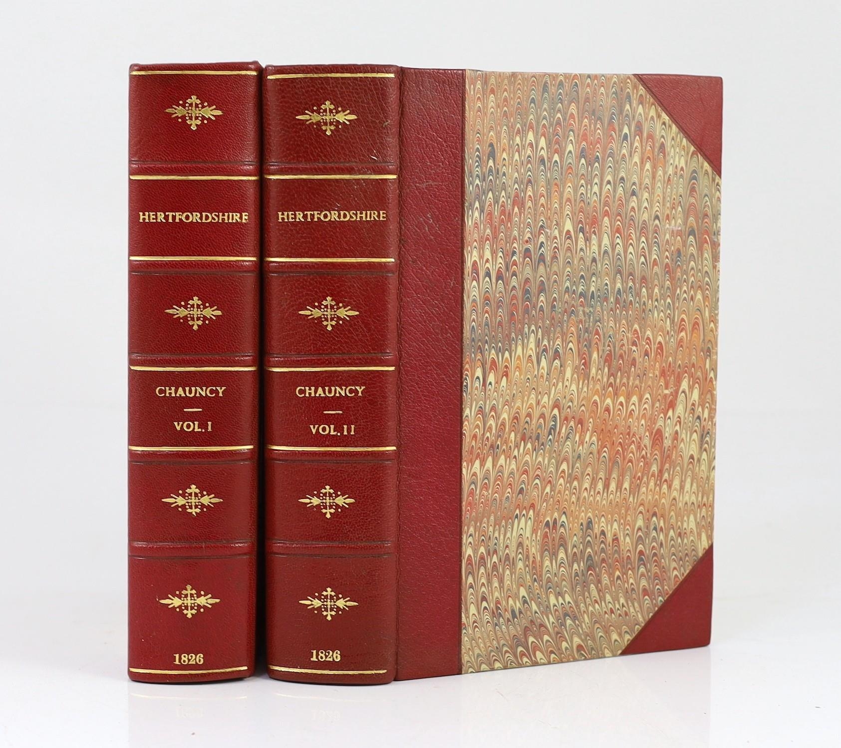 ° ° HERTS: Chauncy, Sir Henry - The Historical Antiquities of Hertfordshire ... (new edition), 2 vols. portrait, large folded map and 44 plates (mostly d-page), subscribers list; rebound 20th cent. red half morocco and marbled boards, gilt-panelled spines, edges rough-trimmed, roy.8vo. Bishops Stortford, 1826.