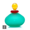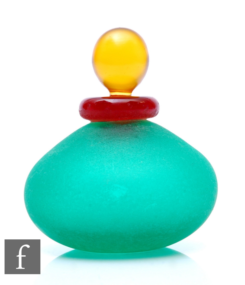 Franco Moretti - A late 20th Century Murano glass perfume bottle, of compressed globular form, the green body decorated with a frosted Scavo type finish, below a ruby red collar and amber glass ball stopper, engraved signature, height 13cm.