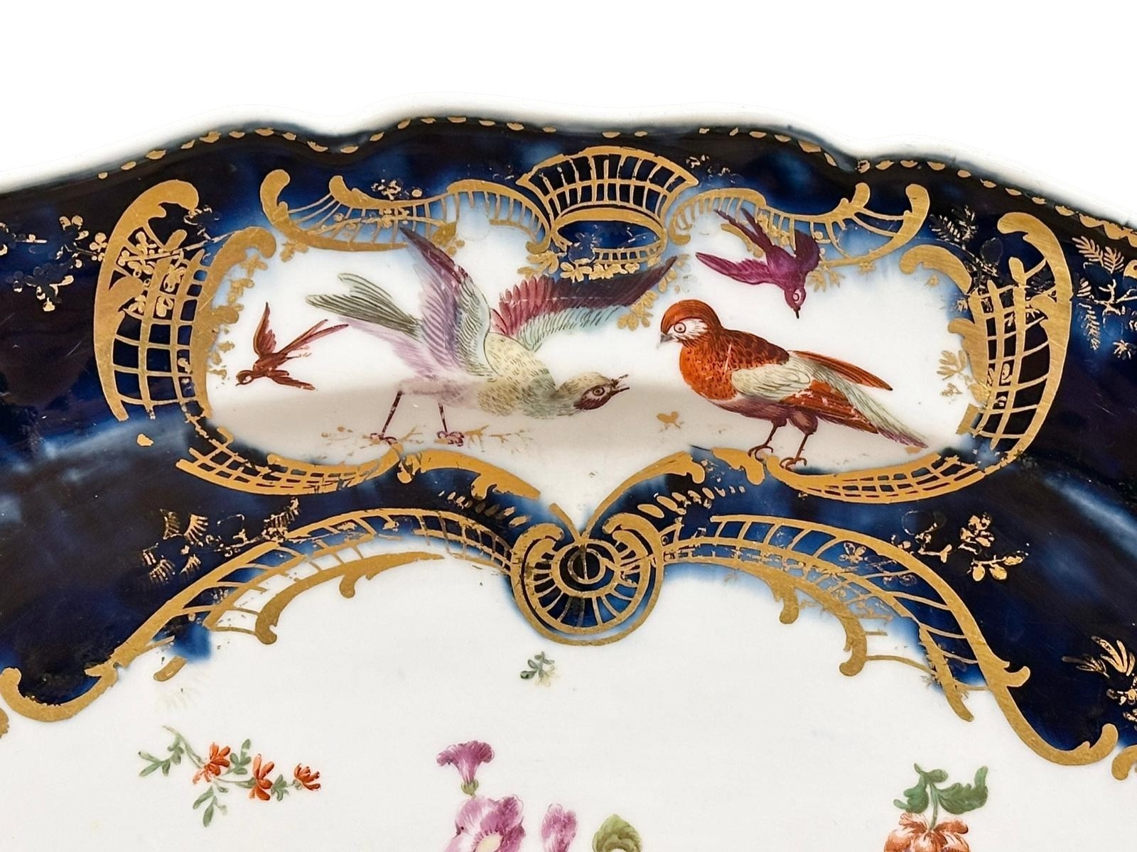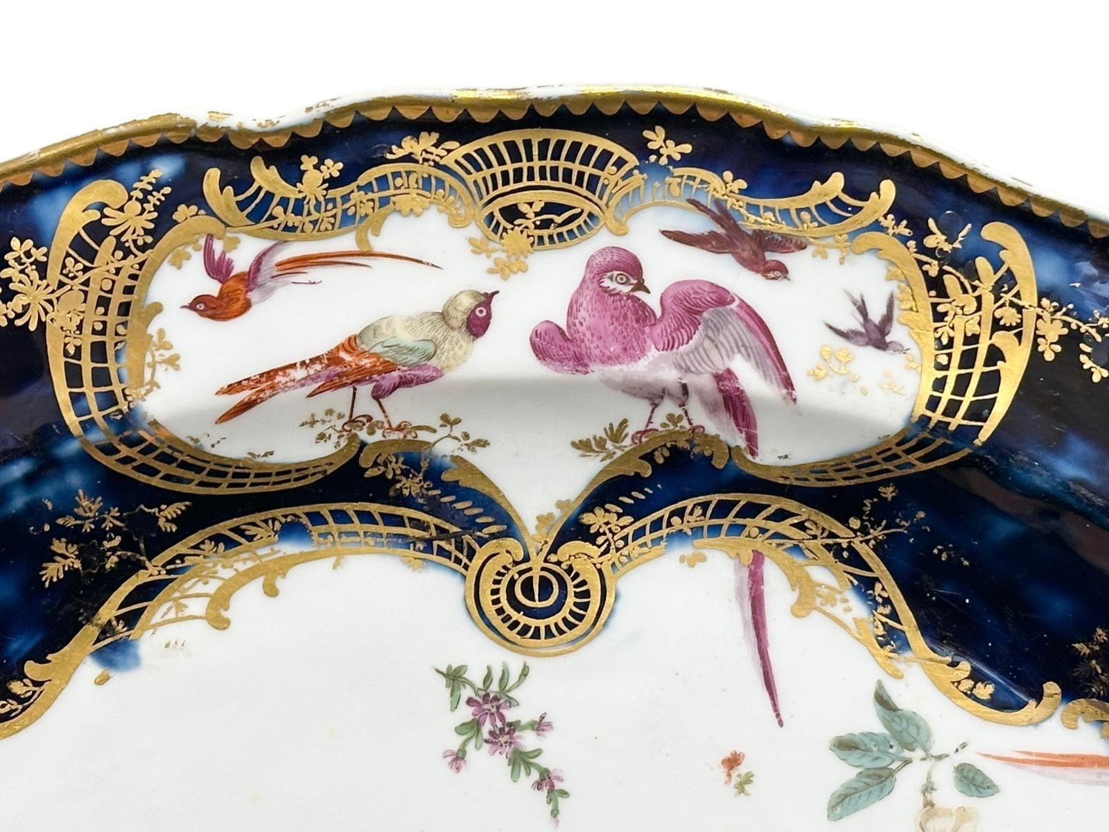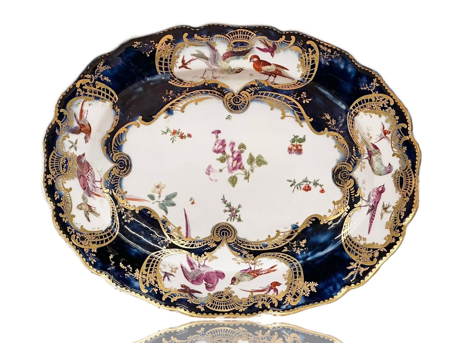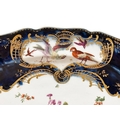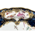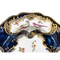 Chelsea, C.1760. A Mazarine Ground Platter. 18th Century. Gold Anchor Mark. A central white reserve and four large, cartouche-shaped white reserves on the wide, rococo-moulded border. Each with finely painted exotic birds in landscapes. Roderick Jellicoe label. 37x29.3cm.