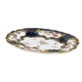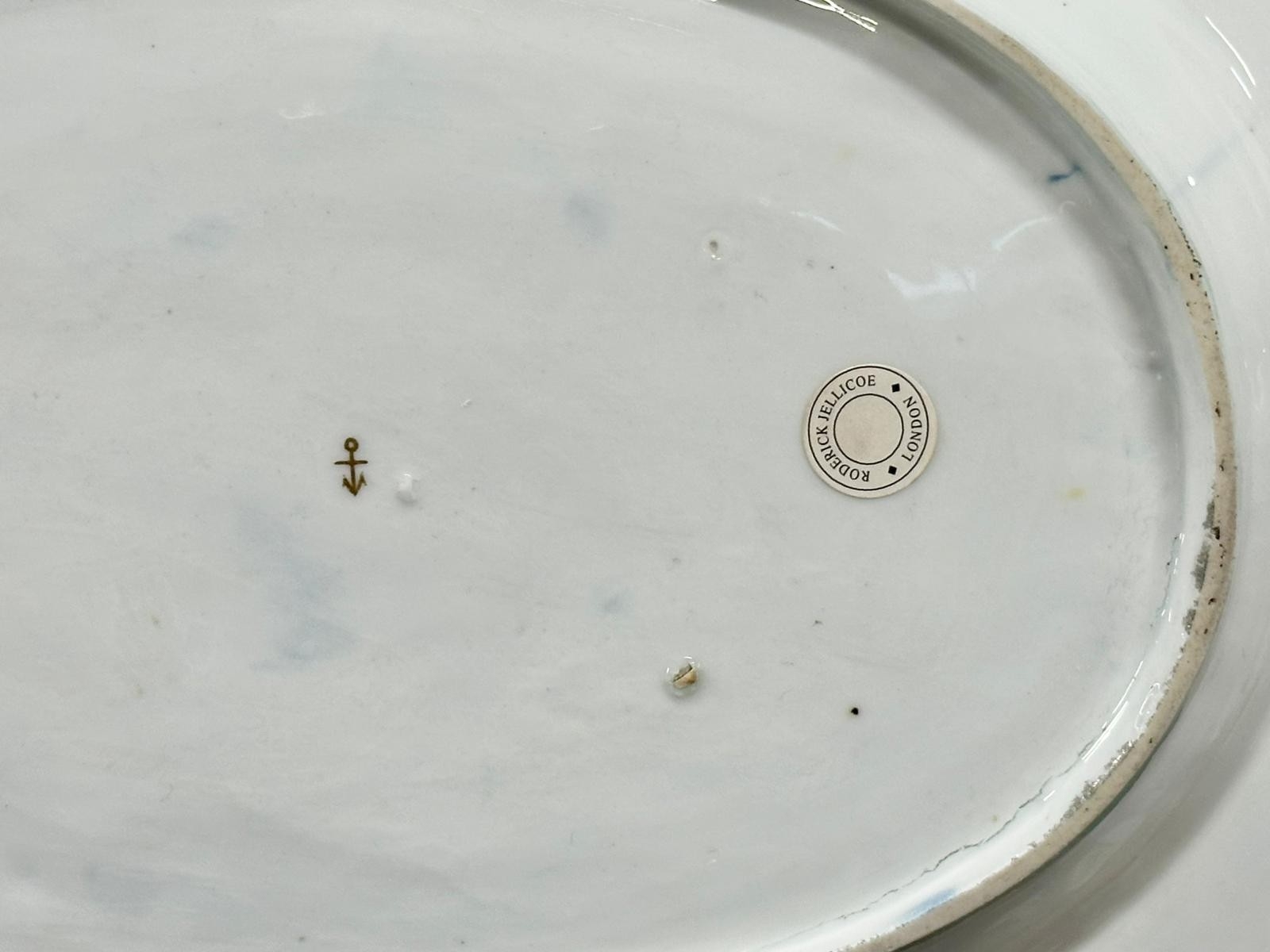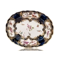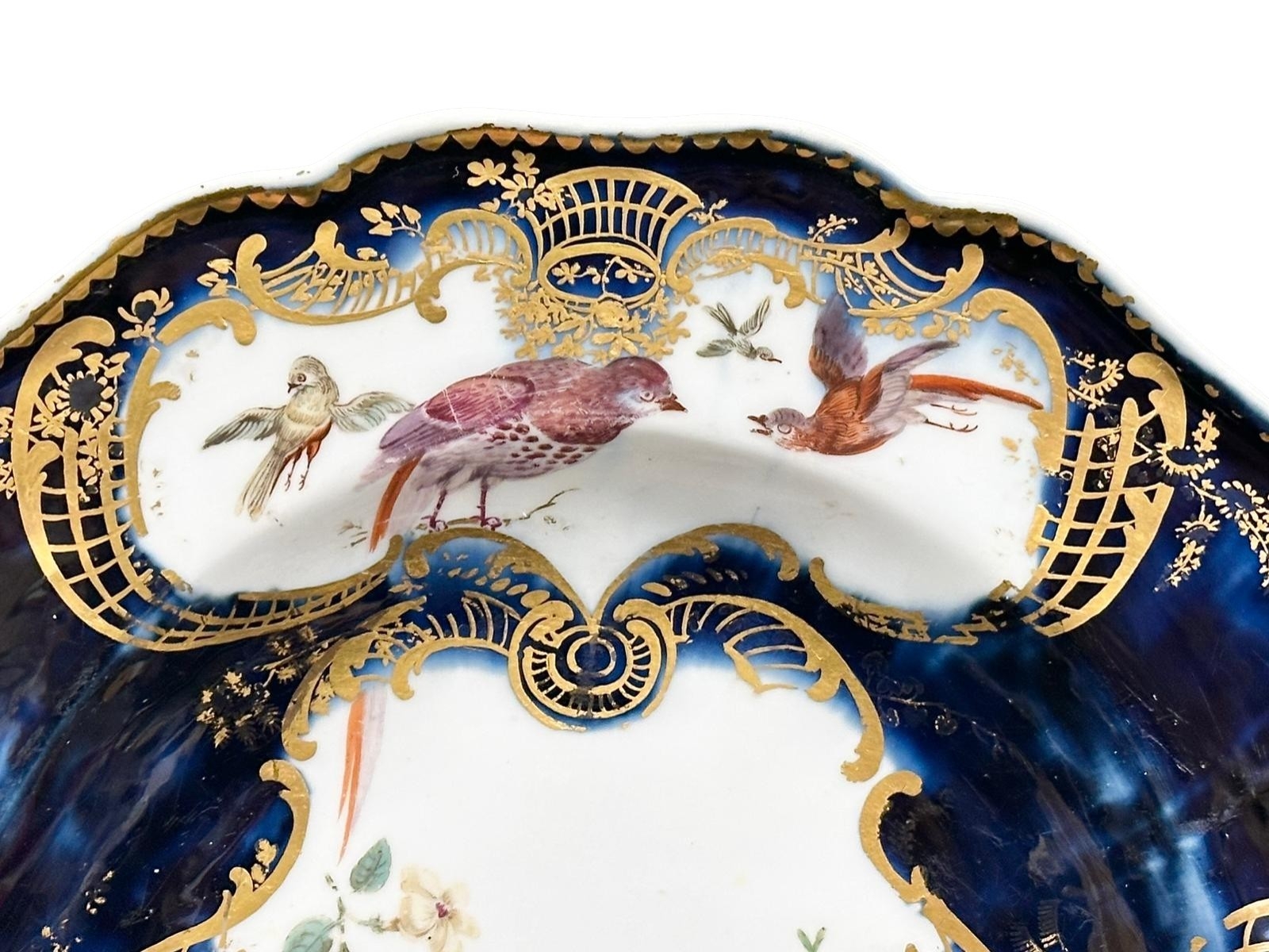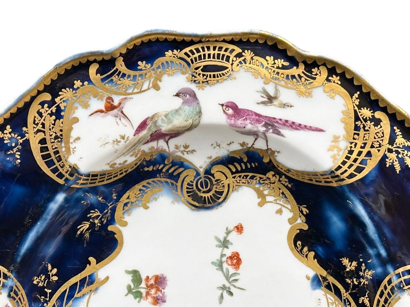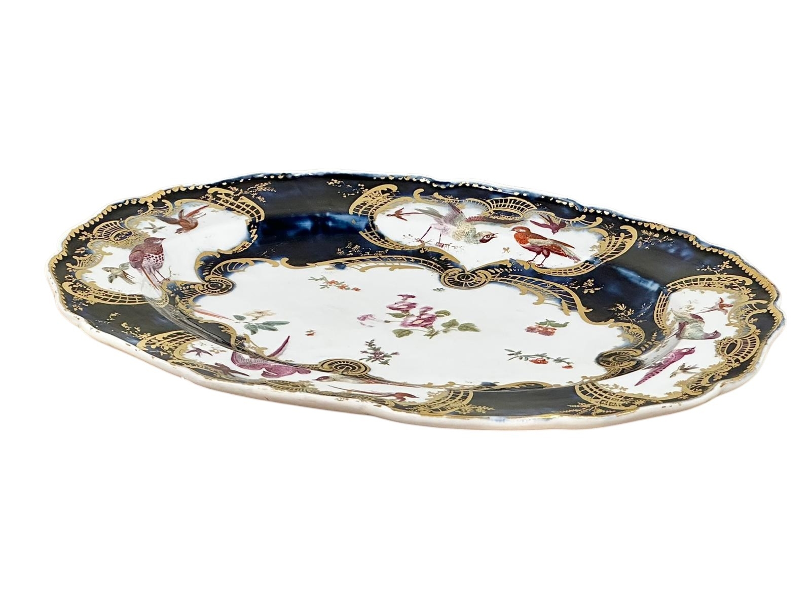 Chelsea, C.1760. A Mazarine Ground Platter. 18th Century. Gold Anchor Mark. A central white reserve and four large, cartouche-shaped white reserves on the wide, rococo-moulded border. Each with finely painted exotic birds in landscapes. Roderick Jellicoe label. 37x29.3cm.