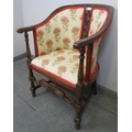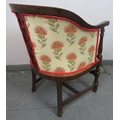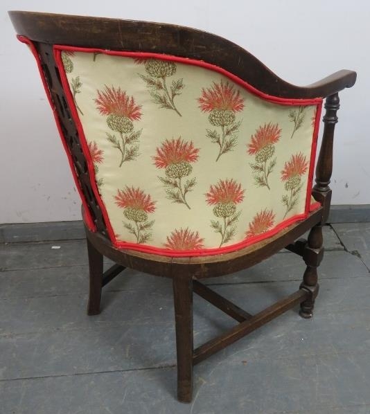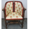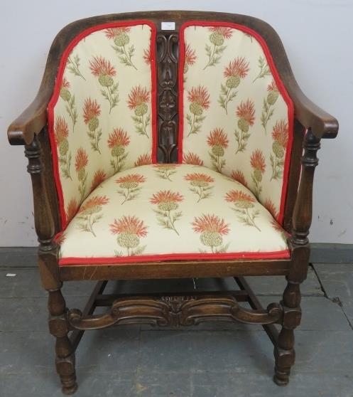 An antique mahogany Continental tub chair, with carved and pierced back and front stretcher featuring double Flemish scrolls, reupholstered in a cream material with thistle design, on turned and block supports with an ‘H’ stretcher. H85 W57 D60 (approx).