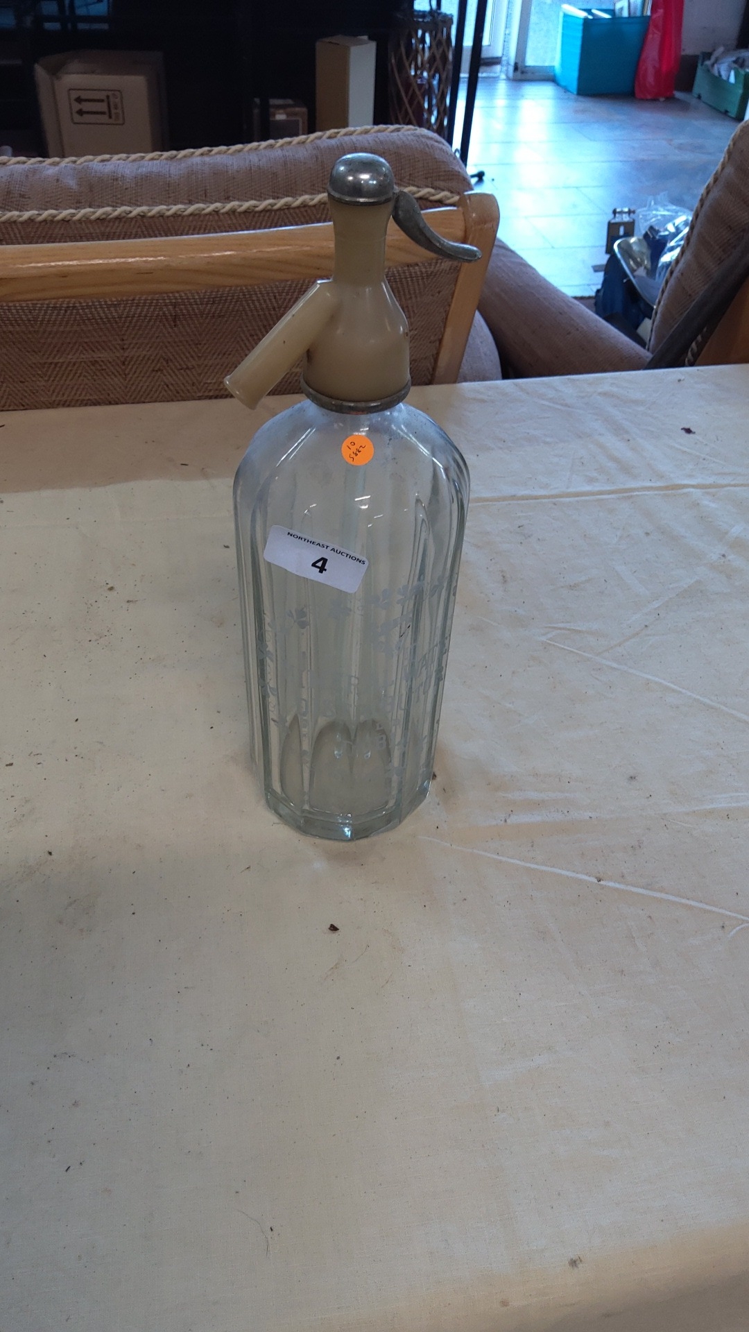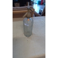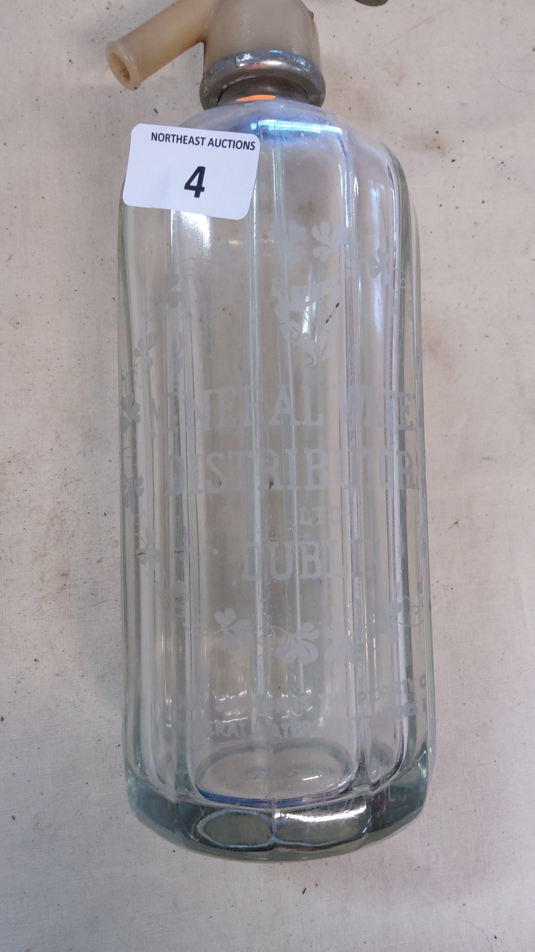 Irish etched glass soda siphon bottle, Mineral Water Distributors Ltd., Dublin; fluted cylindrical body with shamrock motif, cream Bakelite and chrome-plated dispenser head.