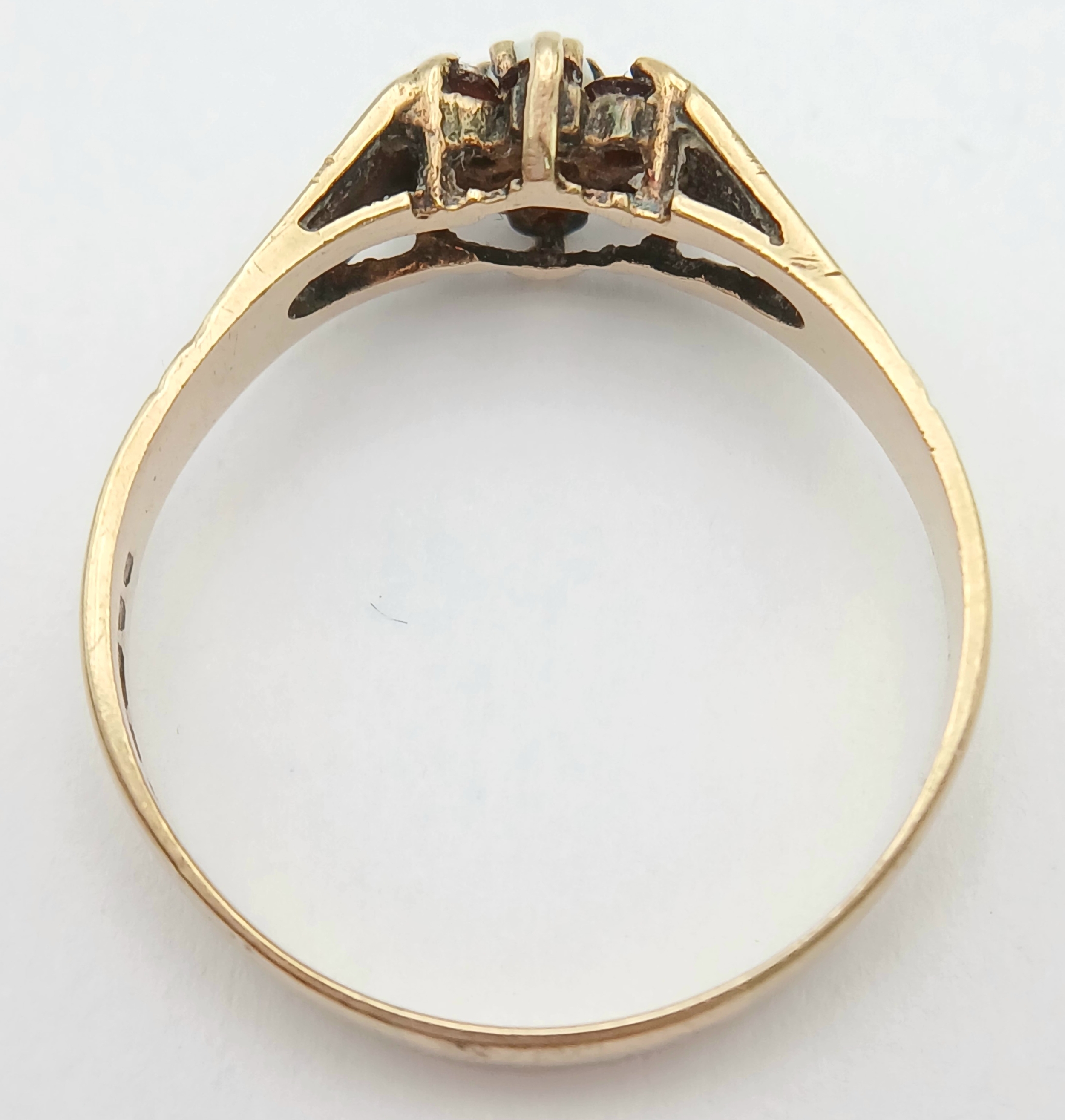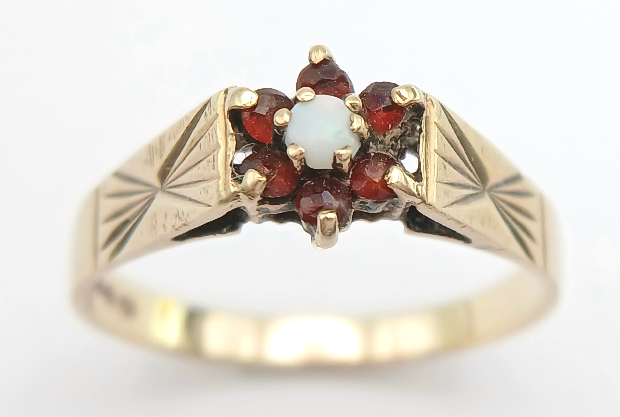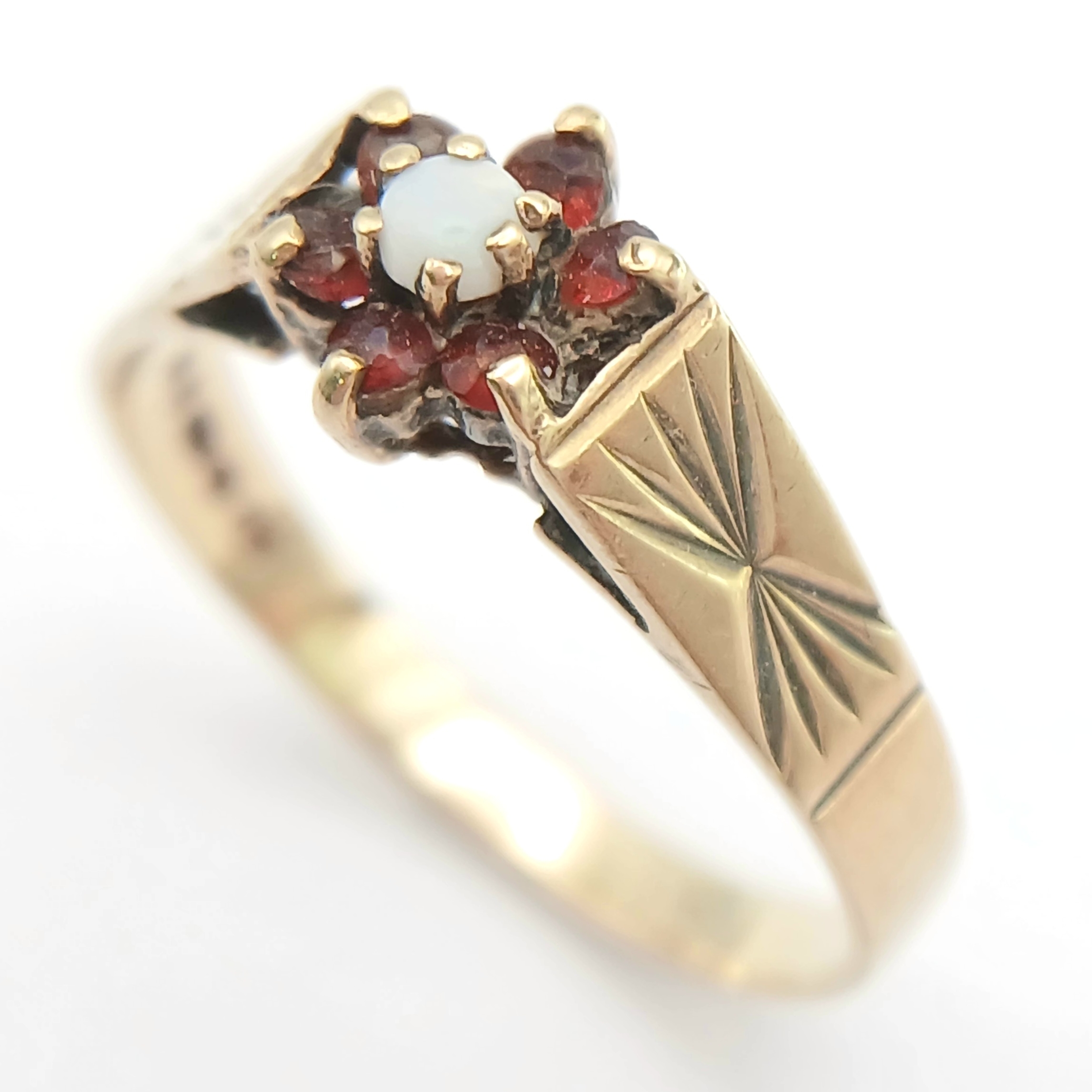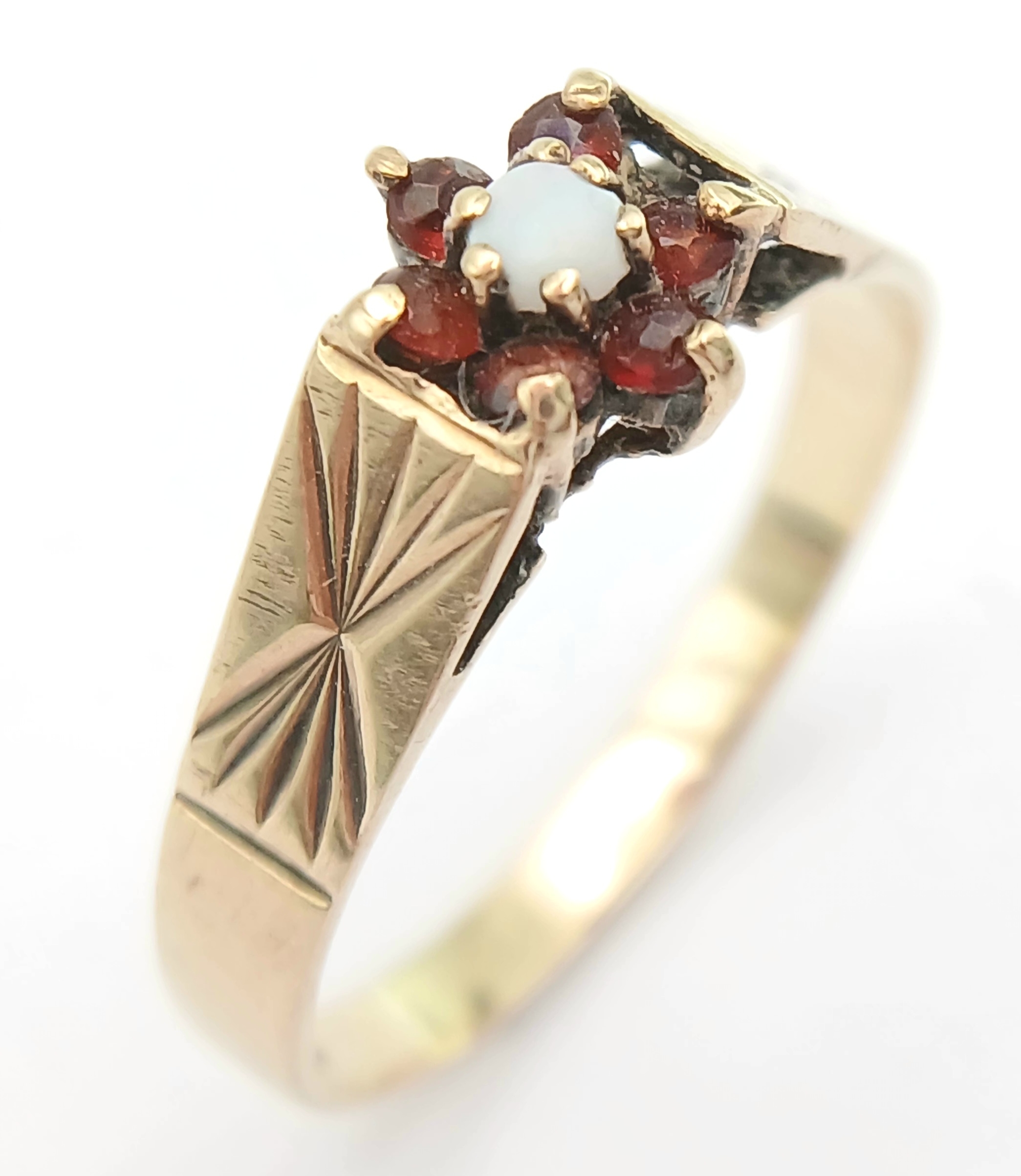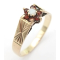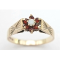 A Hallmarked 1981 Vintage 9K Gold Opal and Garnet Set Ring Size R. The ring measures 8mm Wide at the crown and has a gross weight of 2.01 Grams.