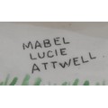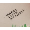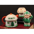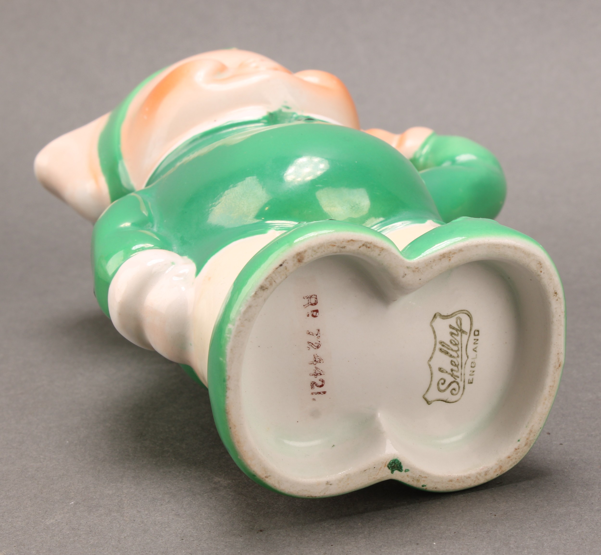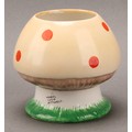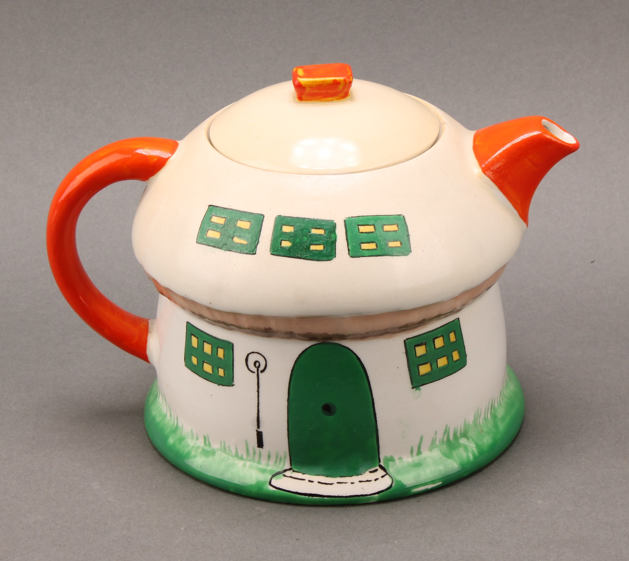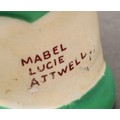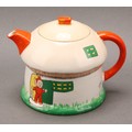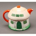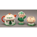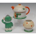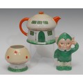 A Shelley Mabel Lucie Attwell Nursery Boo-Boo three piece tea service, comprising toadstool house teapot, toadstool sugar basin and pixie cream jug, 15cm high, printed marks, registration no.724421 (3)