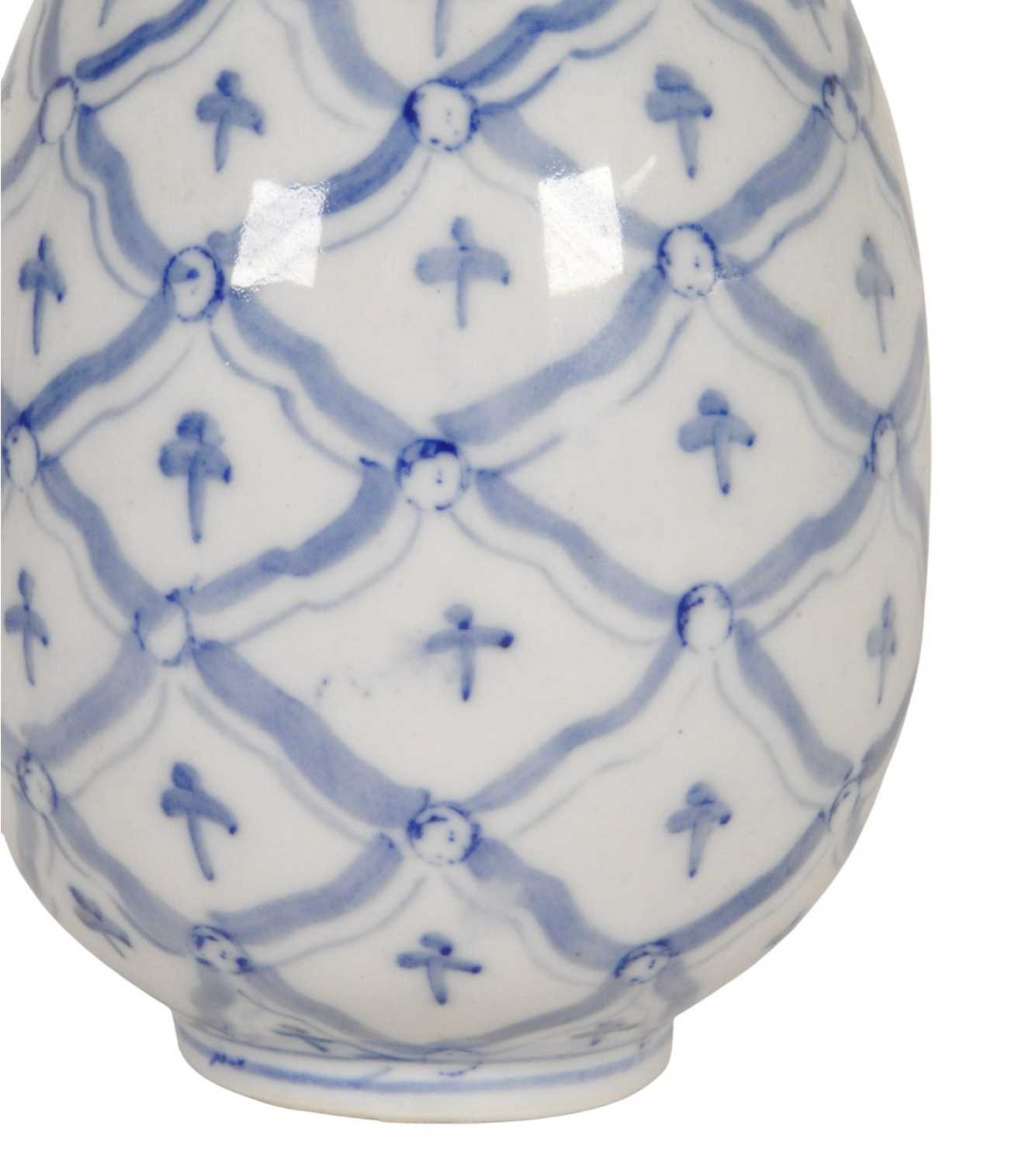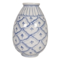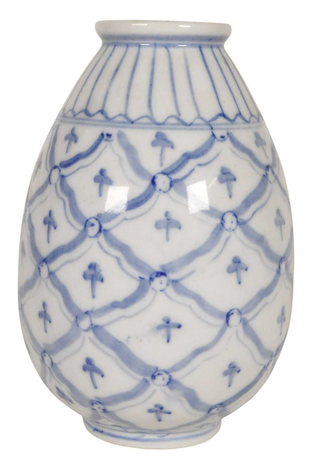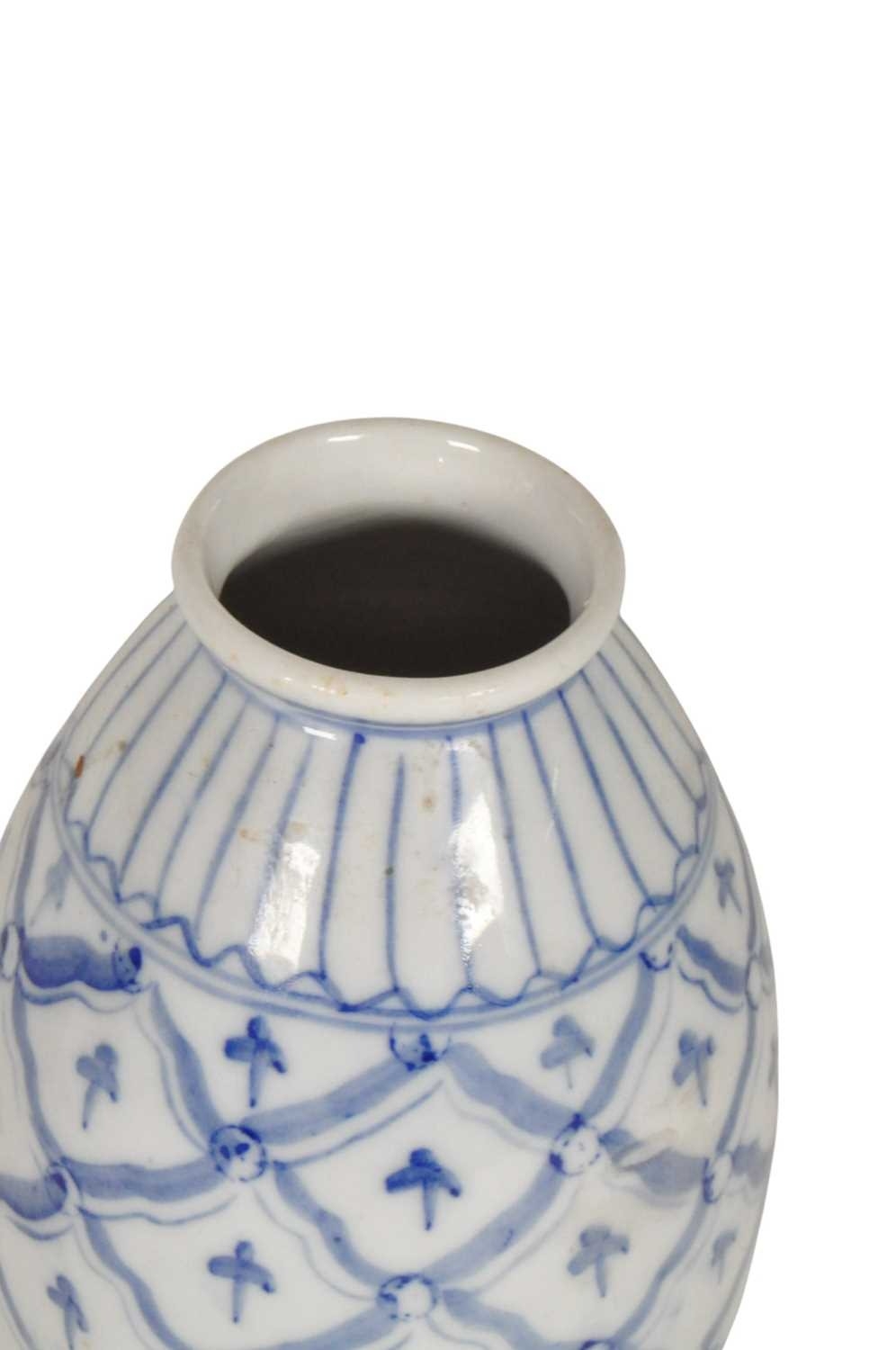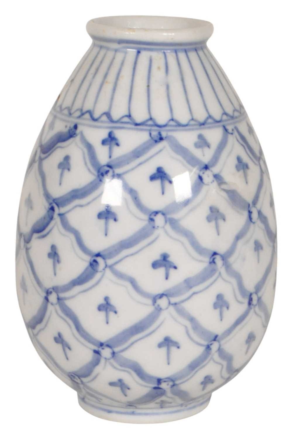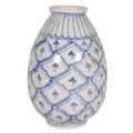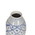A 19th century blue & white Chinese porcelain fish scale design vase. Featuring the blue design with banner decoration, with the fish scale design and geometric style to top in tapering the body with a lipped top. No maker's mark to underside.
