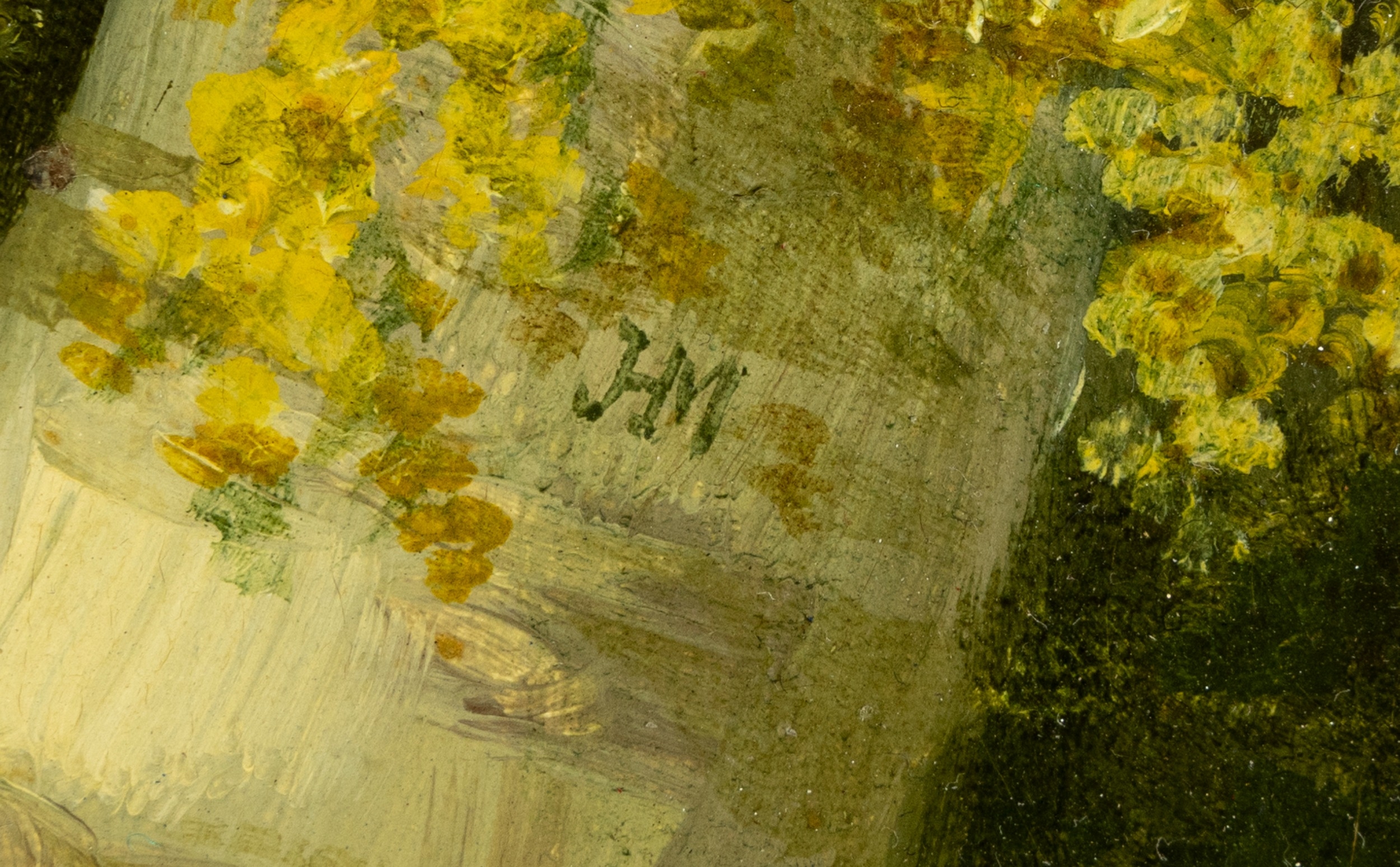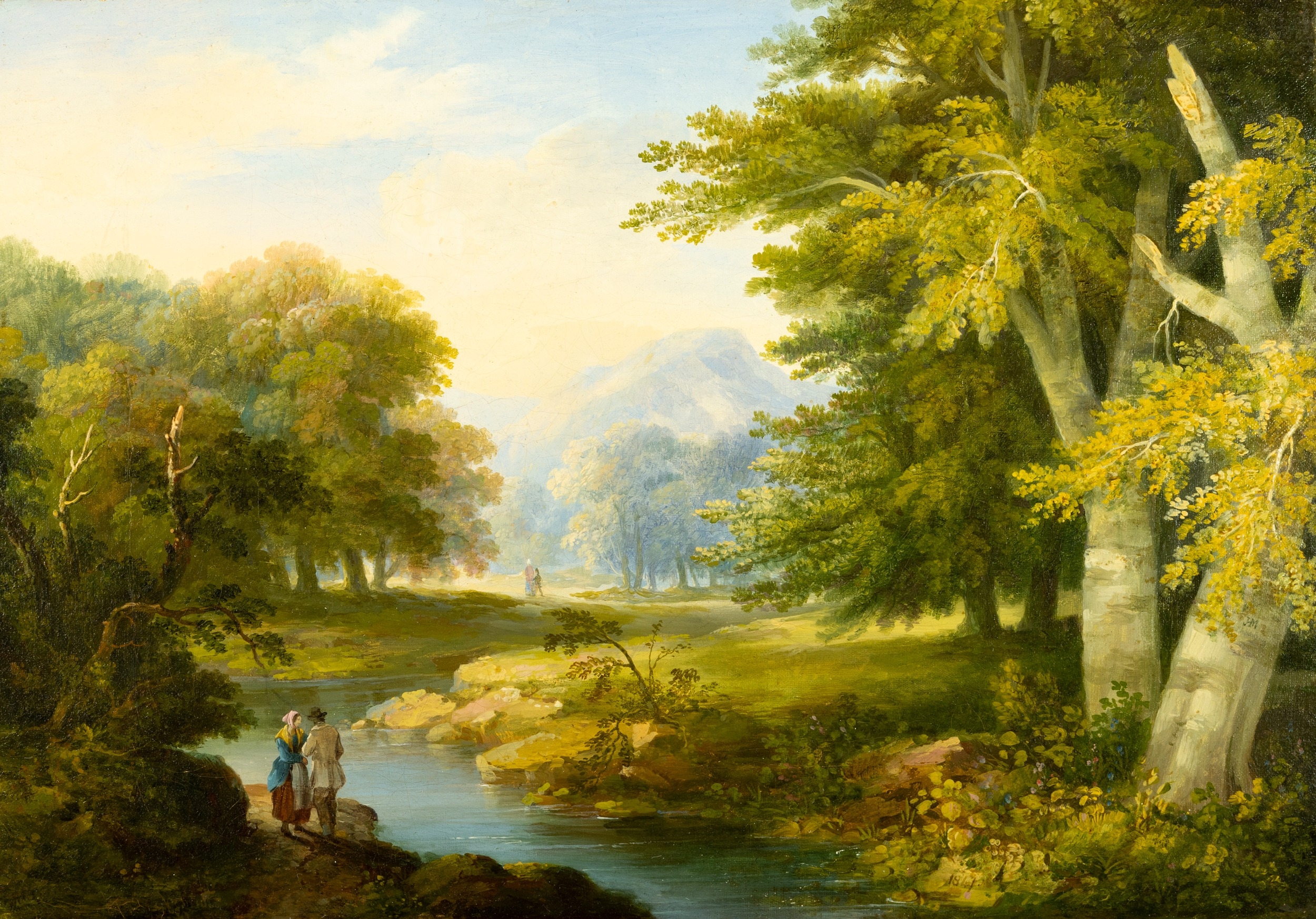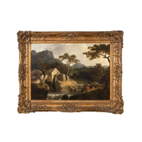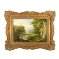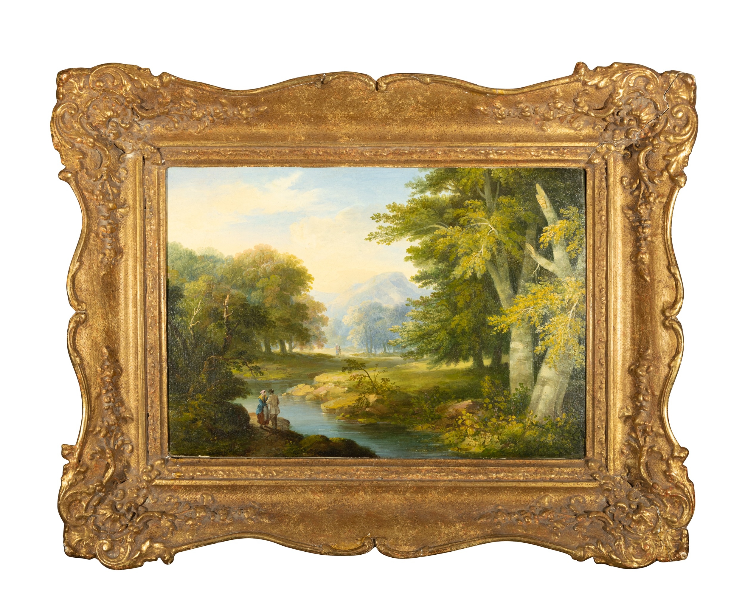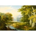 JERMIAH HODGEES MULCAHY RHA (1804-1889) Animated River Landscape, Mountains Beyond Signed on the tree with artist’s monogram and dated 1847 Oil on canvas, 28 x 41cm