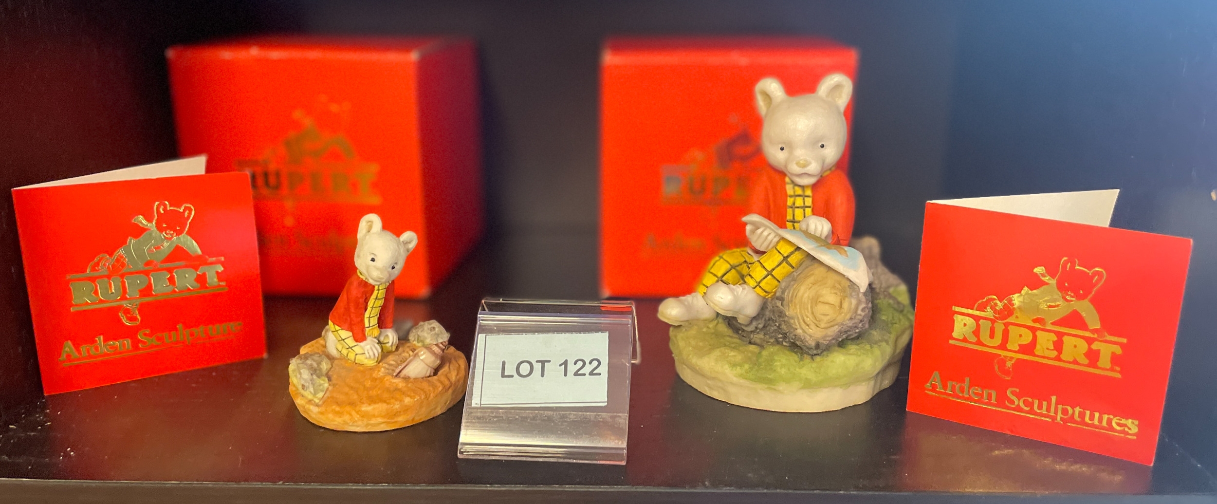 Two Rupert the Bear Arden Sculptures with original box and artist signed card "Rupert Explores" R002 & "Rupert Studies Map" R204
