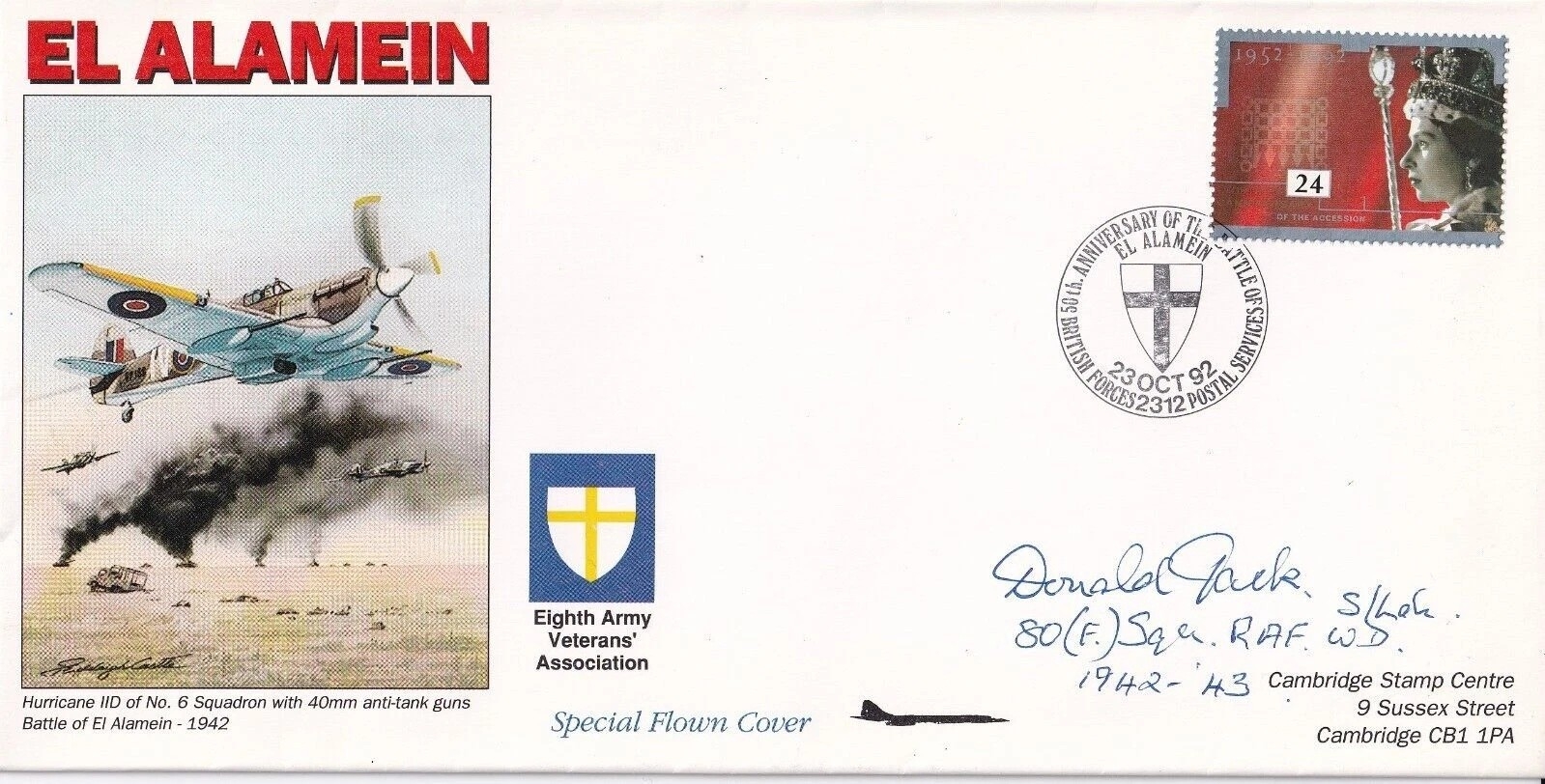 WW2 Rare Battle of Britain pilot Sqn Ldr D Jack signed RAF cover El Alamein50th Anniv Battle of El Alamein Signed by D Jack Battle of Britain, Desert Pilot. 23 Oct 92 BFPS 2312 50th Anniversary of the Battle of El Alamein. Special Picture Cachet of Hurricane 11D of No 6 Sqn Battle of El Alamein. 3 Backstamps Blue Flown Concorde, Blue Boxed Cachet Flown Luxor - Cairo British Airways Concorde G - BOAG Flight Time 41 Mins. Max Speed Mach 0. 94 Captain Ian MacNeely. Personally Signed by Donald Jack 602 Sqn fighter pilot Battle of Britain and 80(f) Sqn RAF WD ( Western Desert) 1942 - 43. Certified Copy no 37 of 49 . Single Vendor RAF cover collection. Good condition. All autographs come with a Certificate of Authenticity. We combine postage on multiple winning lots and can ship worldwide. UK postage from £5.99, EU from £7.99, Rest of World from £9.99