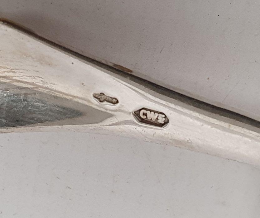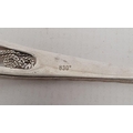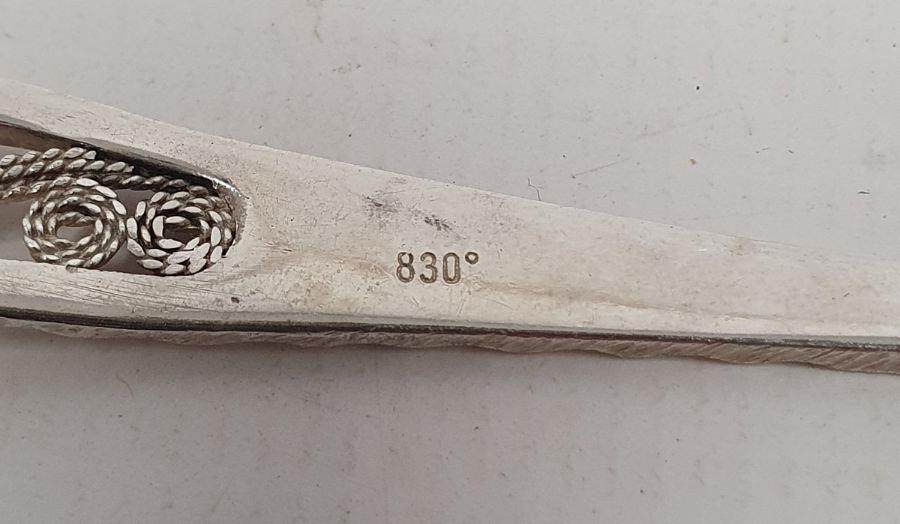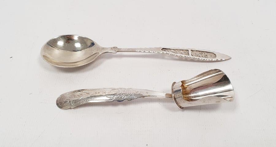 Foreign silver spoon with filigree decorated handle marked '830', 0.5ozt and a silver scoop engraved decoration, marked '835CW'(?), 0.4ozt (2)