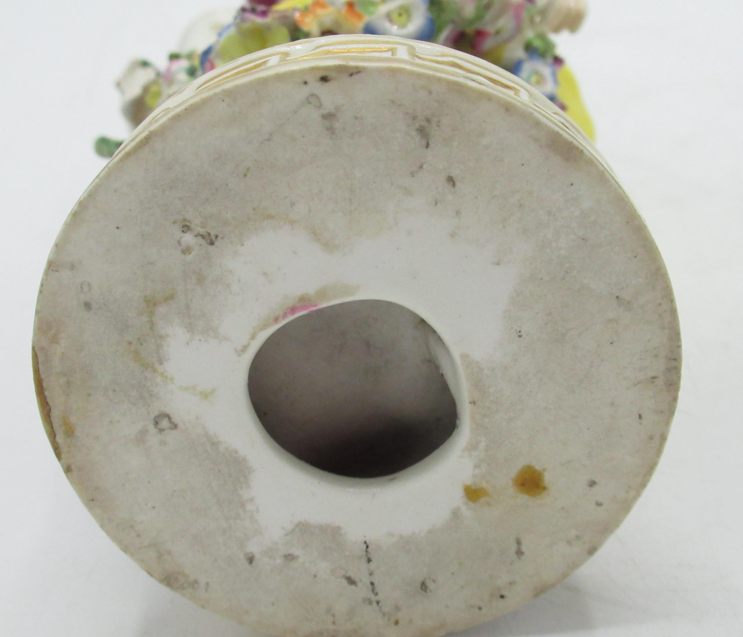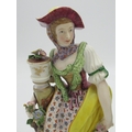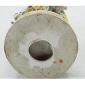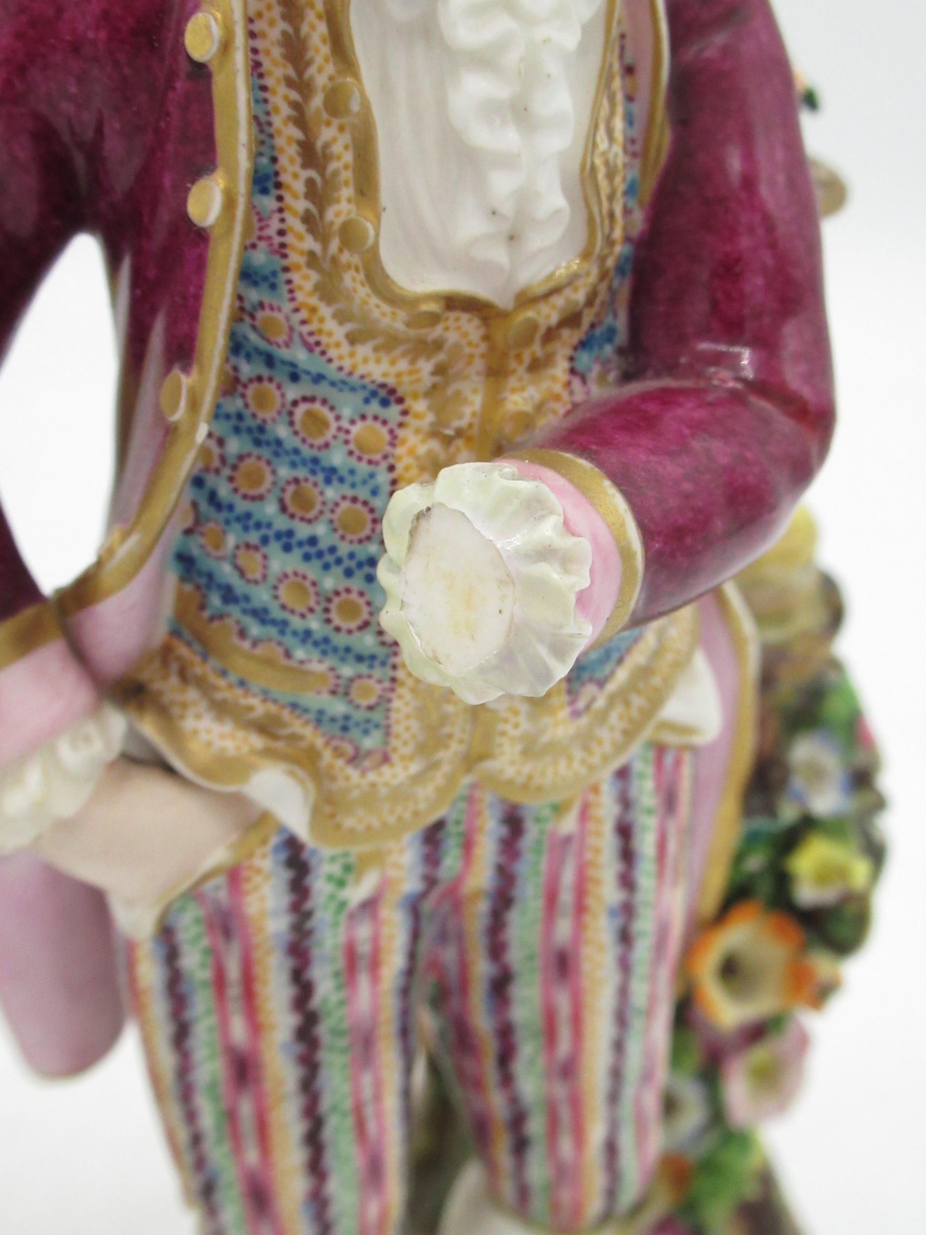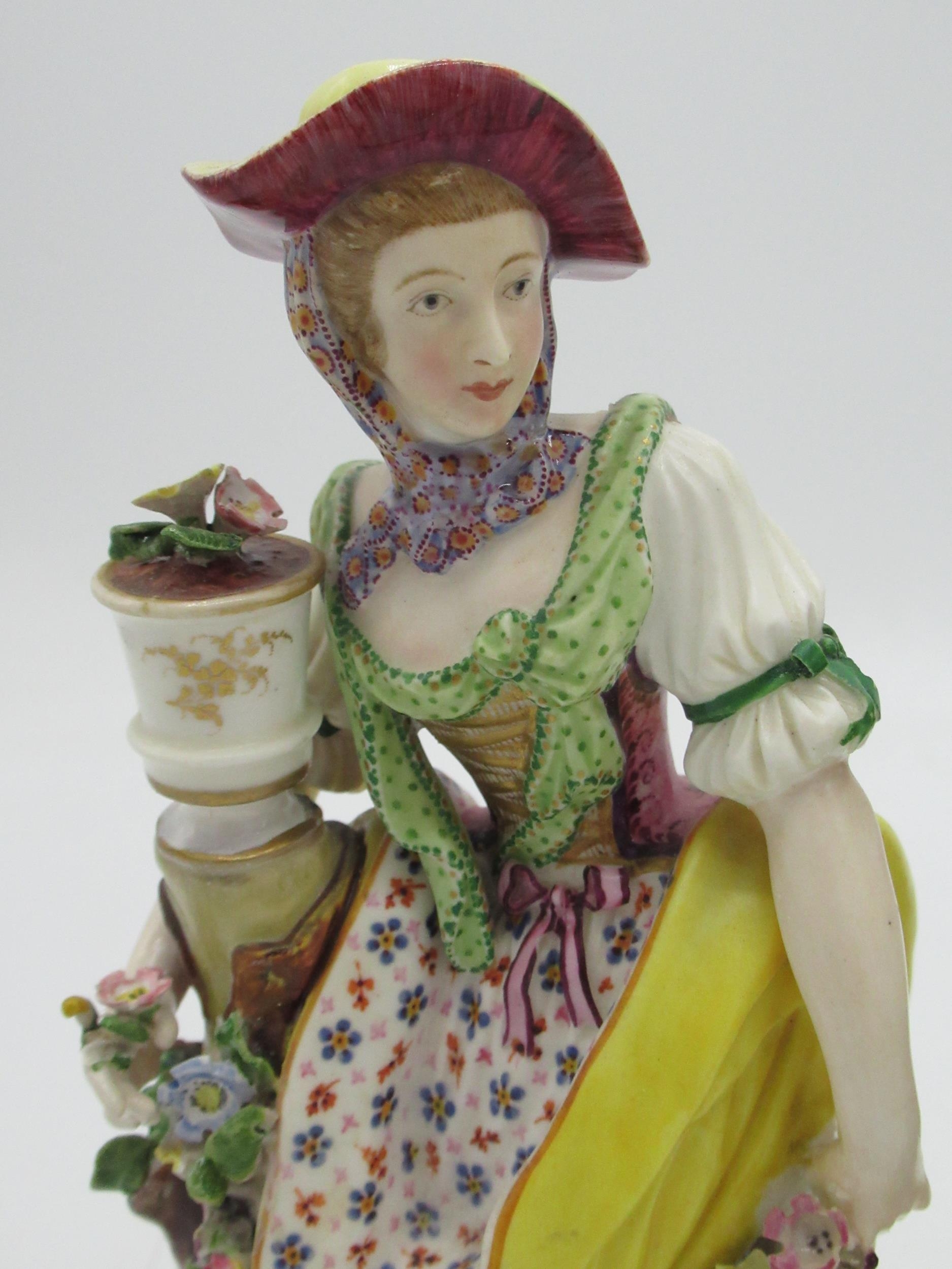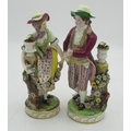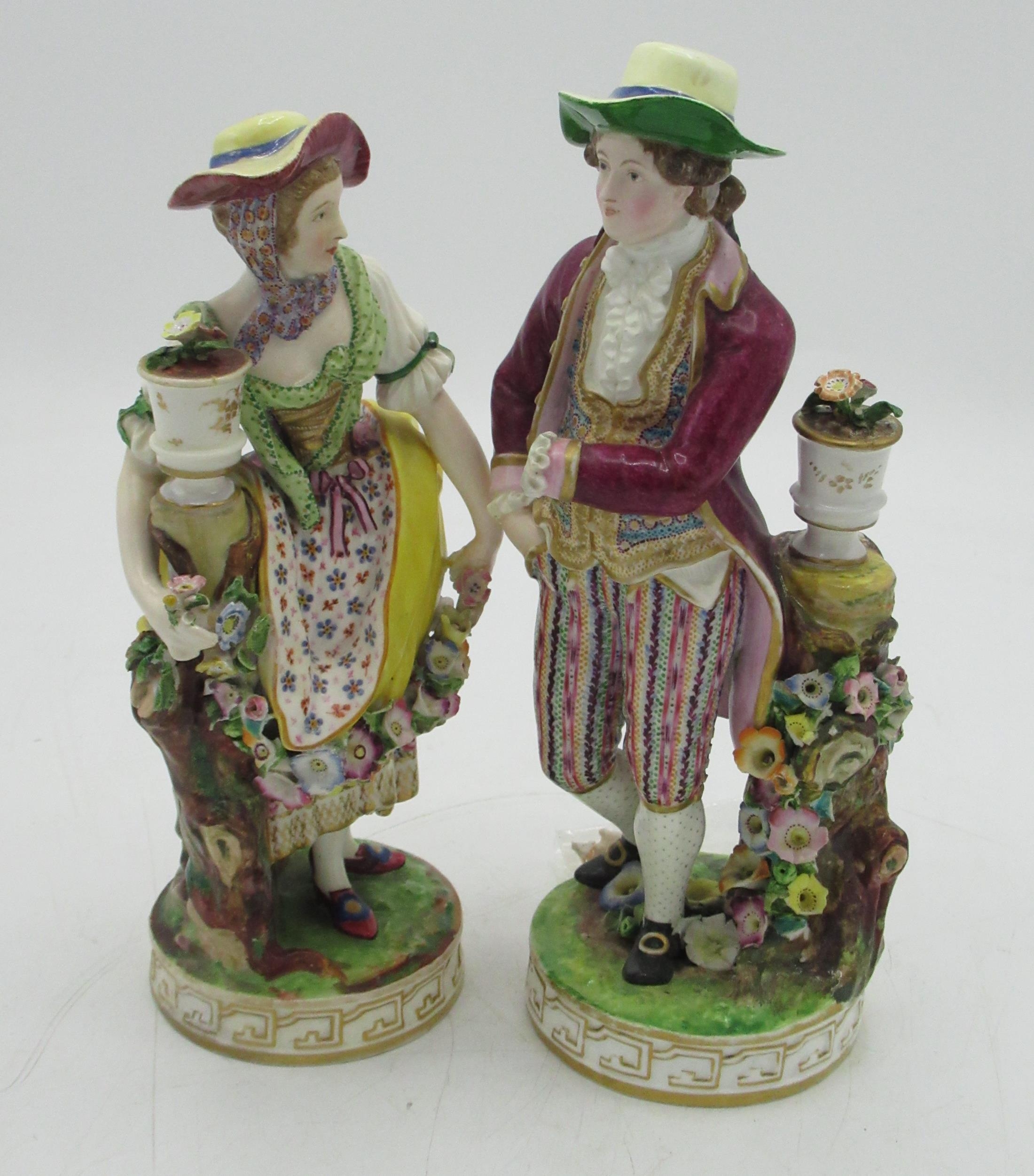 Pair of C19th Continental porcelain models of lady and gentleman gardeners, both in C18th dress with flower garlands standing by flower filled vase on a tree stump, on circular gilt bases, H18.5cm (2)