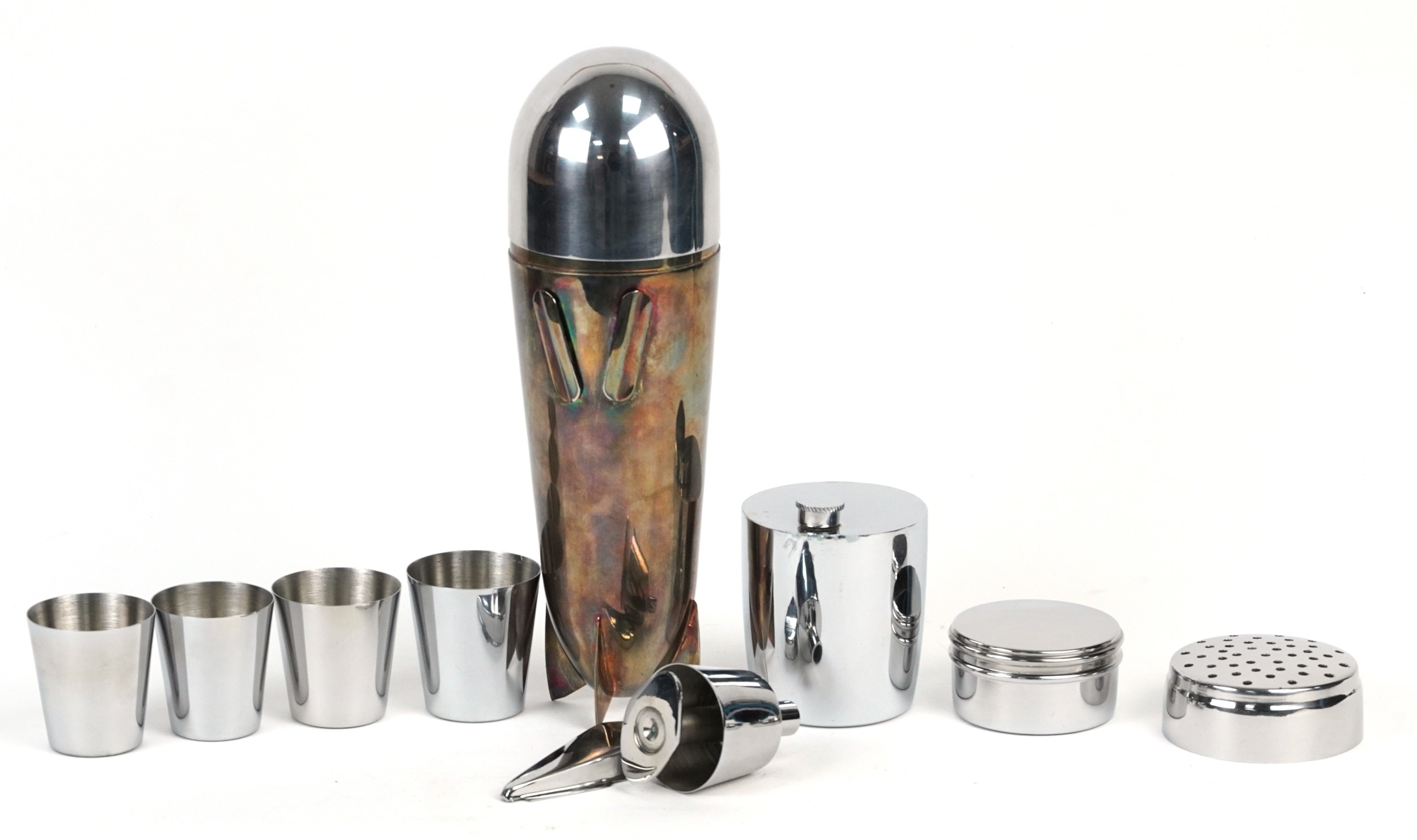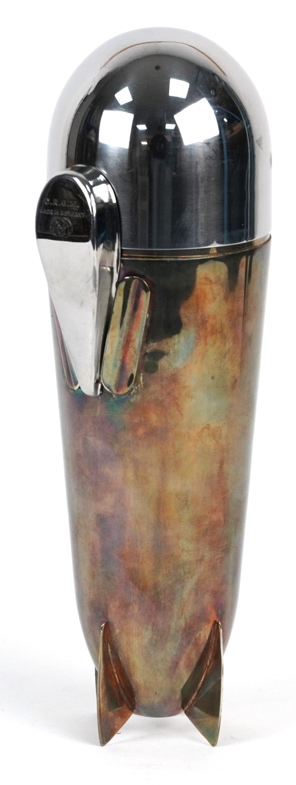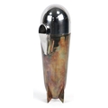 A silver plated and brass cocktail shaker in the form of a zeppelin, 24cm high.