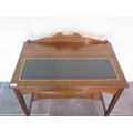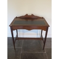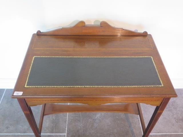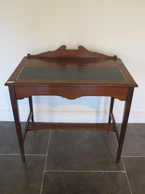A nice Edwardian writing desk with boxwood and stringing inlay, tapered legs with brass castors, leathered tooled insert top, 81cm tall x 77cm x 49cm, in good condition