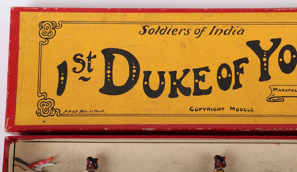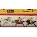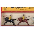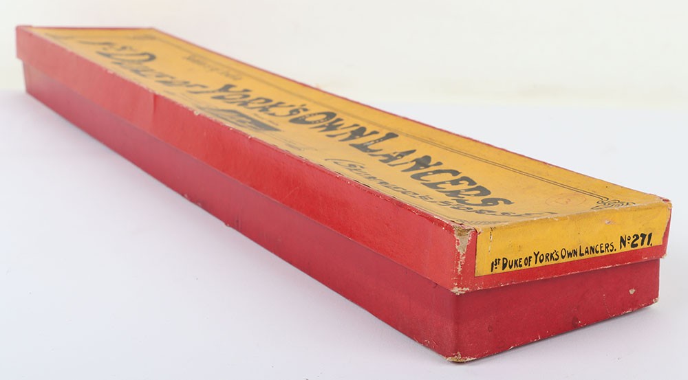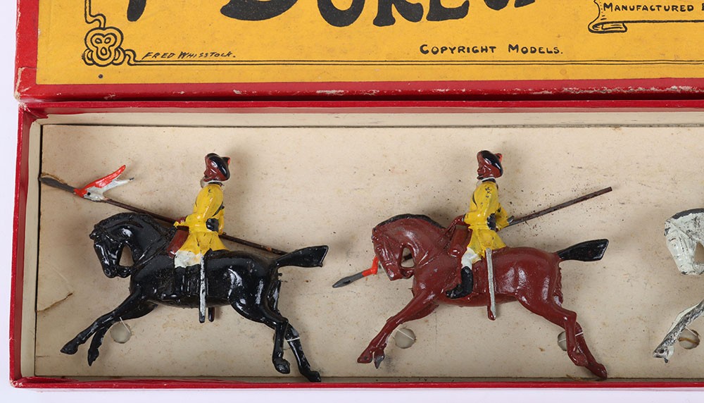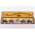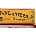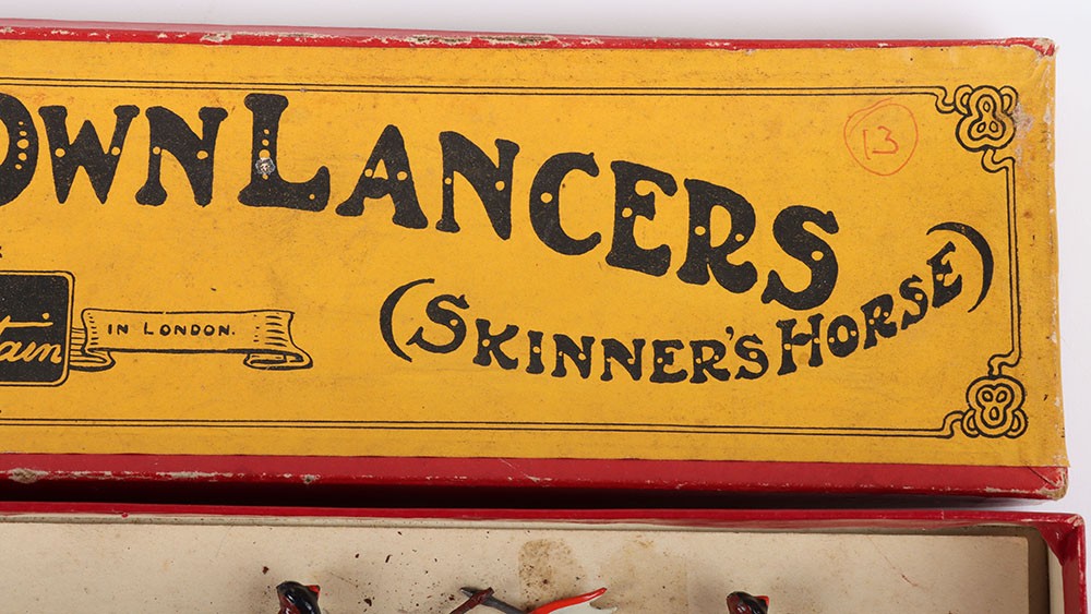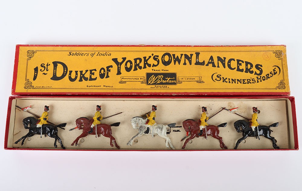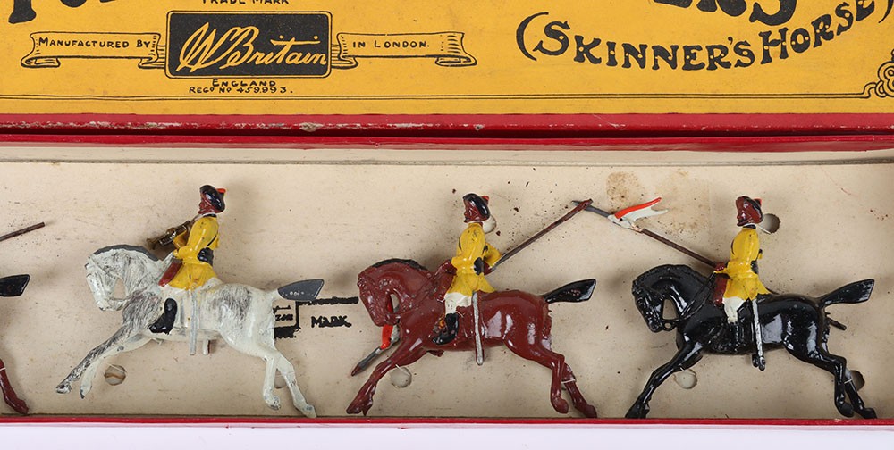 Britains boxed set 271, 1st Duke of York’s Own Lancers (Skinner’s Horse), circa 1930, four mounted cavalrymen and trumpeter on cantering horses, (condition: excellent) in Whisstock box, figures tied to backing card, (condition: good), ex Phillips 26.10.1990 lot 40, (5).