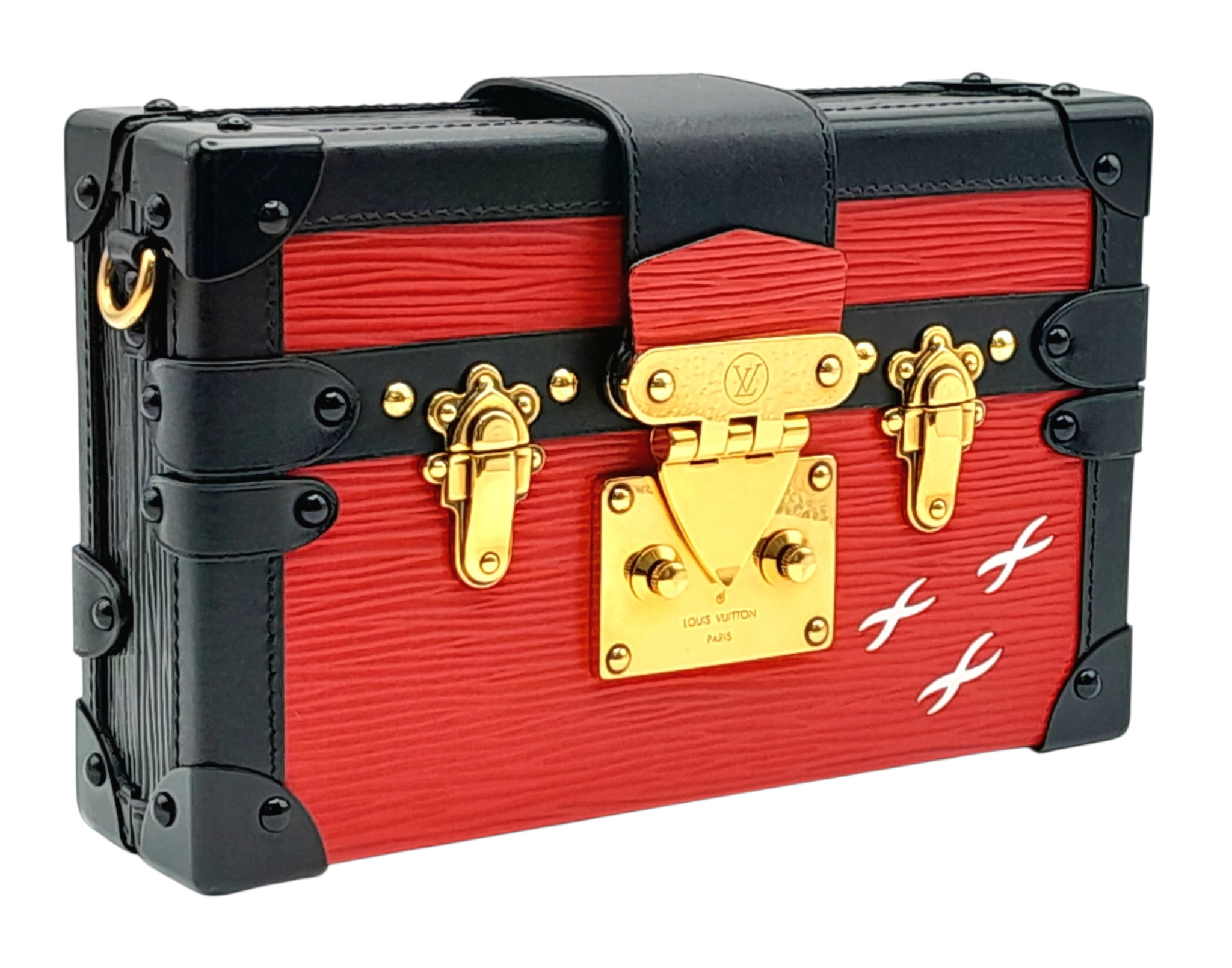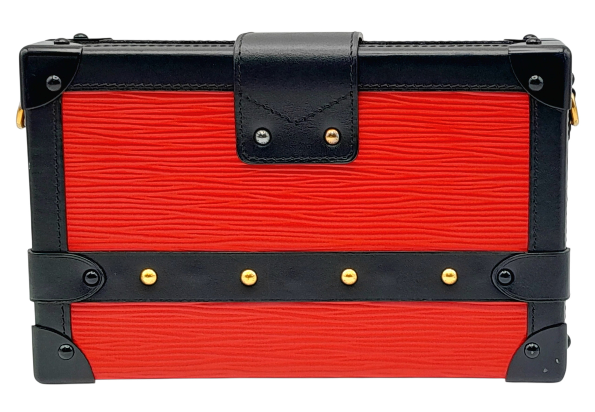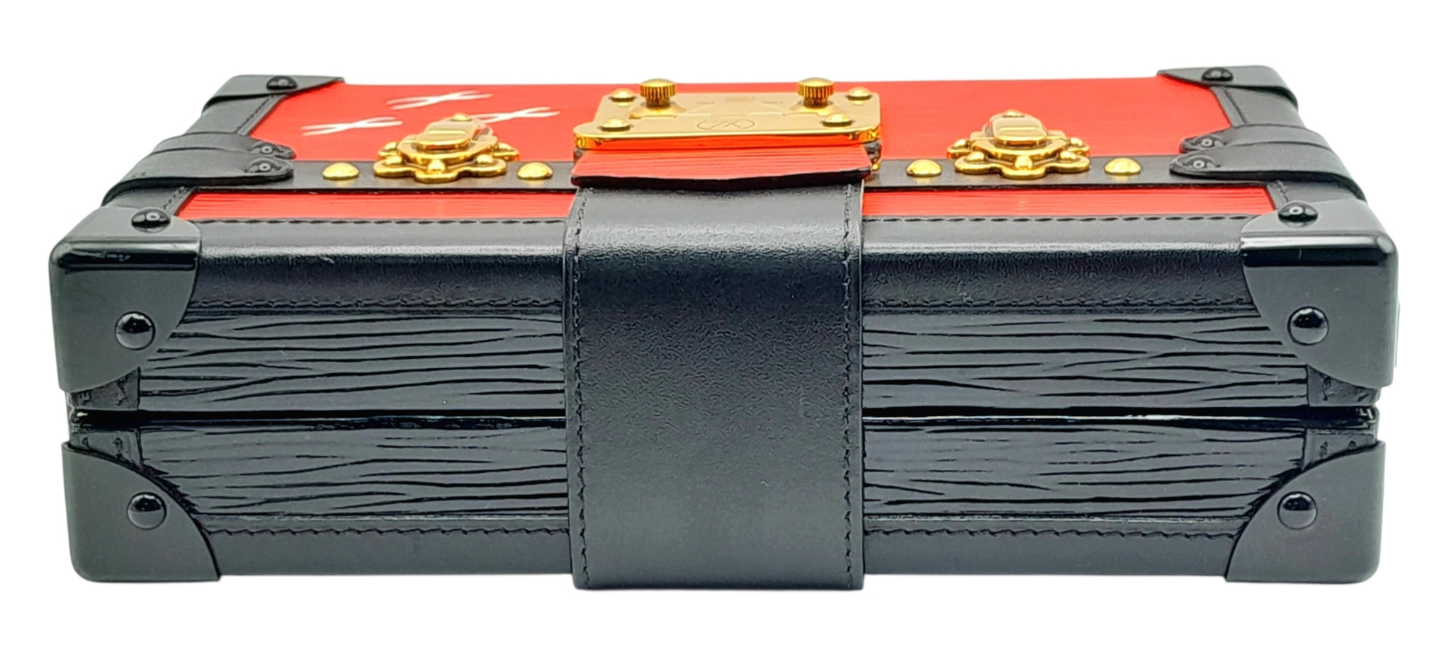 A Louis Vuitton Red and Black Petite Malle Clutch/Crossbody Bag. Epi leather and leather exterior with black and gold-toned hardware, and squeeze lock closure. Beige leather interior with a small open pocket. Comes with dust cover and detachable adjustable strap. Approximately 19cm length x 12cm height. Some light scuffs to corners and interior, otherwise in good condition overall - please see photos or request a condition report. Ref: 10225
