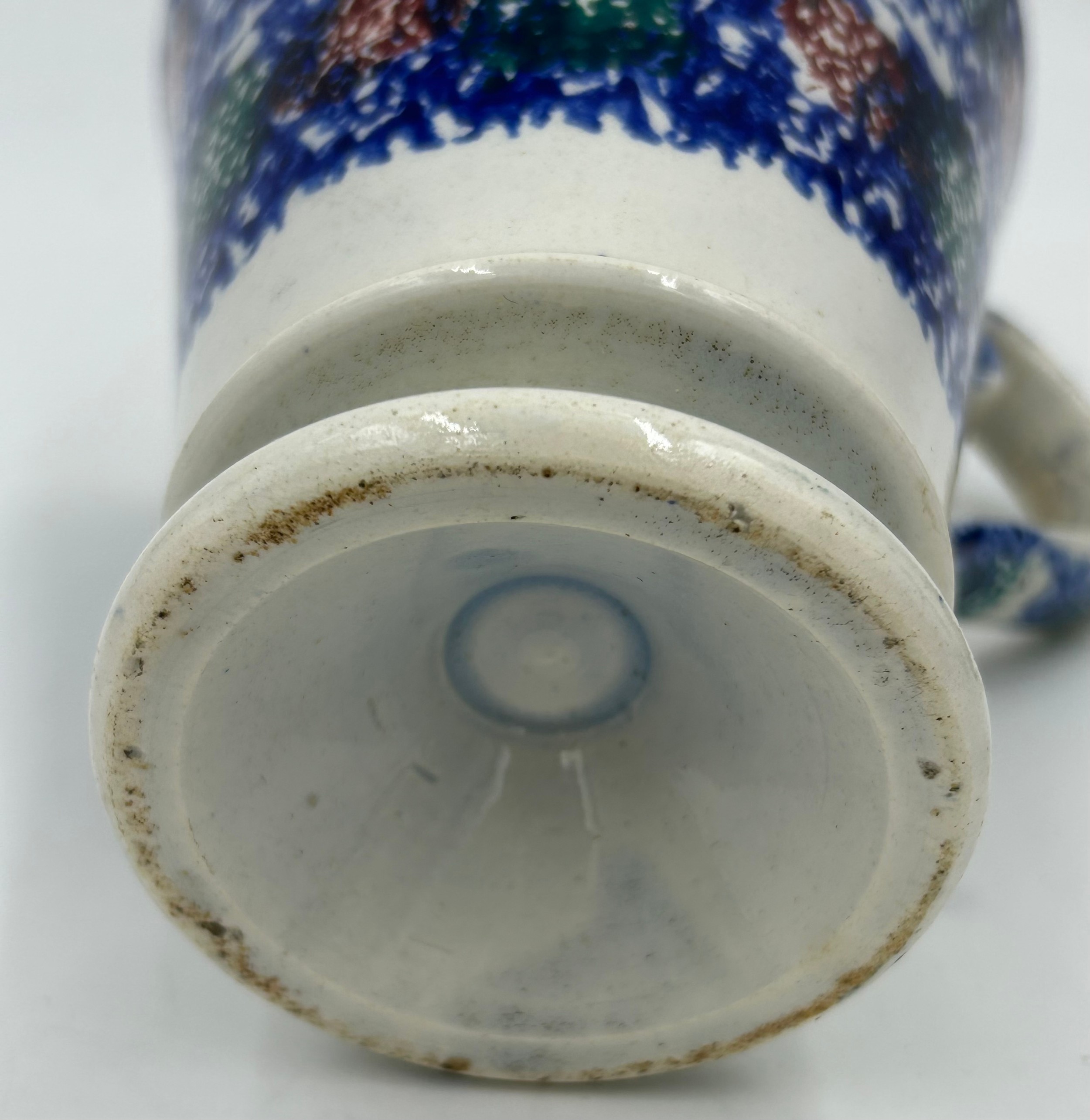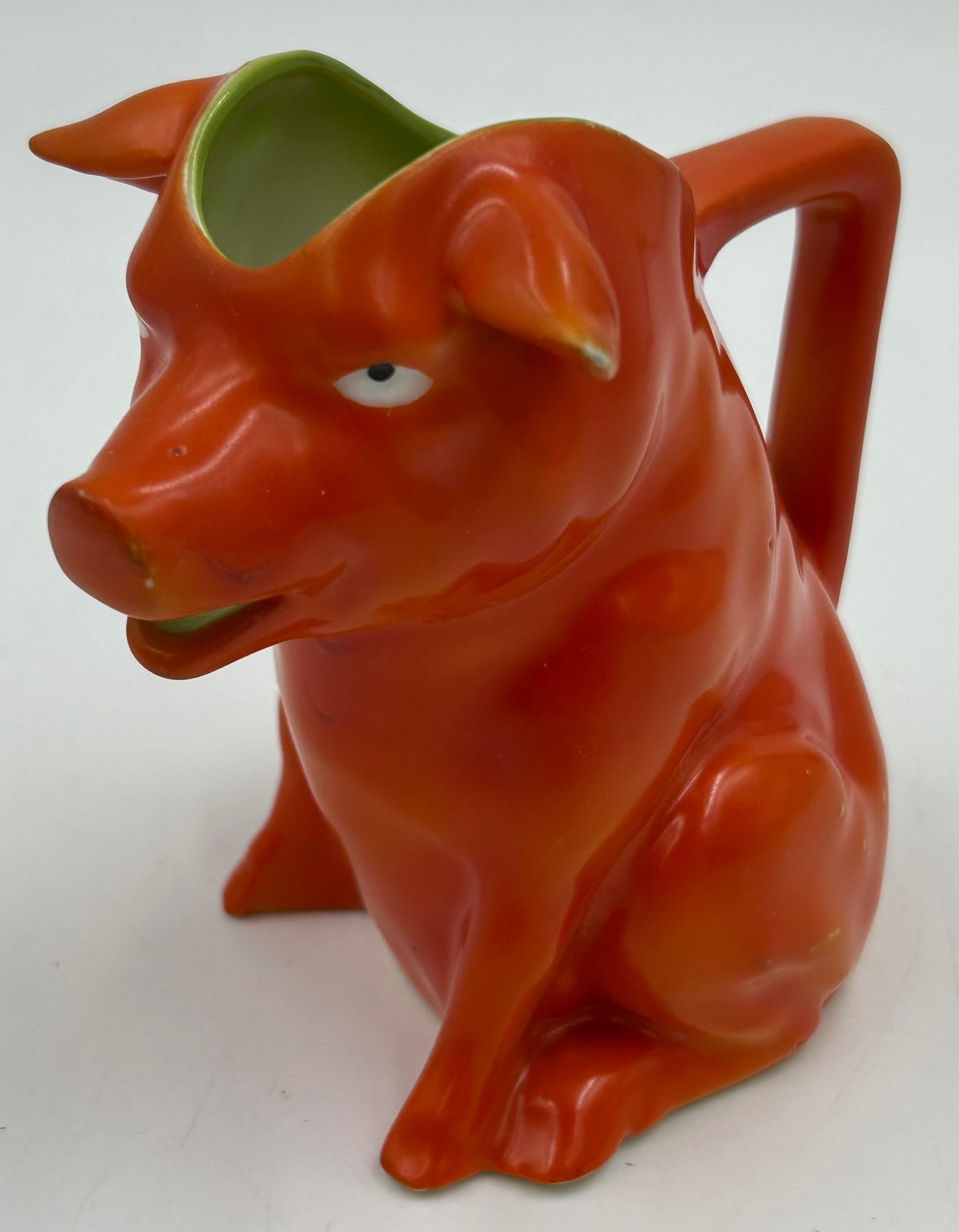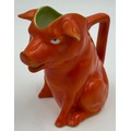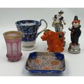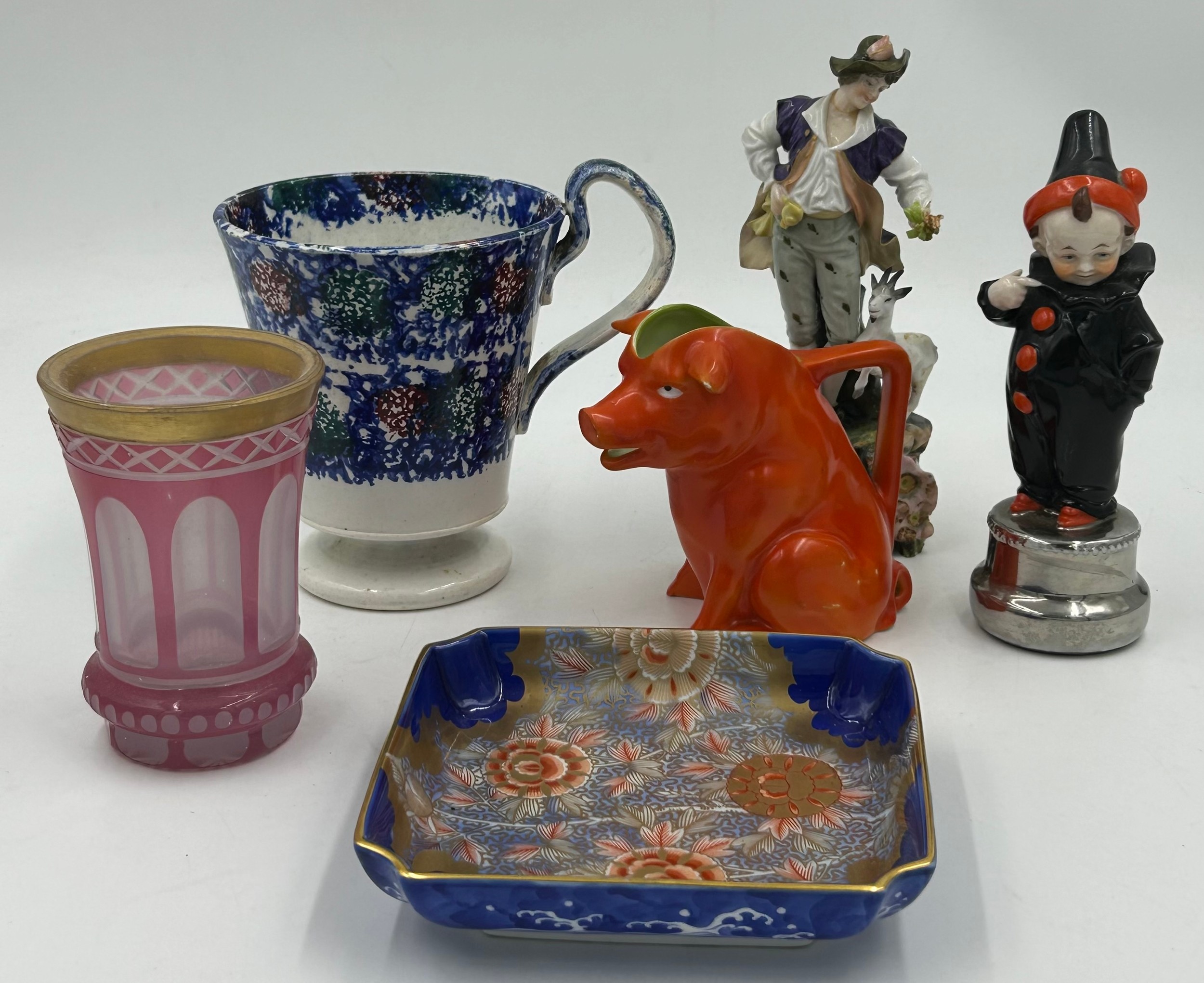 A selection of continental ceramics to include a Royal Bayreuth pig creamer, cranberry opaline glass vase, a large spongeware mug in blue/red/green 13cm together with a Pierrot figurine with blue beehive mark to base 17cm and a German goat herder figurine. (6).