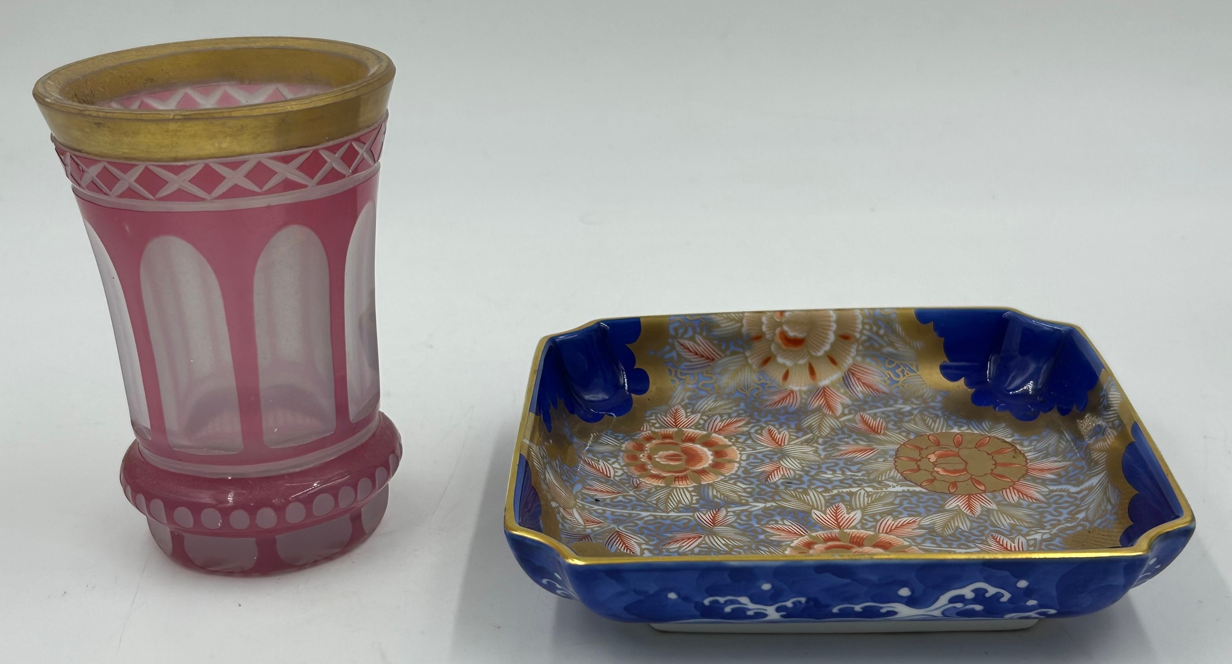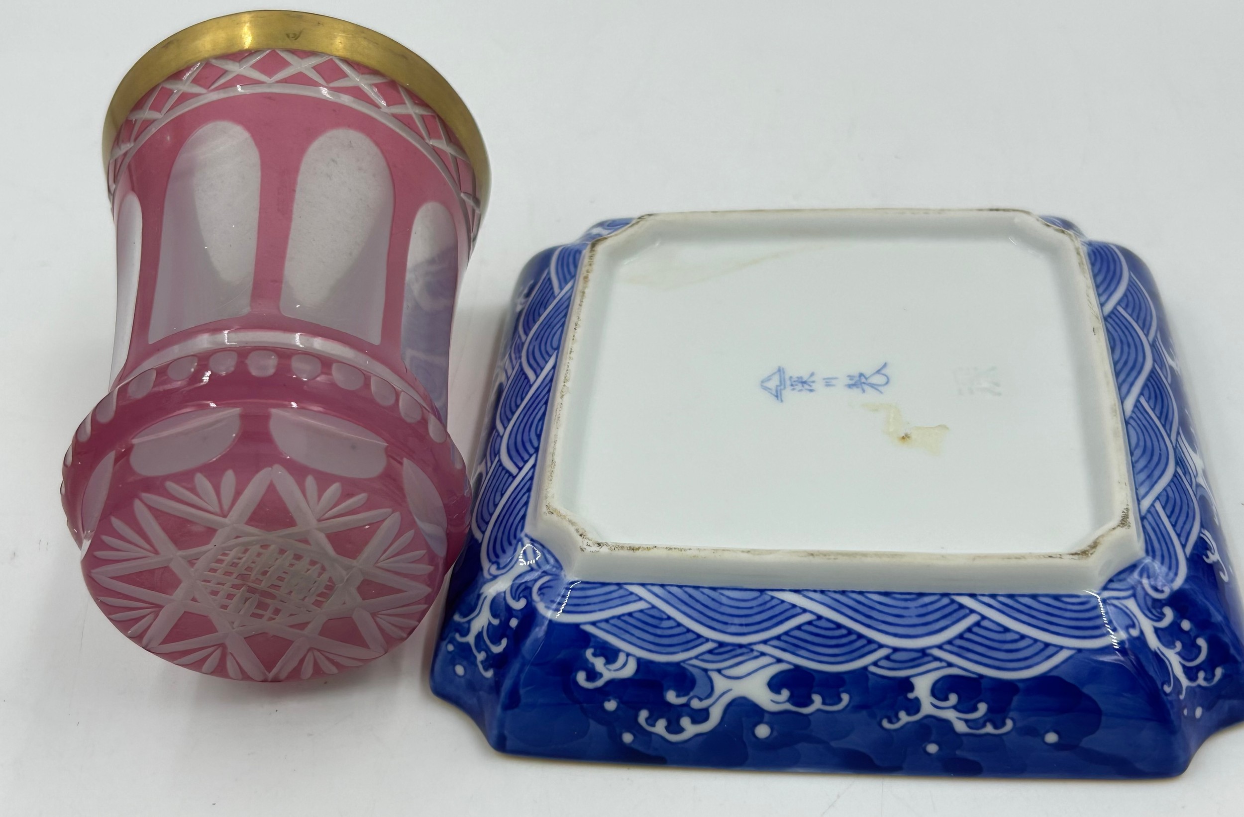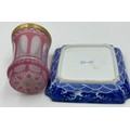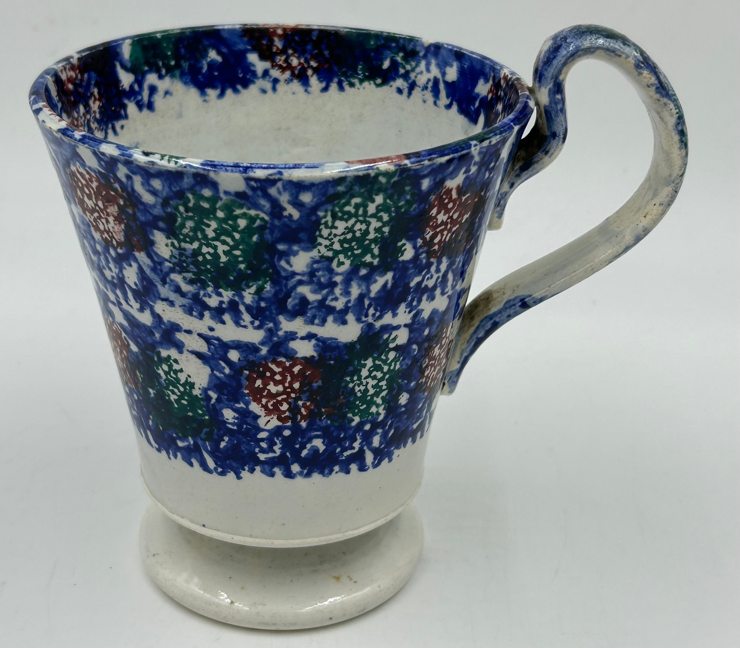 A selection of continental ceramics to include a Royal Bayreuth pig creamer, cranberry opaline glass vase, a large spongeware mug in blue/red/green 13cm together with a Pierrot figurine with blue beehive mark to base 17cm and a German goat herder figurine. (6).
