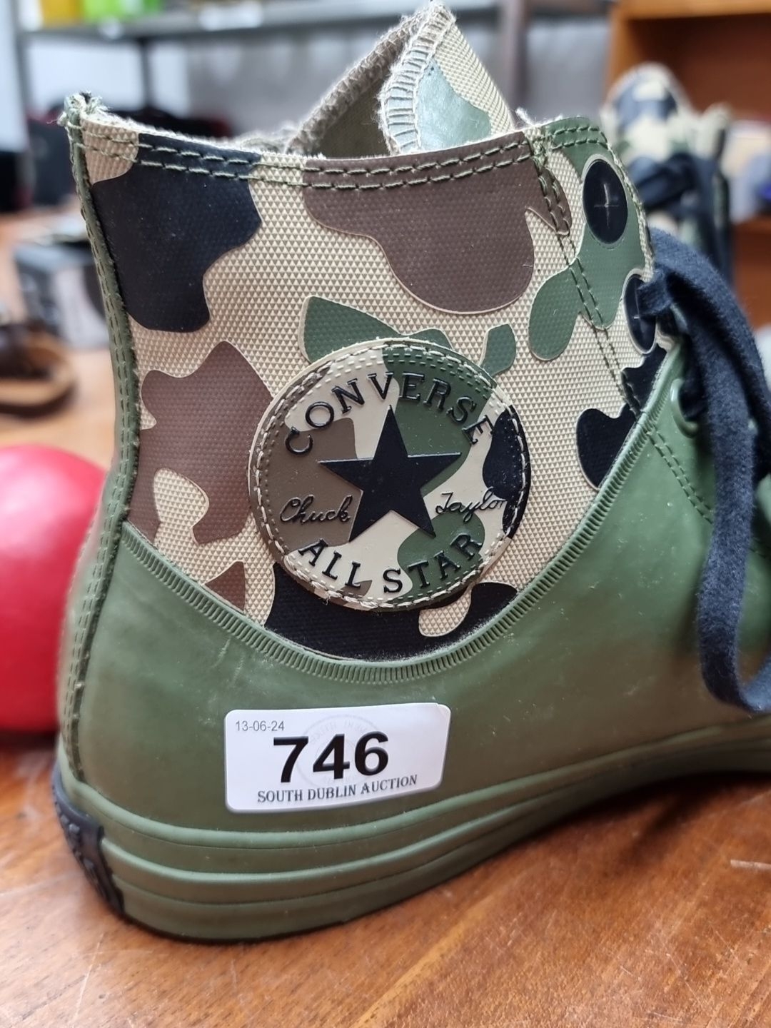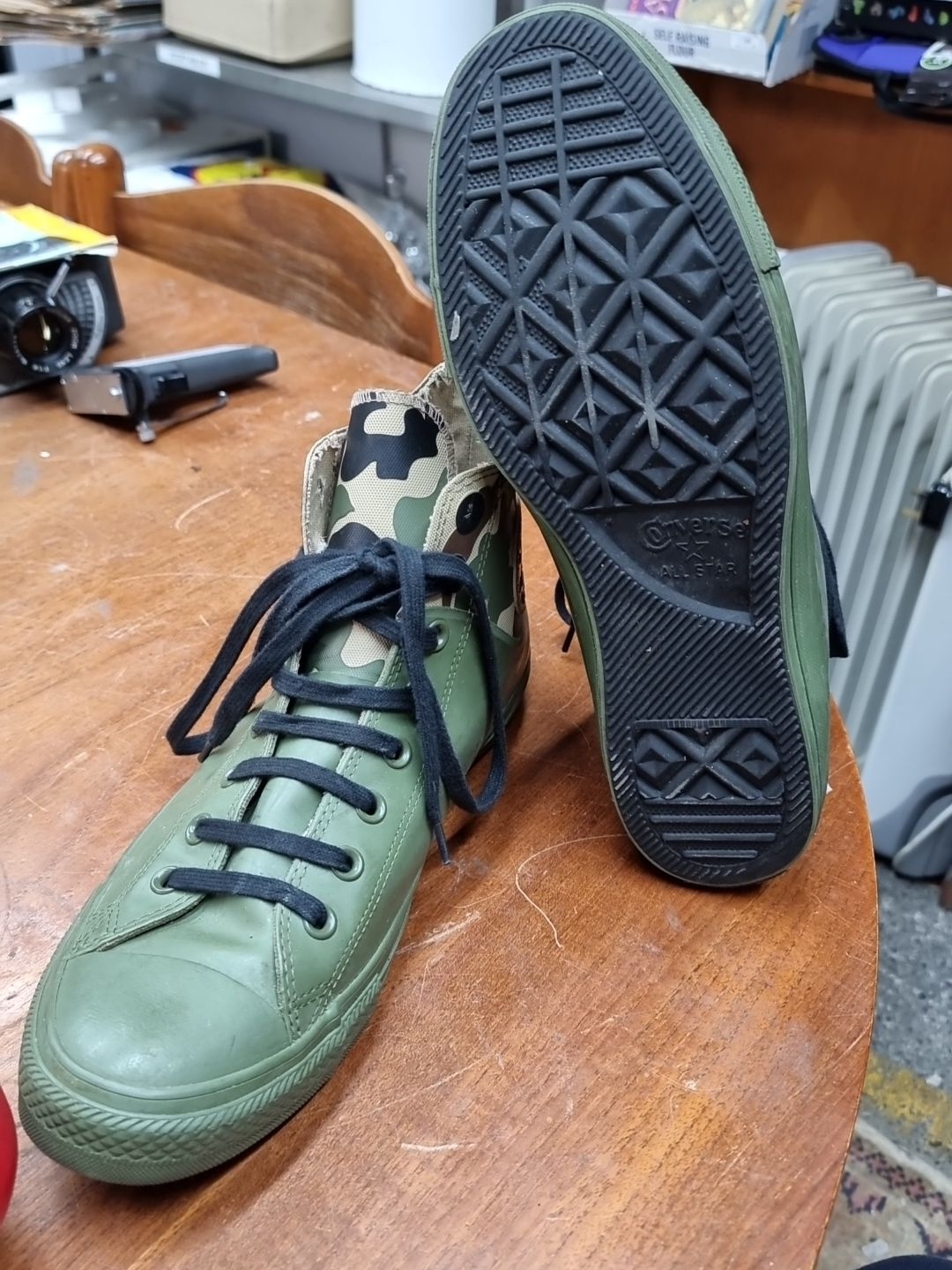 A pair of brand new mens Converse Chuck Taylor All Star camouflage high-top sneakers, featuring durable green rubber and canvas upper with signature rubber soles. UK 10.