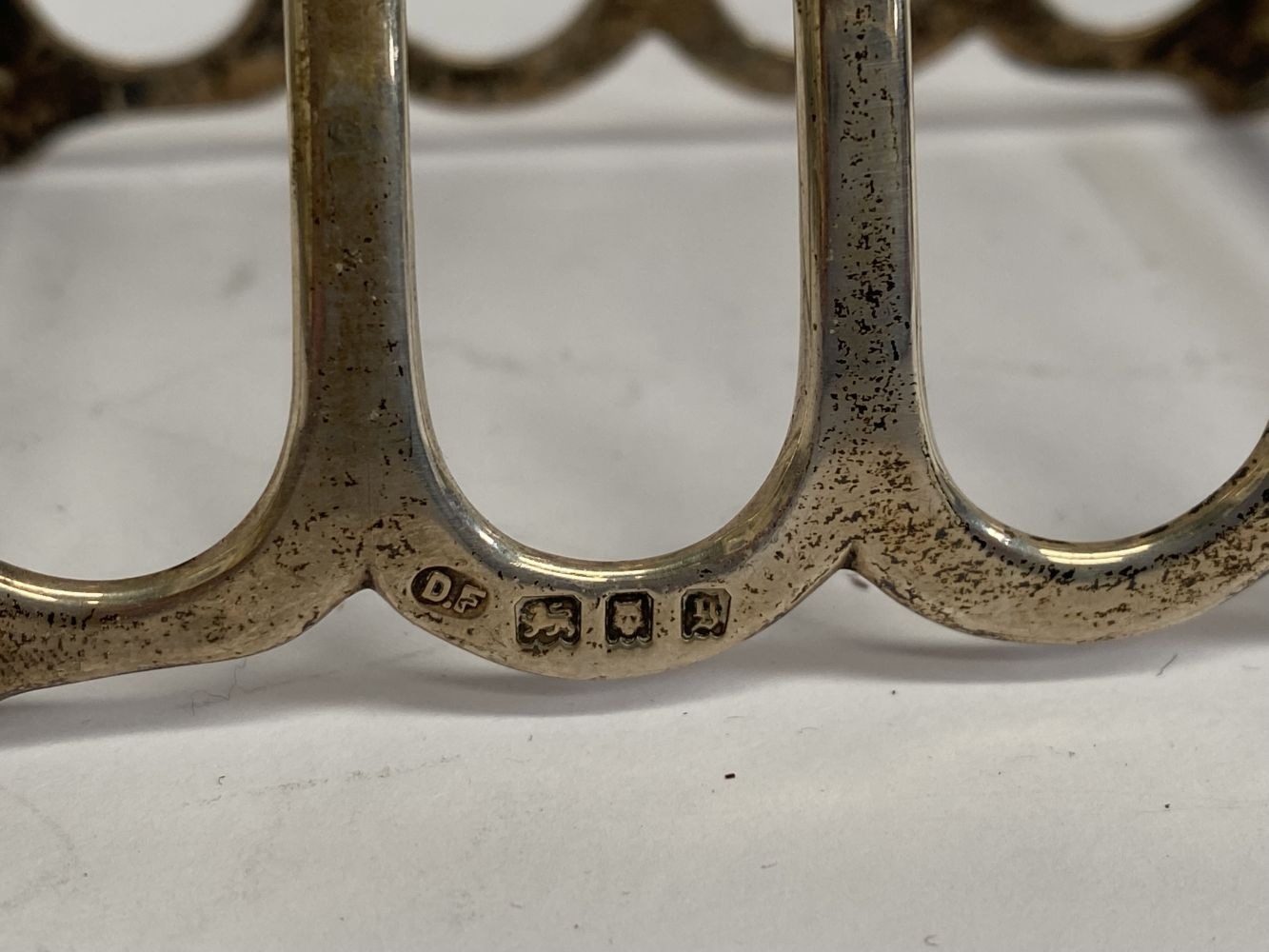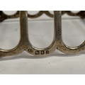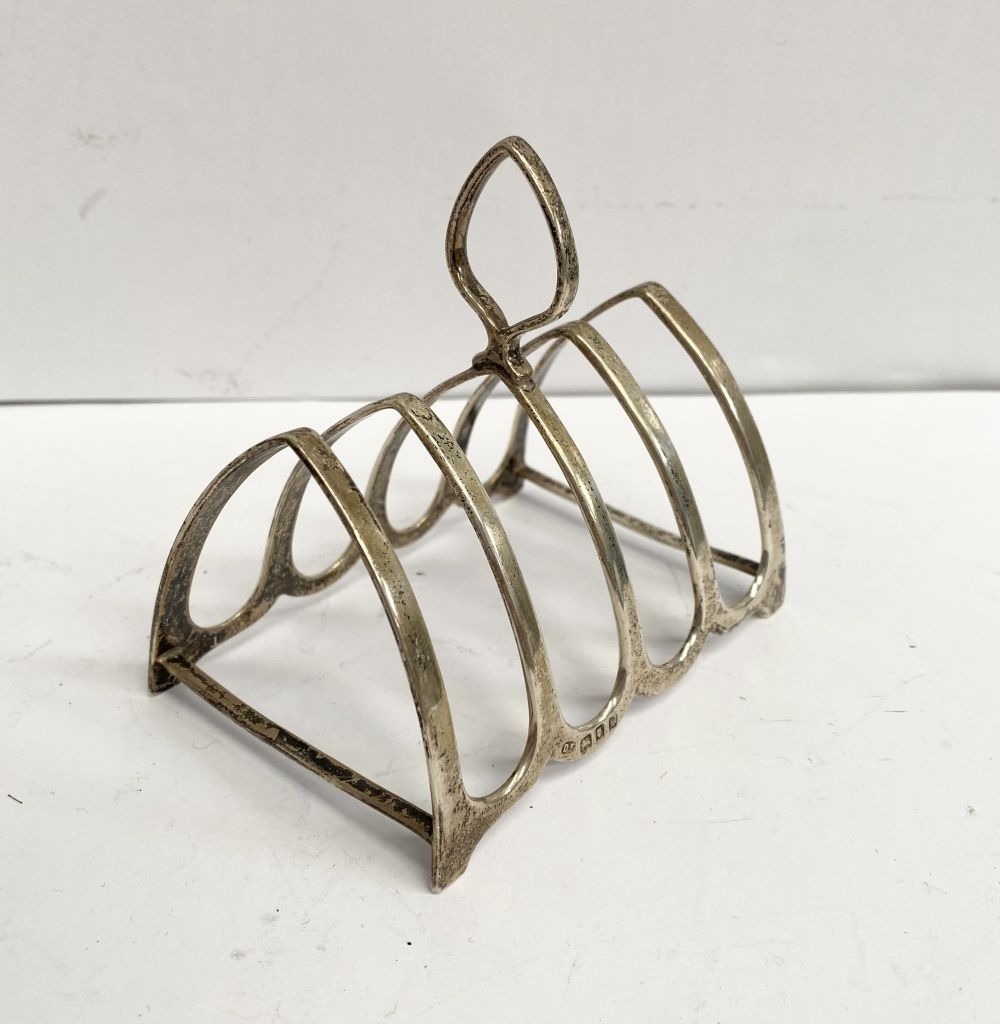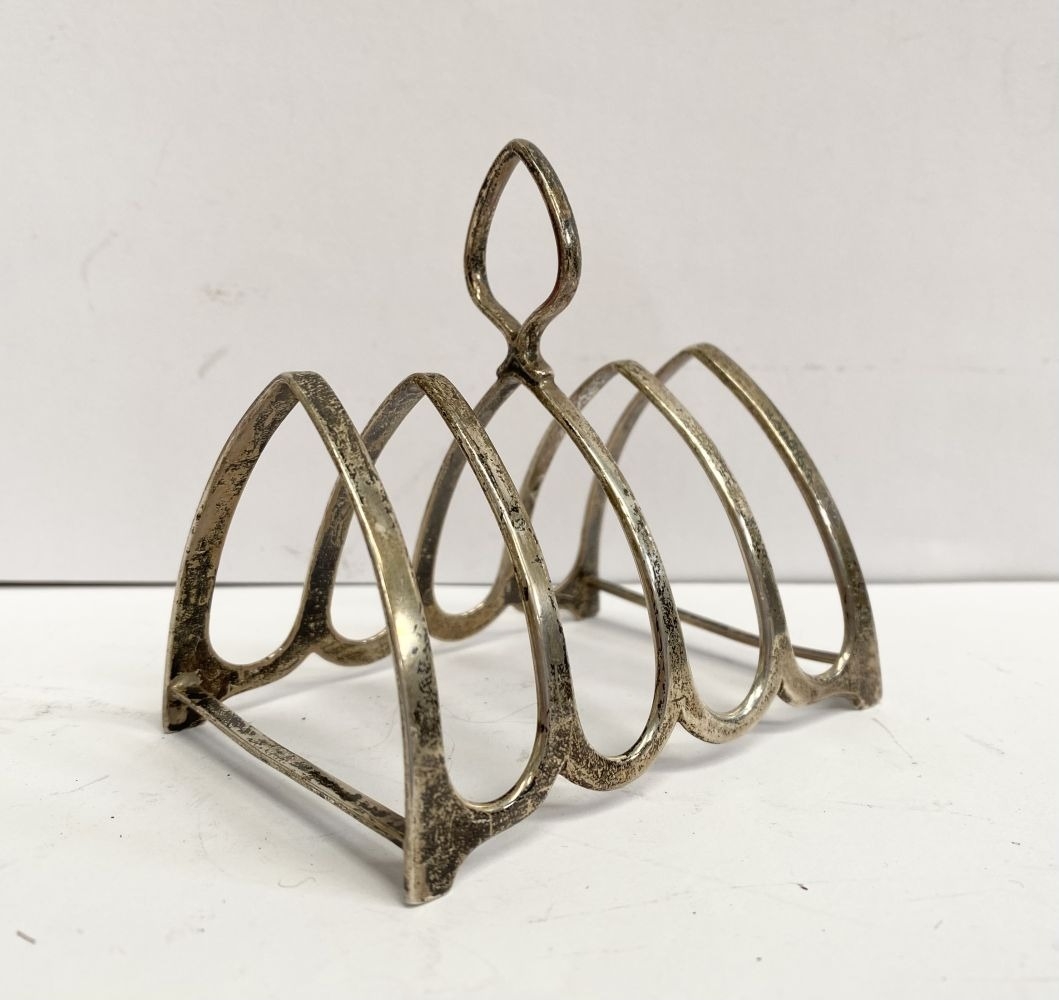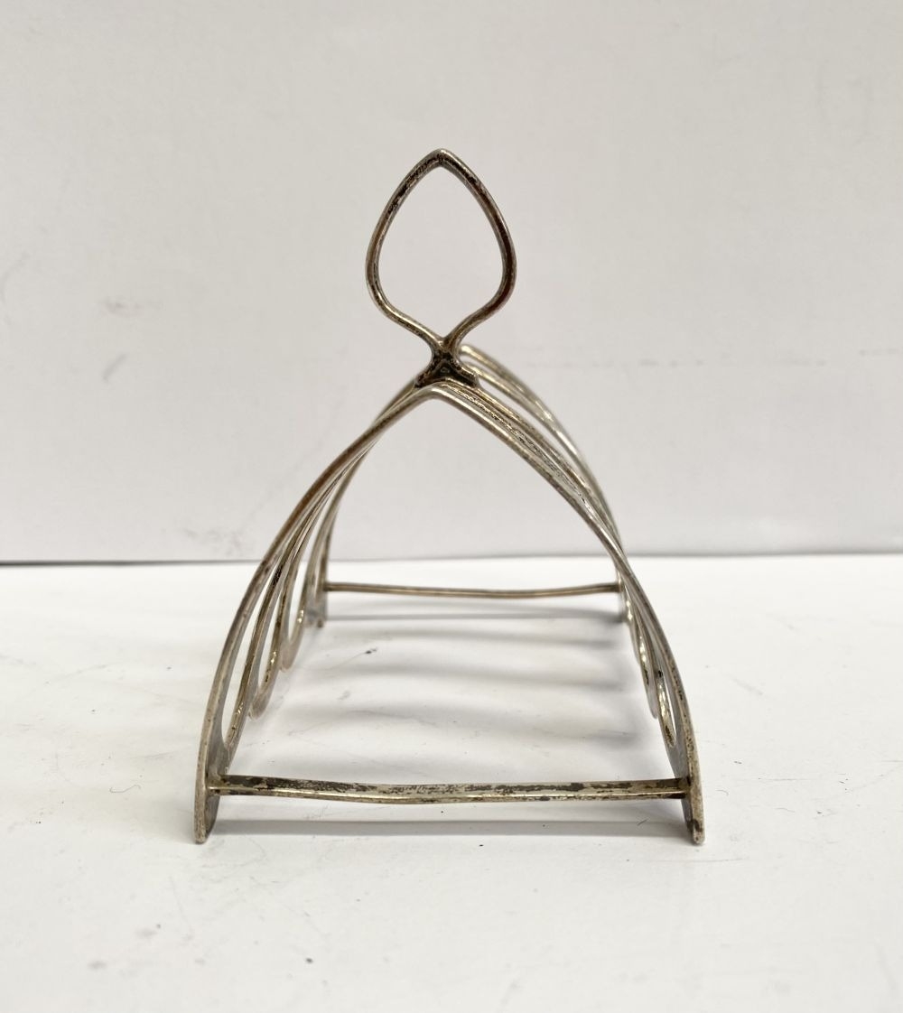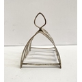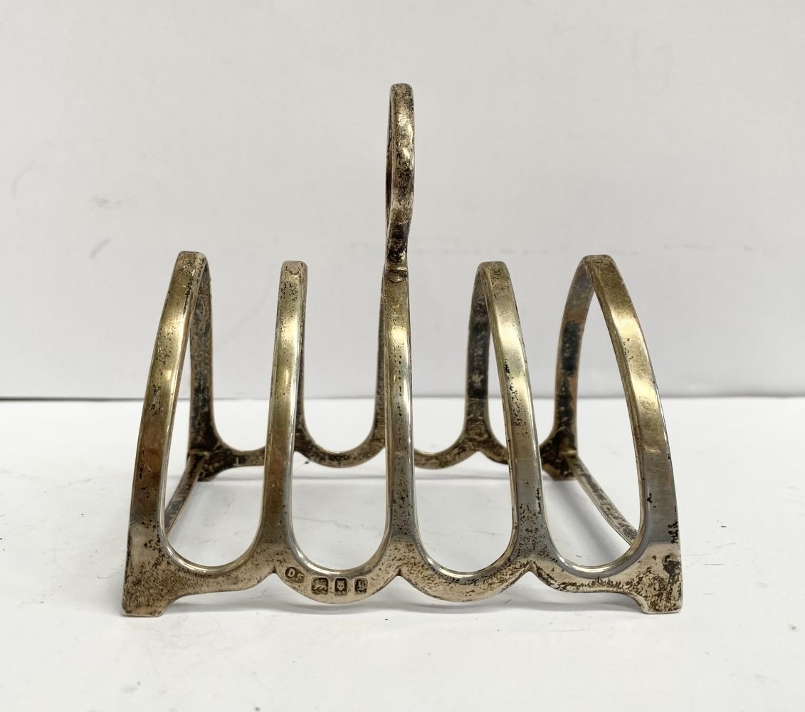 A CHARMING SILVER TOAST RACK, Maker Josiah Williams & Co (David Landsborough Fullerton), Augustine Parade, Bristol c.1933. With scalloped base, standing on four short feet joined by supports, with diamond shaped handle to centre. Dimensions: 9cm wide x 8.3cm high including handle. Weight: 2ozt approx