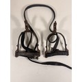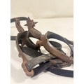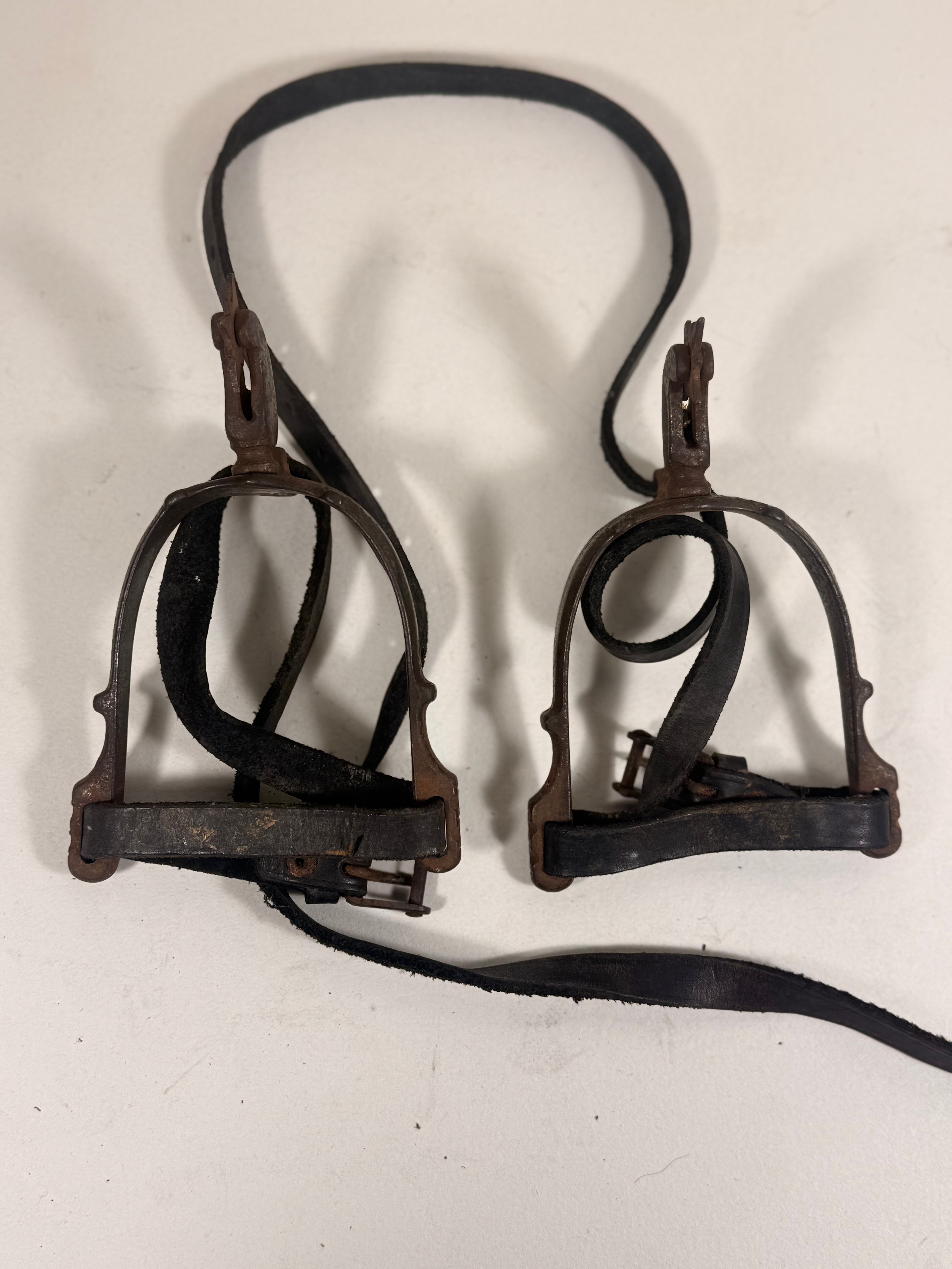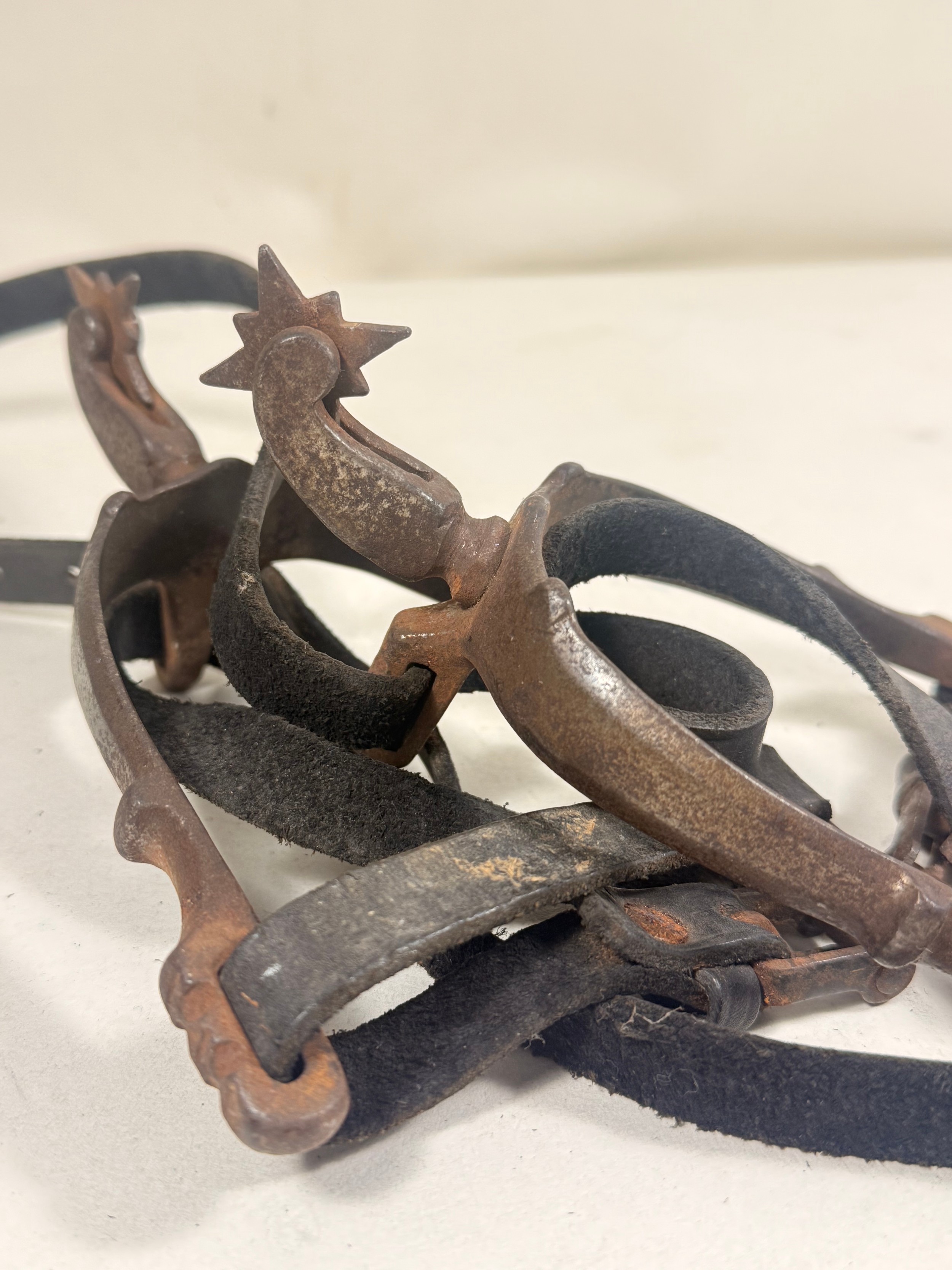 A pair of possibly 17th Century iron cavalry spurs complete with buckled leather straps, GC