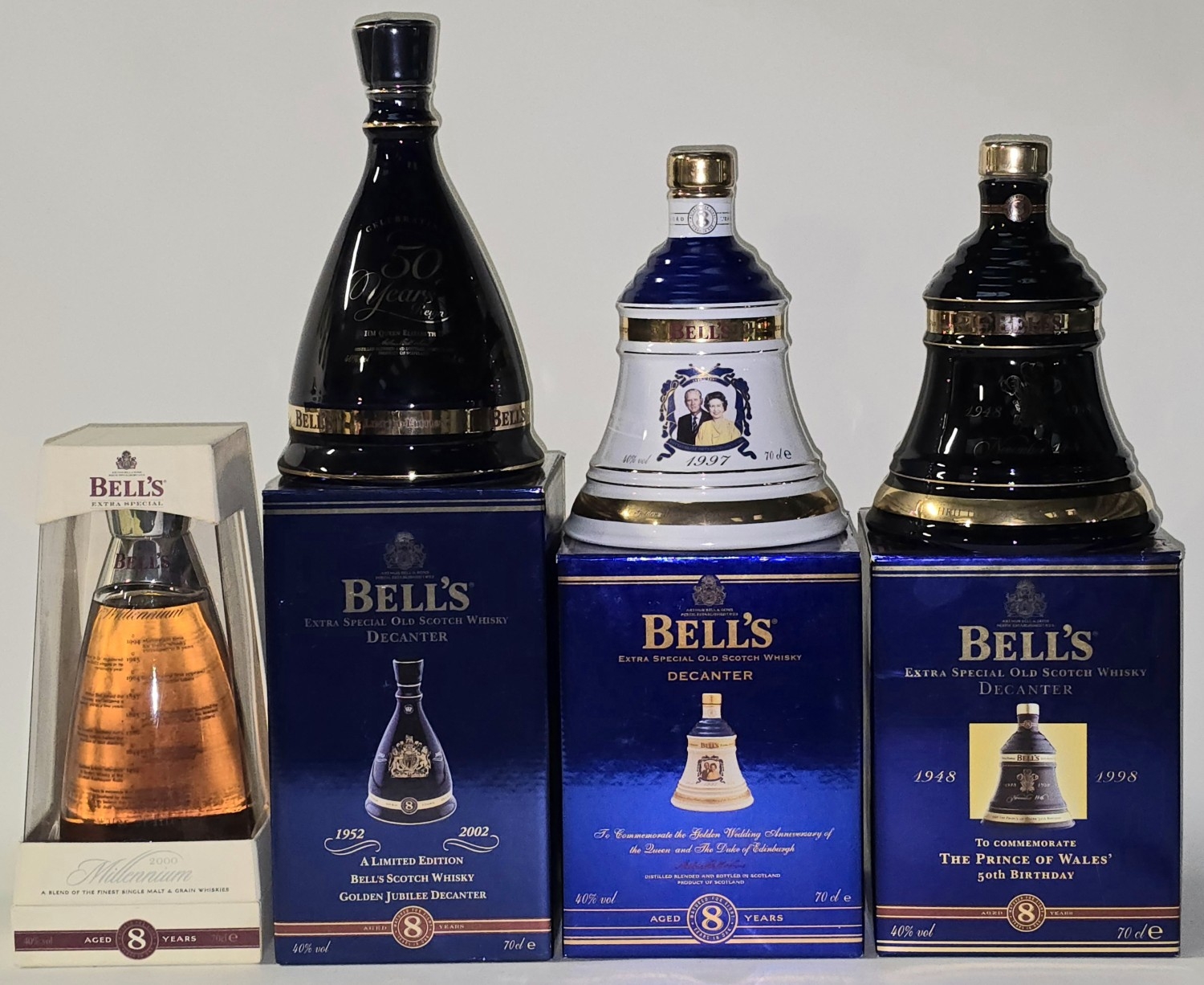 Bell's Whisky commemorative decanters to include Prince of Wales 50th Birthday 1998, Queen Elizabeth II and Duke of Edinburgh 50th Wedding Anniversary 1997, Golden Jubilee 2002 and Millennium 2000. All bottles still sealed.