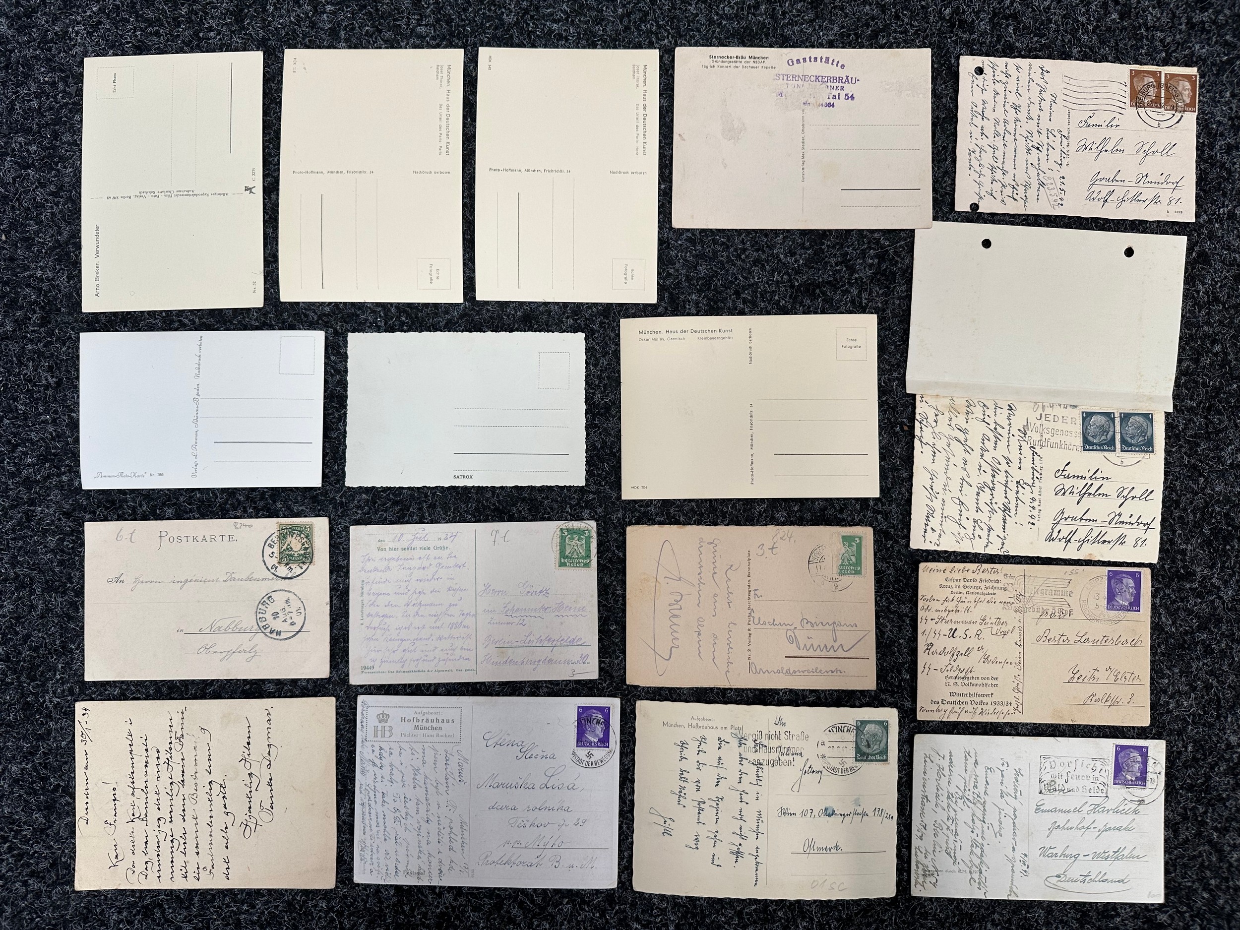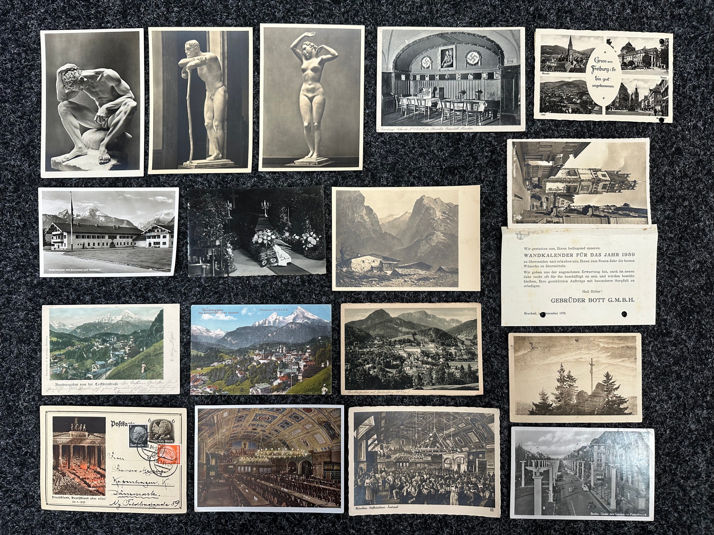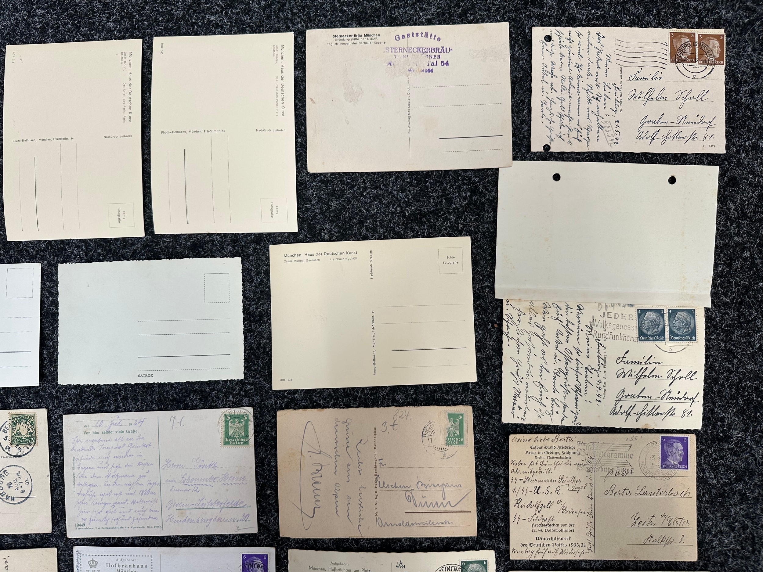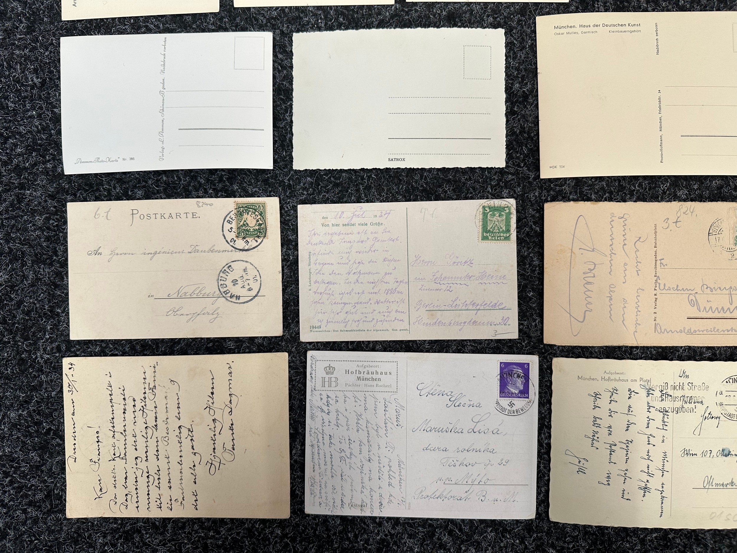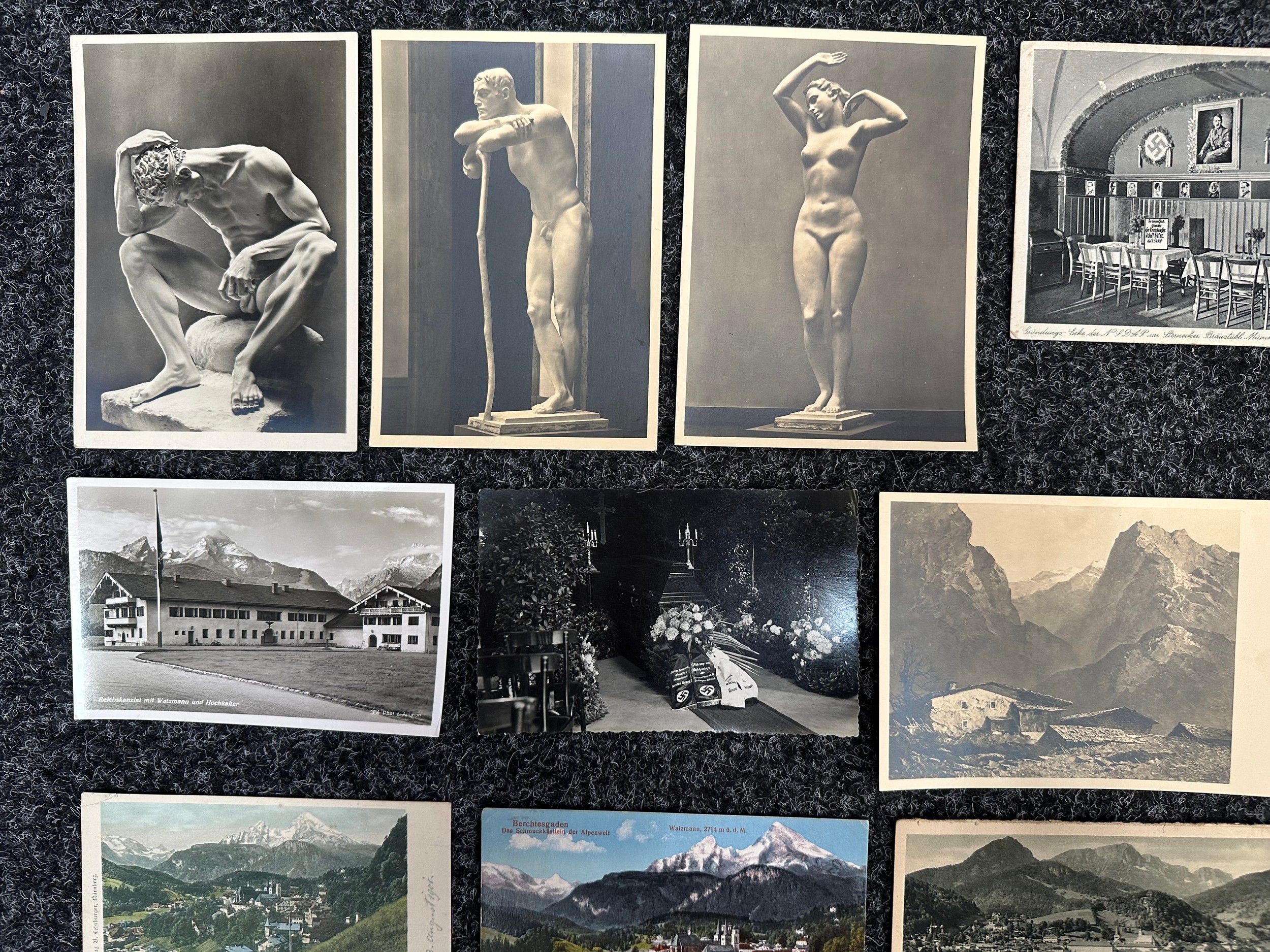 WW2 Third Reich Postcard collection. Seven cards have not been posted. The others have all been sent and are postmarked. Several showing Berchtesgaden, Hofbbrauhaus Munich, House of German Art, etc. One card is SS Feldpost marked. (17)