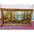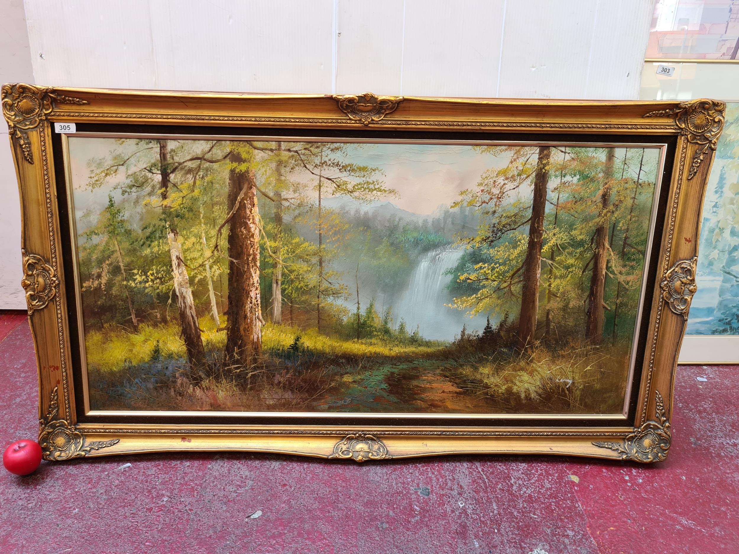 Star Lot: A very large original oil on canvas painting. Features a beautiful serene landscape with lush green trees and waterfall. Rendered in an earthly colour palette with greens, blues and browns. Great achievement of textures achieved through detailed brushstrokes. Housed in an elaborate decorative gilt frame. Signed Leung bottom right.