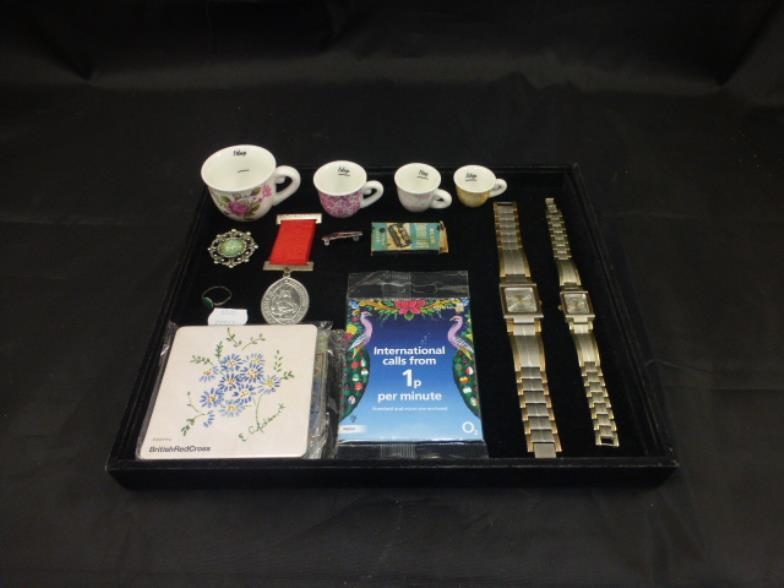 Mixed Tray Including Watches, Medal, Measuring Cups and More