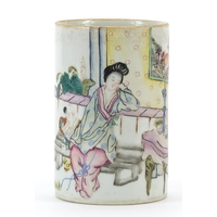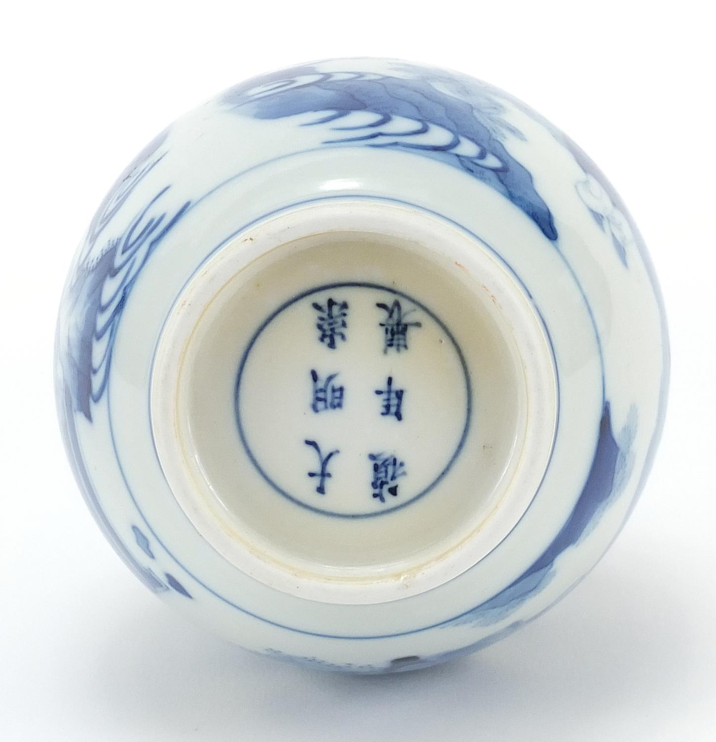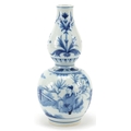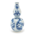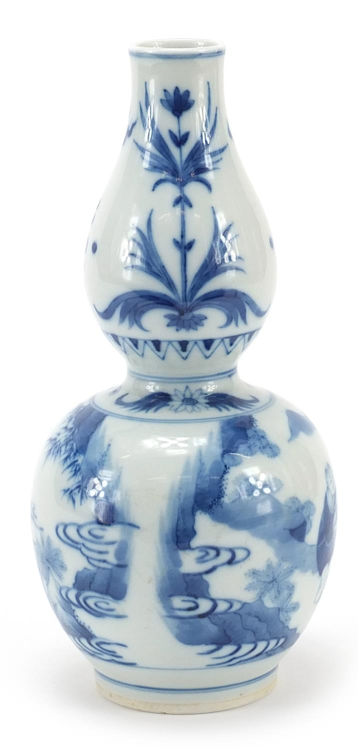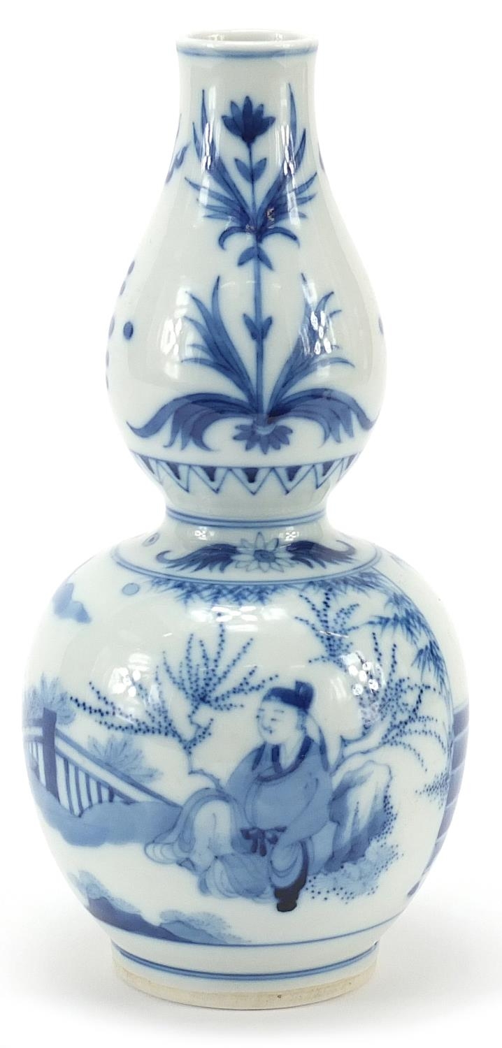 Chinese blue and white porcelain double gourd vase hand painted with figures in a palace setting, six figure character marks to the base, 21cm high