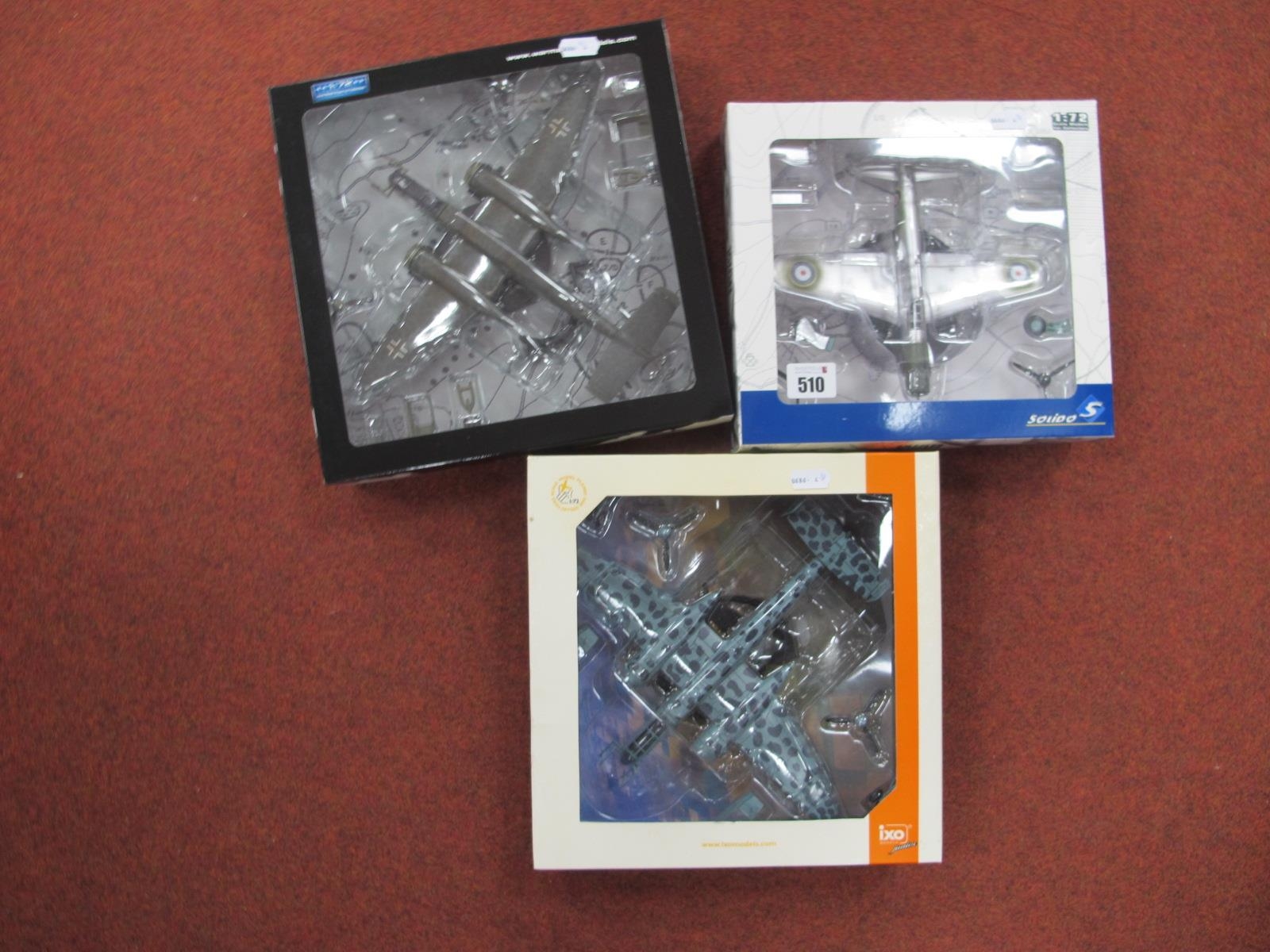 Three 1:72nd Scale Diecast Model Military Aircraft, comprising of IXO Junior # PIXJ000017 Heinkel He 219A-0 uhu, War Master models # APF0025 Heinkel He 219 A-7 uhu Solido # 57200006 Durnier Pfeil DO 335A-1, Germany 1945, boxed.