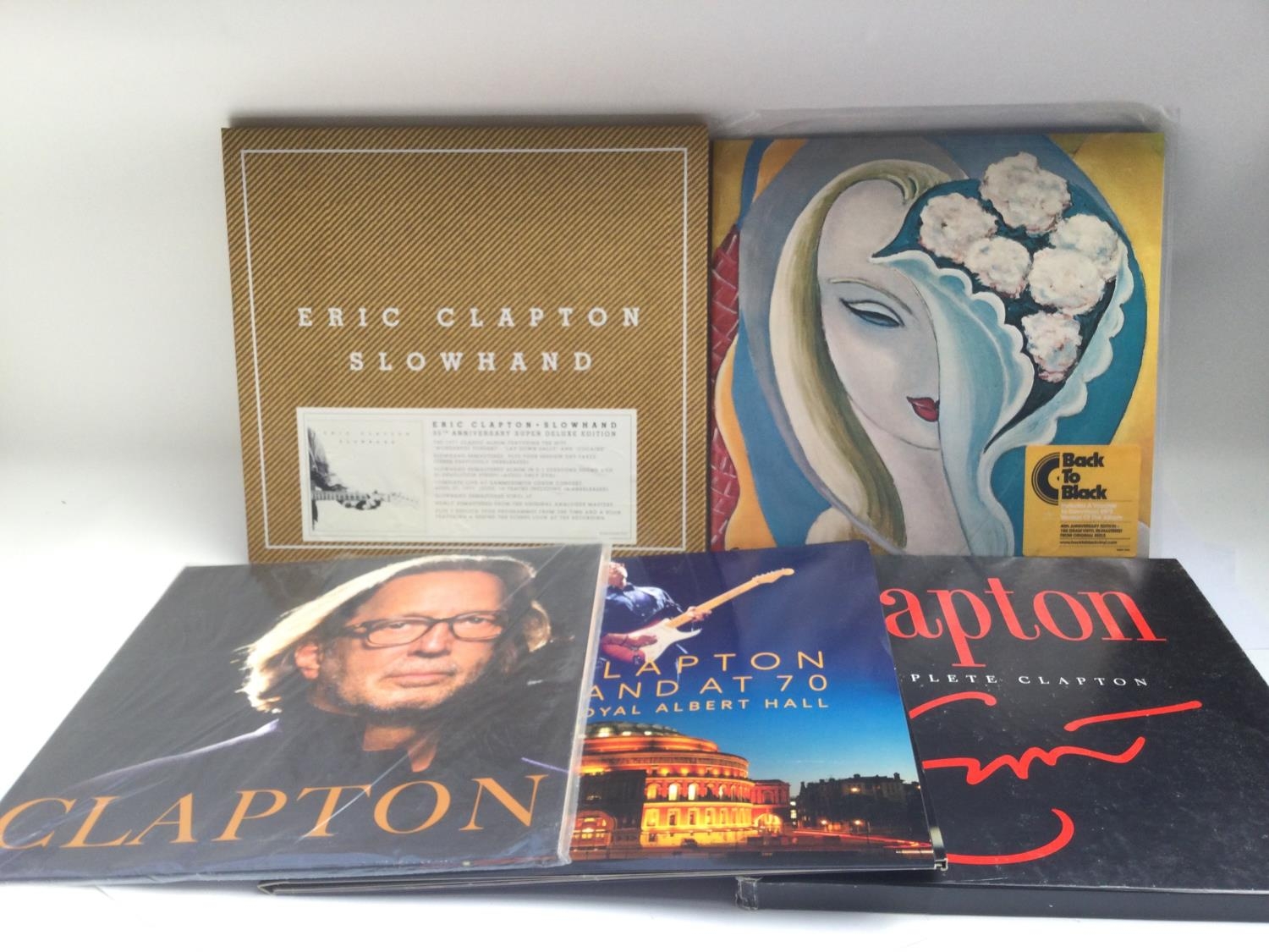 Two bags containing five Eric Clapton LPs comprising a 'Slowhand' 35th anniversary super deluxe box set, a 40th anniversary 180g pressing of 'Layla And Other Assorted Love Songs' and others.