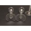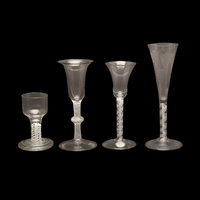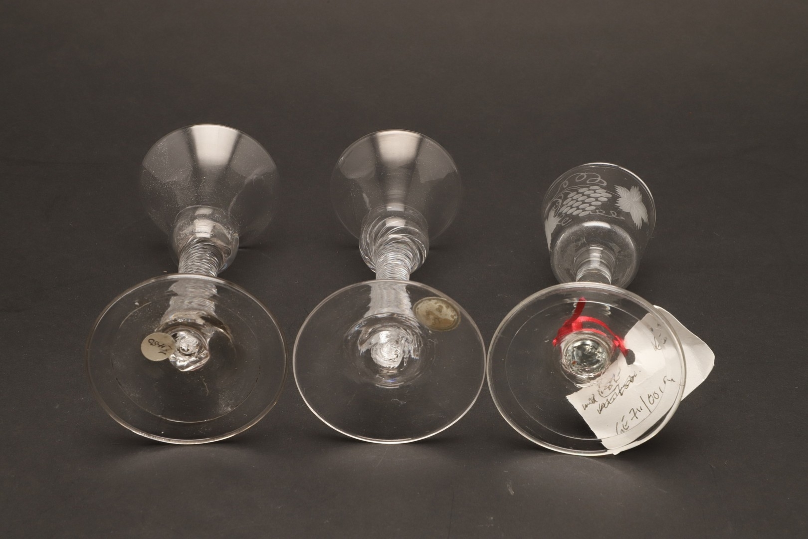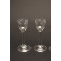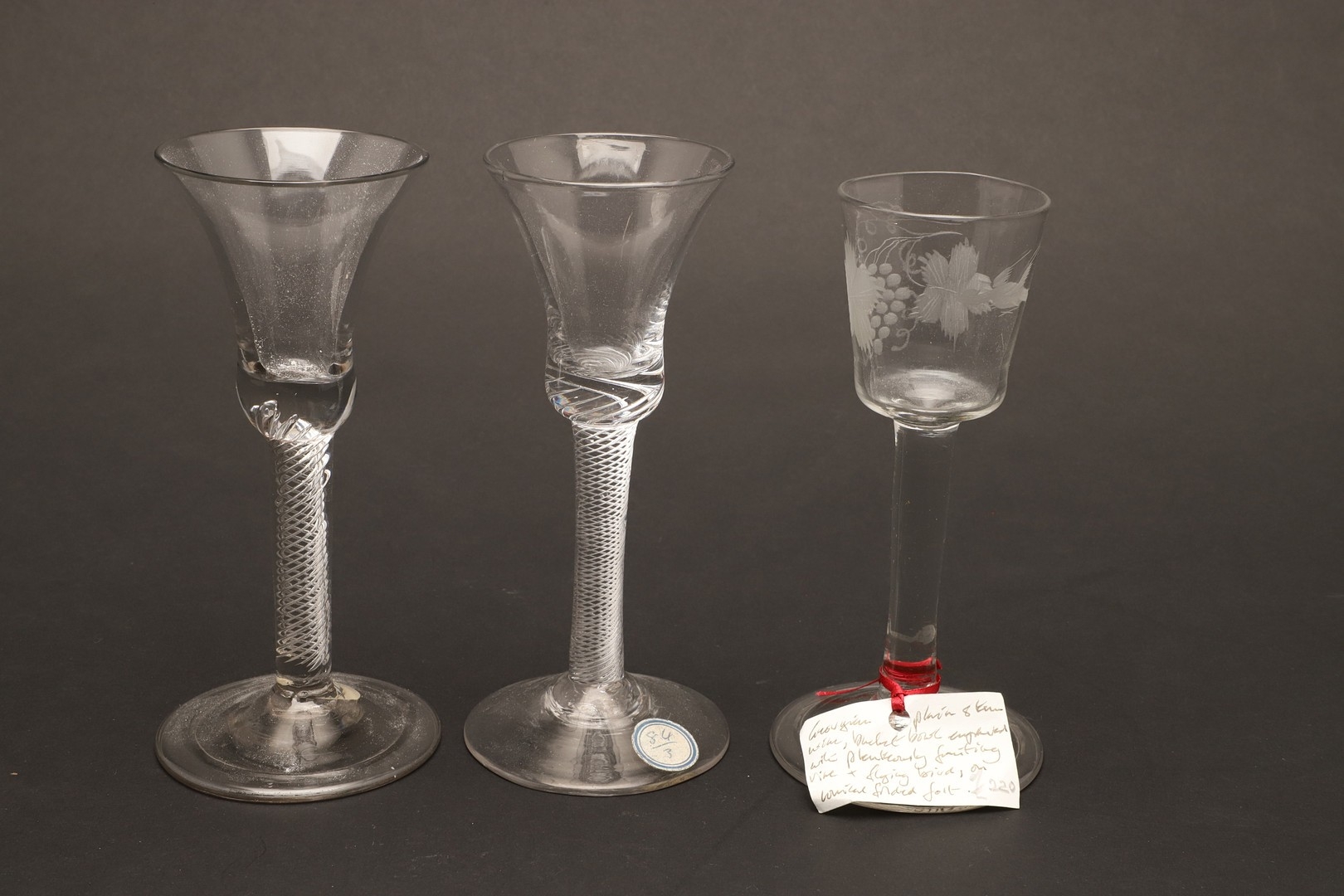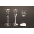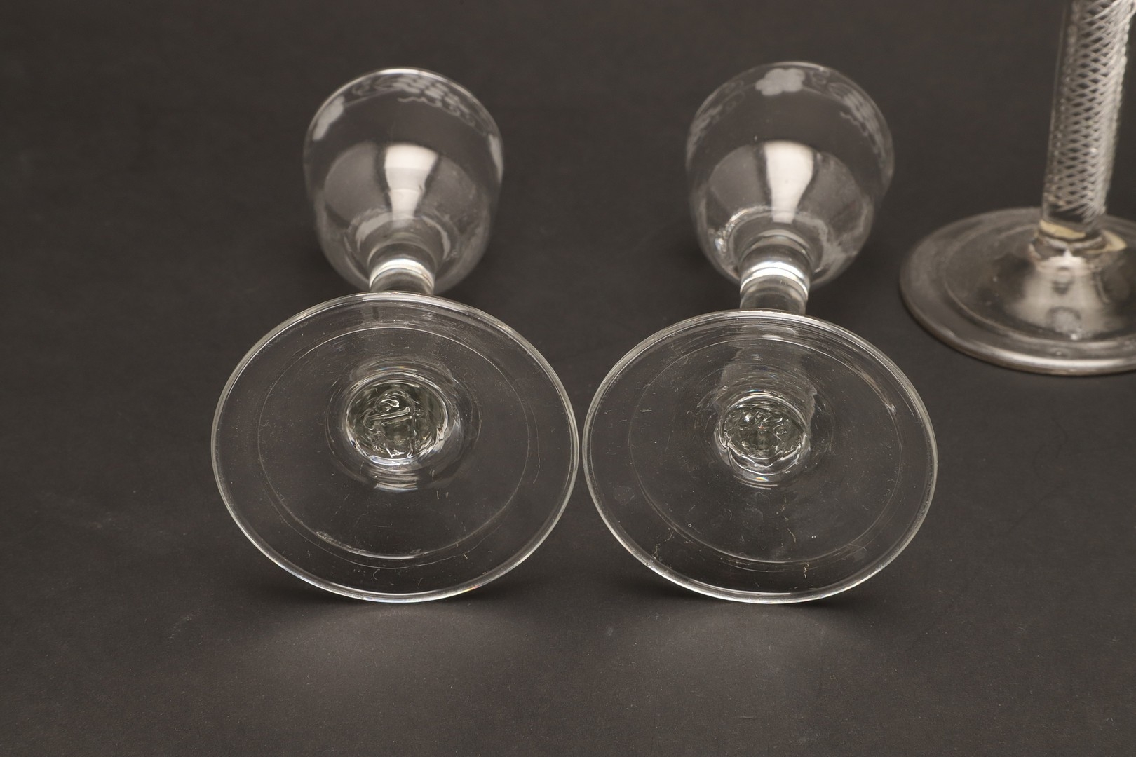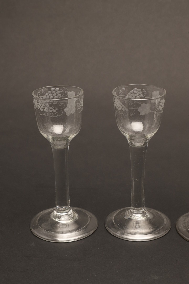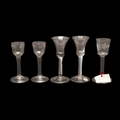 18THC WINE GLASSES. Including a pair of wine glasses, the bowls engraved with fruiting vine and with a plain stem and conical foot (15cms high), a single glass engraved with a bird amongst fruiting vine and plain stem (16cms high), and two similar wine glasses with spiral twist stems (16.5cms high). (5).