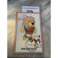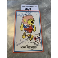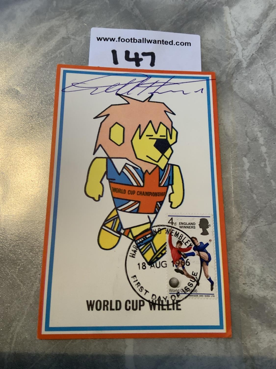 Geoff Hurst 1966 Signed World Cup Willie Postcard: Original 55 year old postcard with 4d England Winners stamp, hand stamped Wembley 18 8 1966 the day of issue of the stamp. Signed clearly to the front in biro.