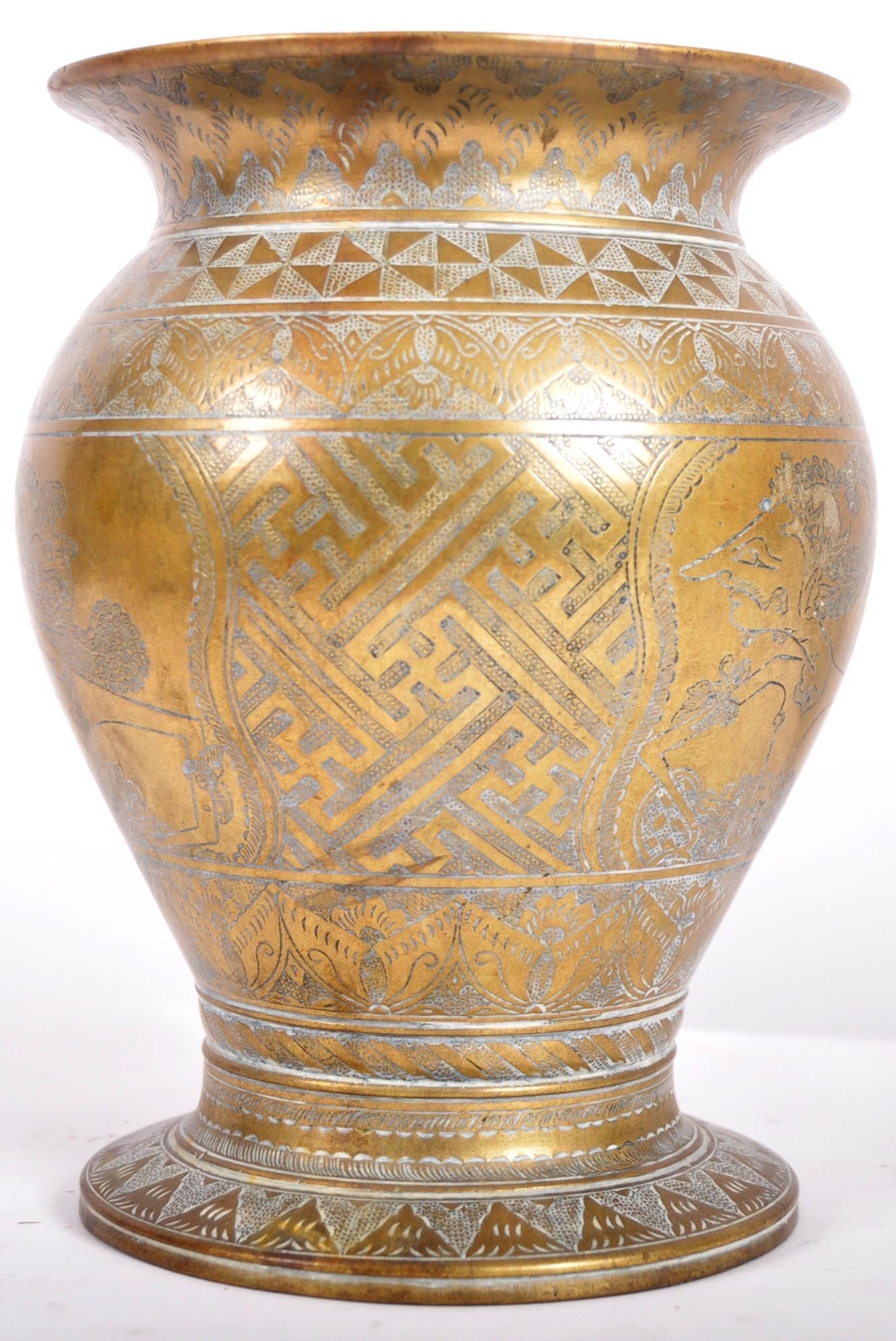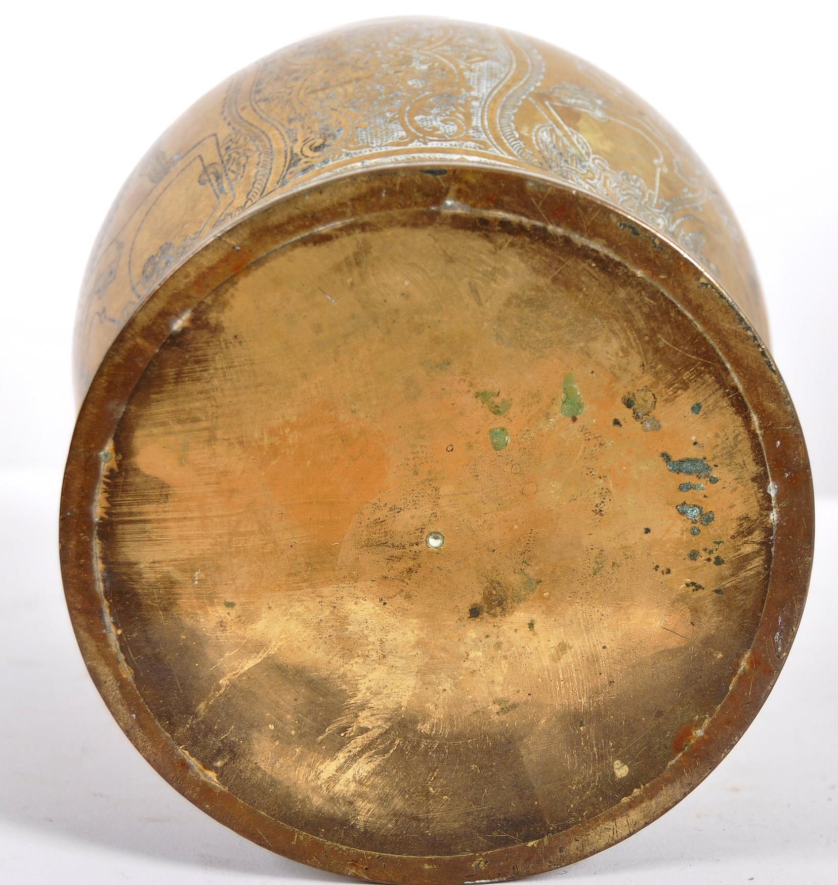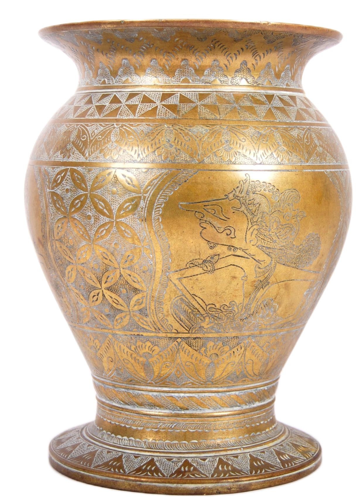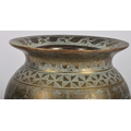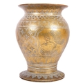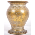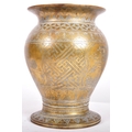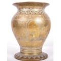 An 18th Century Persian heavy bronze centrepiece vase having a flared rim with bulbous body and flared circular foot. Etched decoration depicting figures & foliate. Measures approx; 21cm.