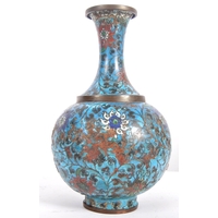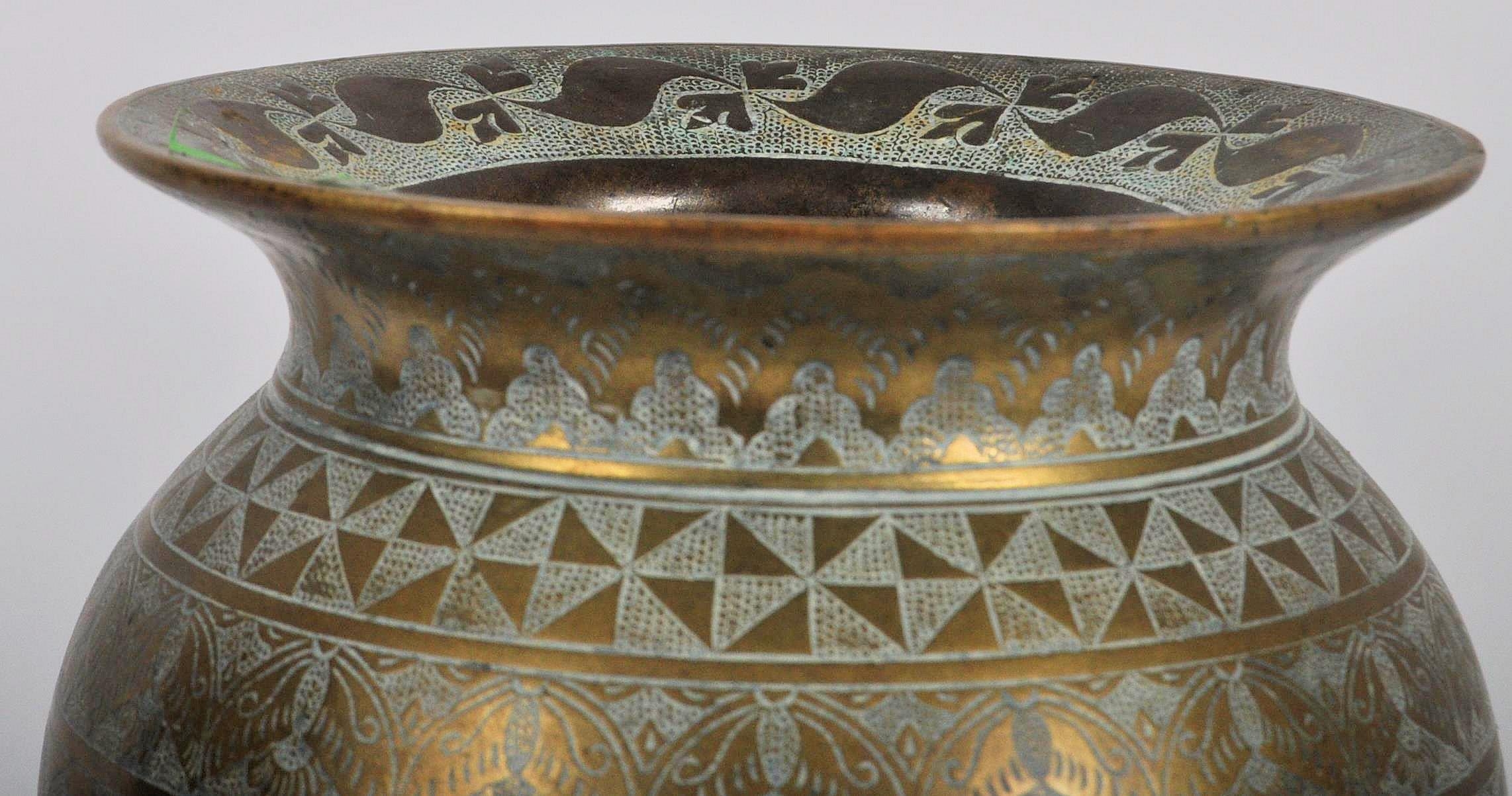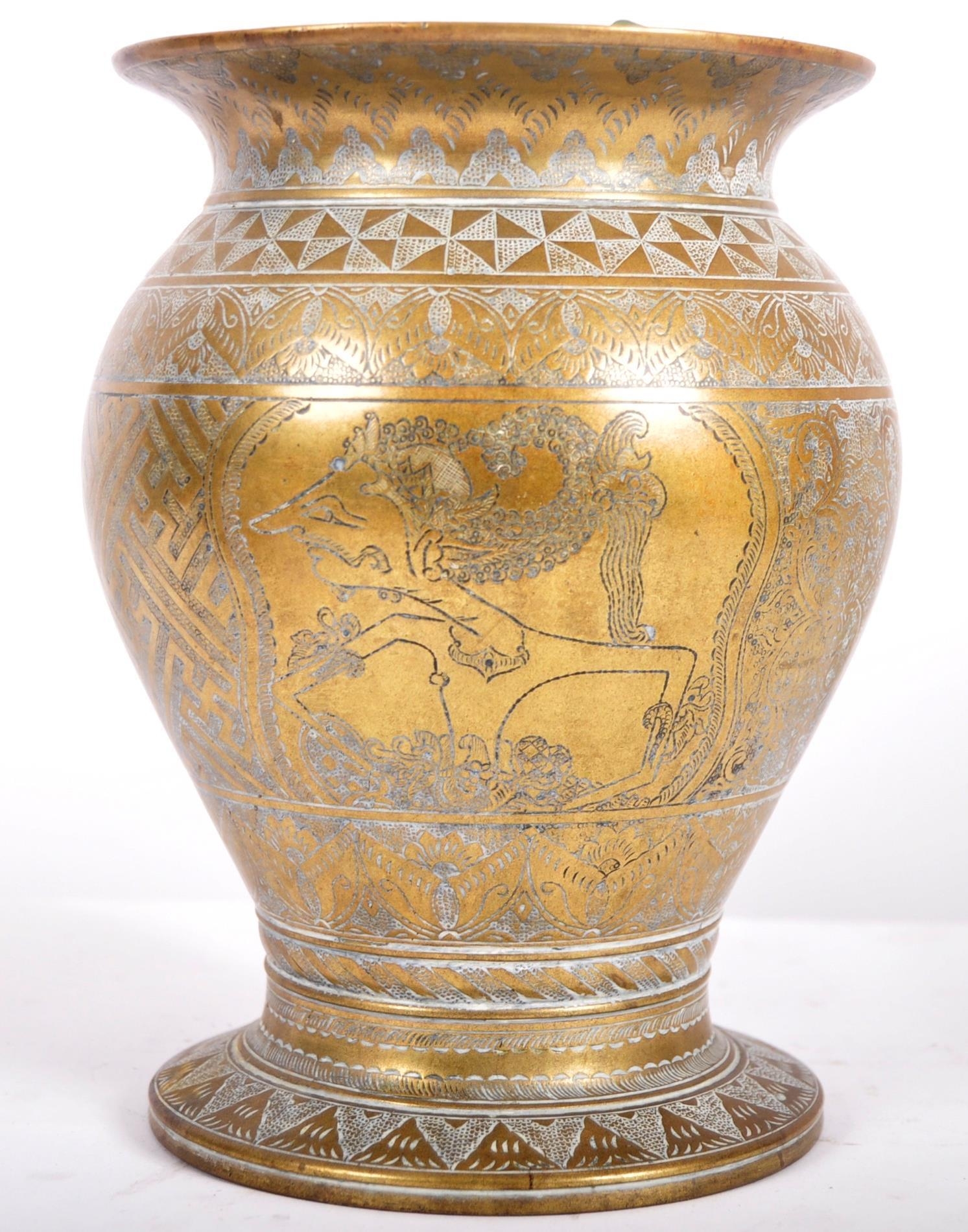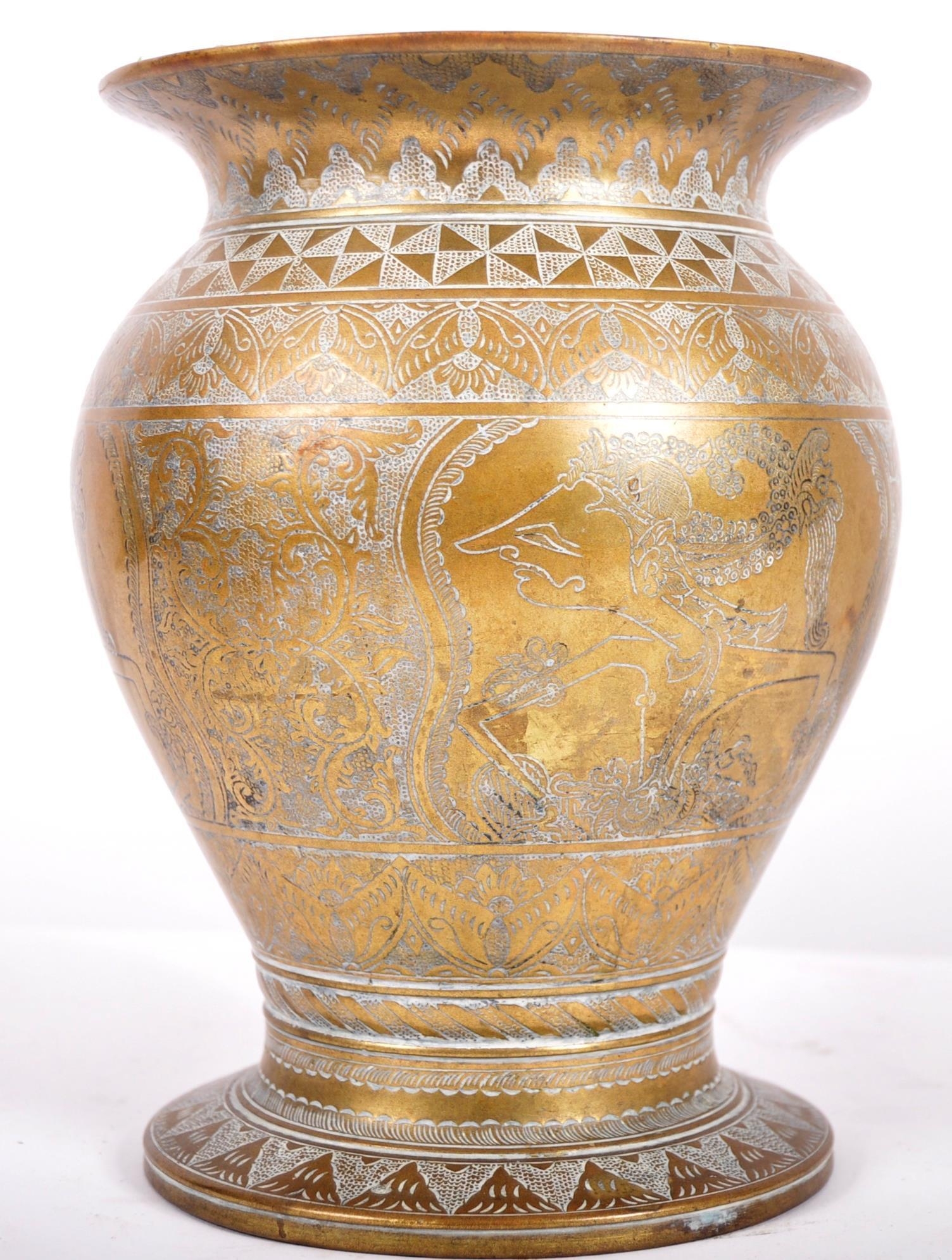 An 18th Century Persian heavy bronze centrepiece vase having a flared rim with bulbous body and flared circular foot. Etched decoration depicting figures & foliate. Measures approx; 21cm.