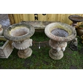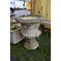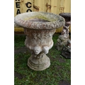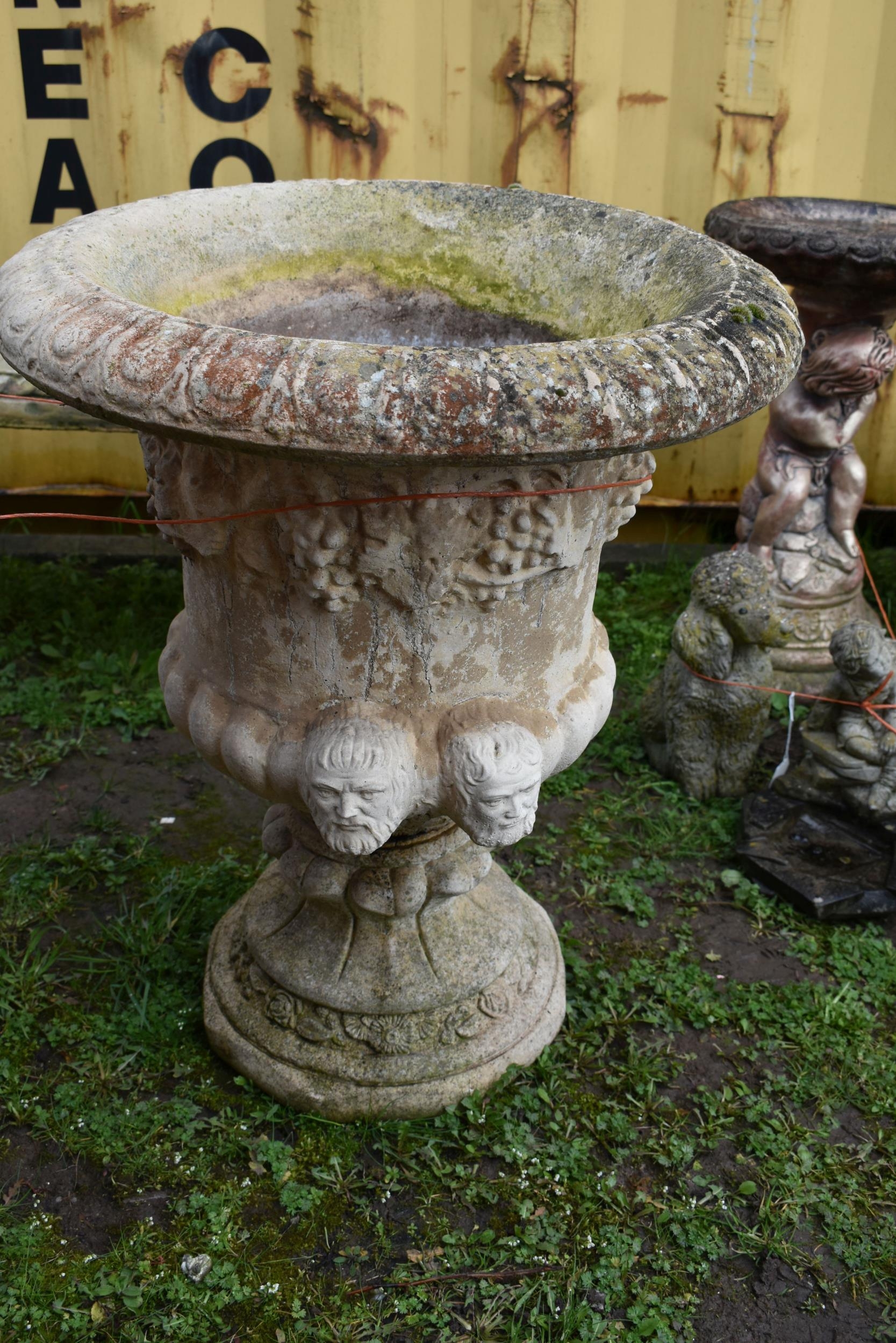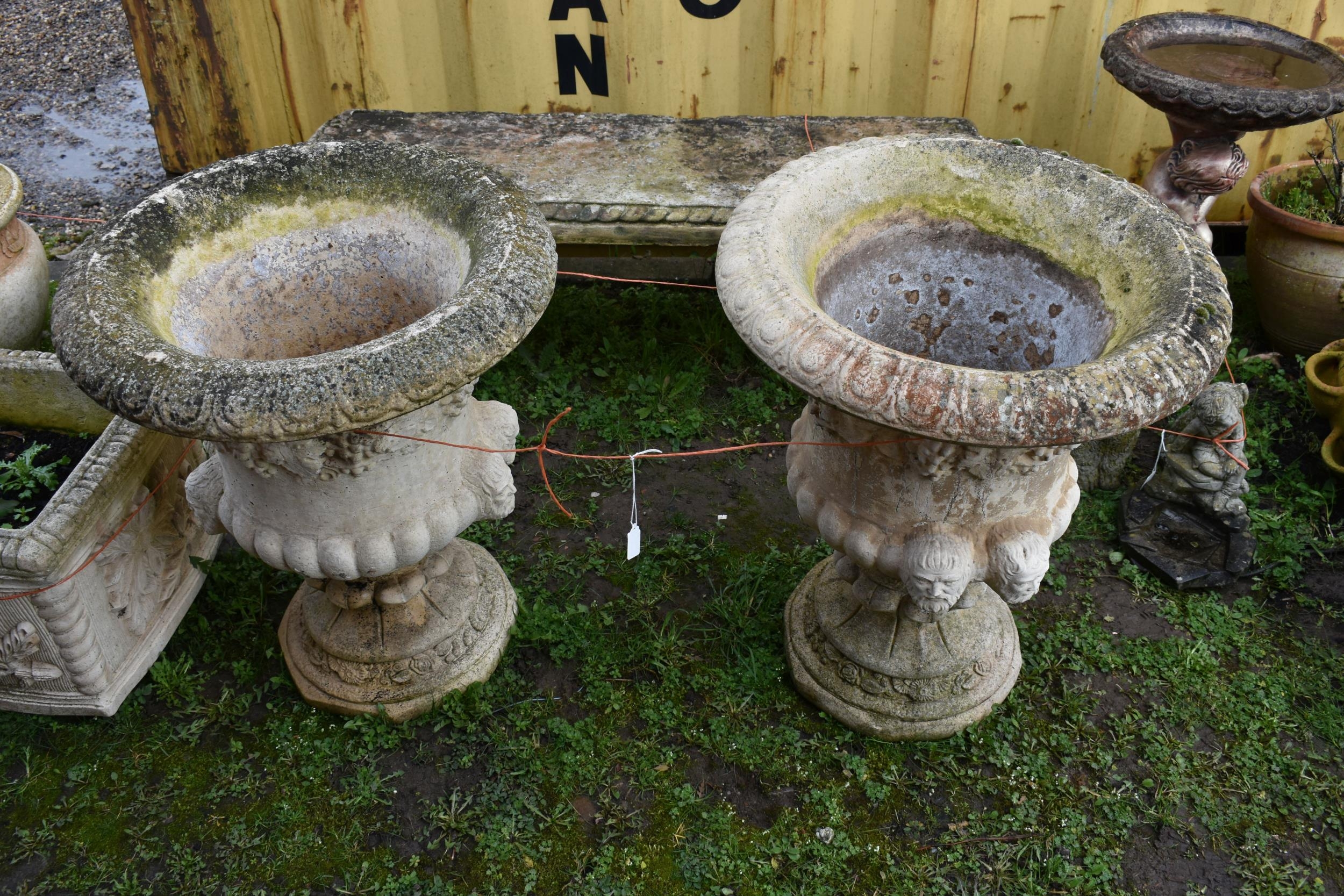 A PAIR OF MODERN COMPOSITE GARDEN URNS with a baluster bowl, face mask handles, grape and vine detailing to top, egg and dart rim, height 67cm (2)