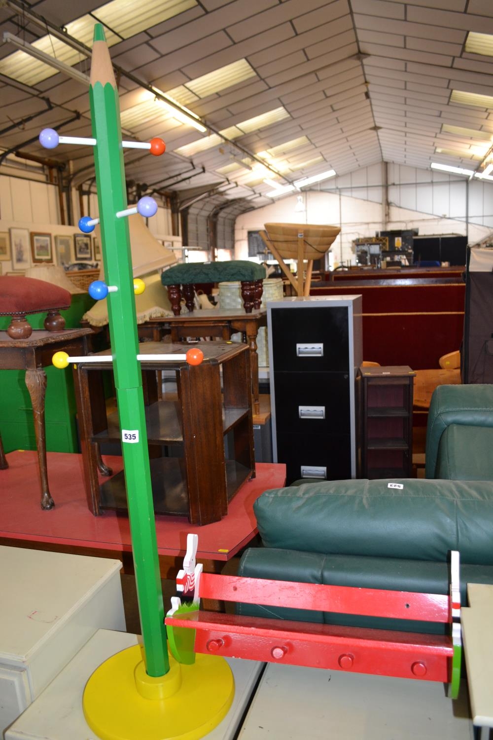 RABBIT PAINTED CHILDS COAT RACK WITH 4 HOOKS AND SHELF OVER AND PENCIL SHAPED CHILDS COAT STAND