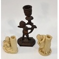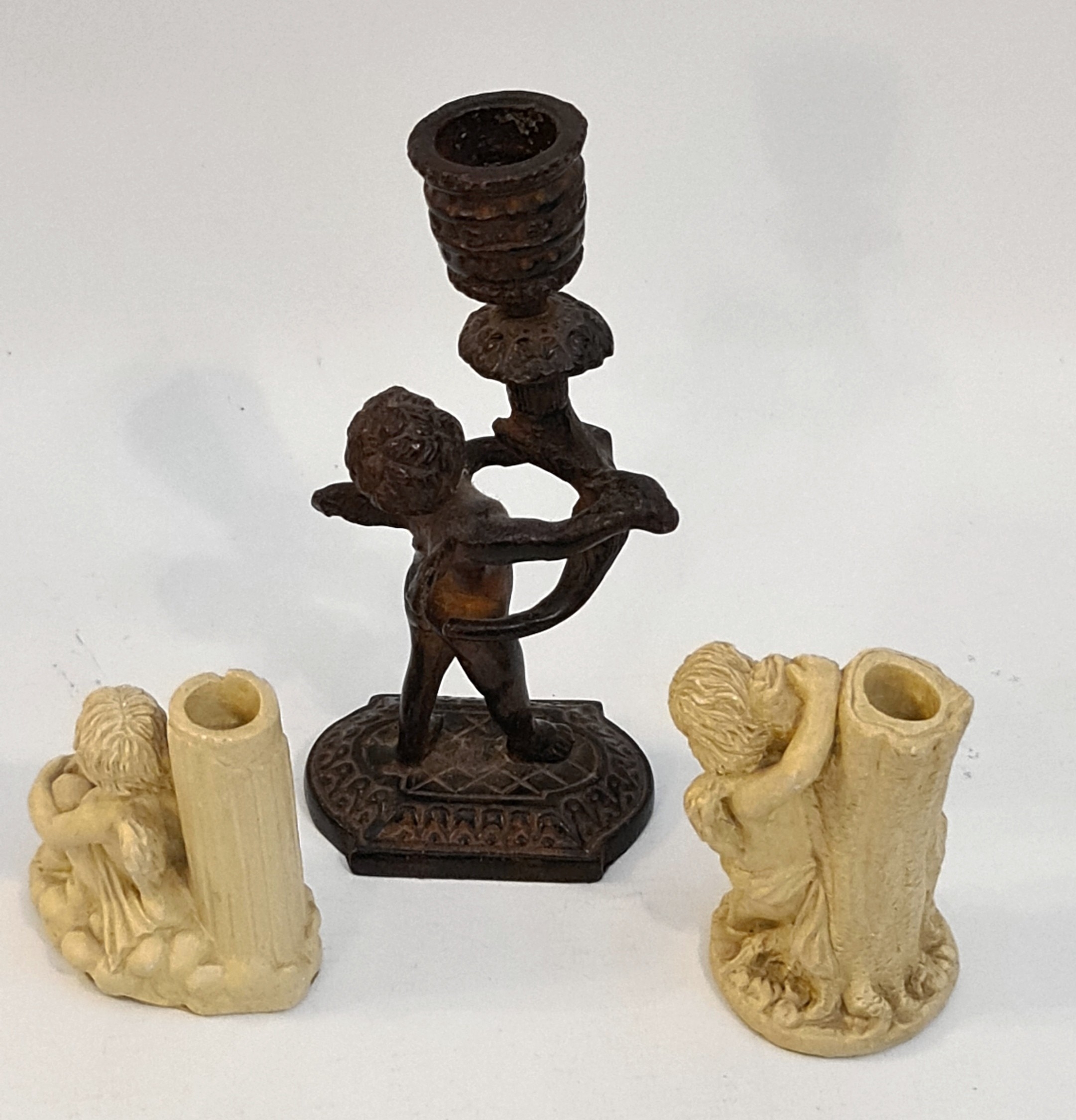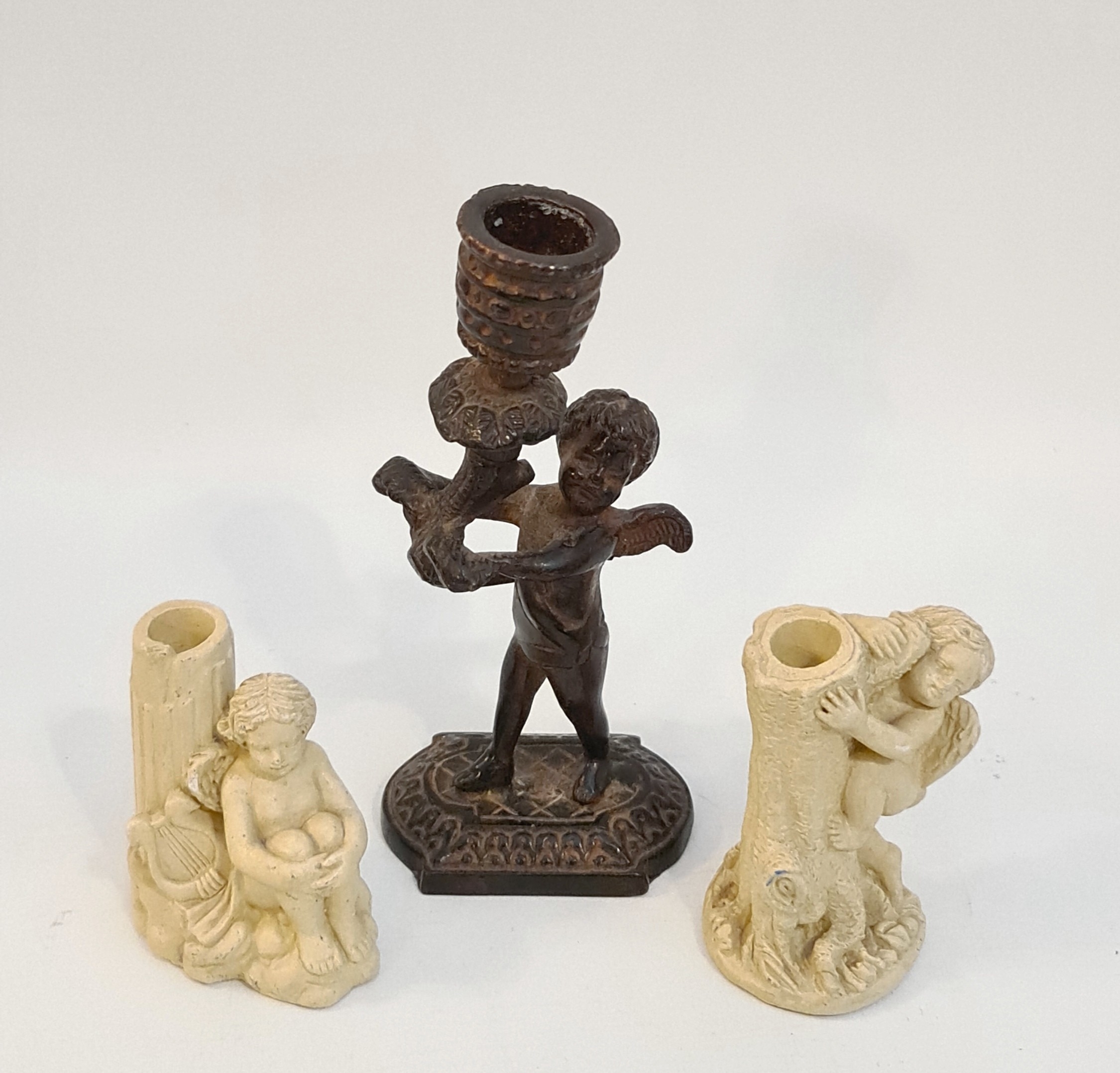 Cast Bronze Candlestick in The Form of a Winged Cherub Holding Aloft a Branch With The Candle Holder Atop of It. Measures 6 inches tall. Plus 2 Plaster Cast Candlesticks With Cherubs. The largest measures 3 inches tall. Shipping is available. Please ask for a quote before bidding. Where possible we combine shipping costs. Remember, if you are the highest bidder above reserve on this Lot you have bought the item and are legally responsible for the item. Viewing is recommended in either person or via video link. Contact us to arrange.