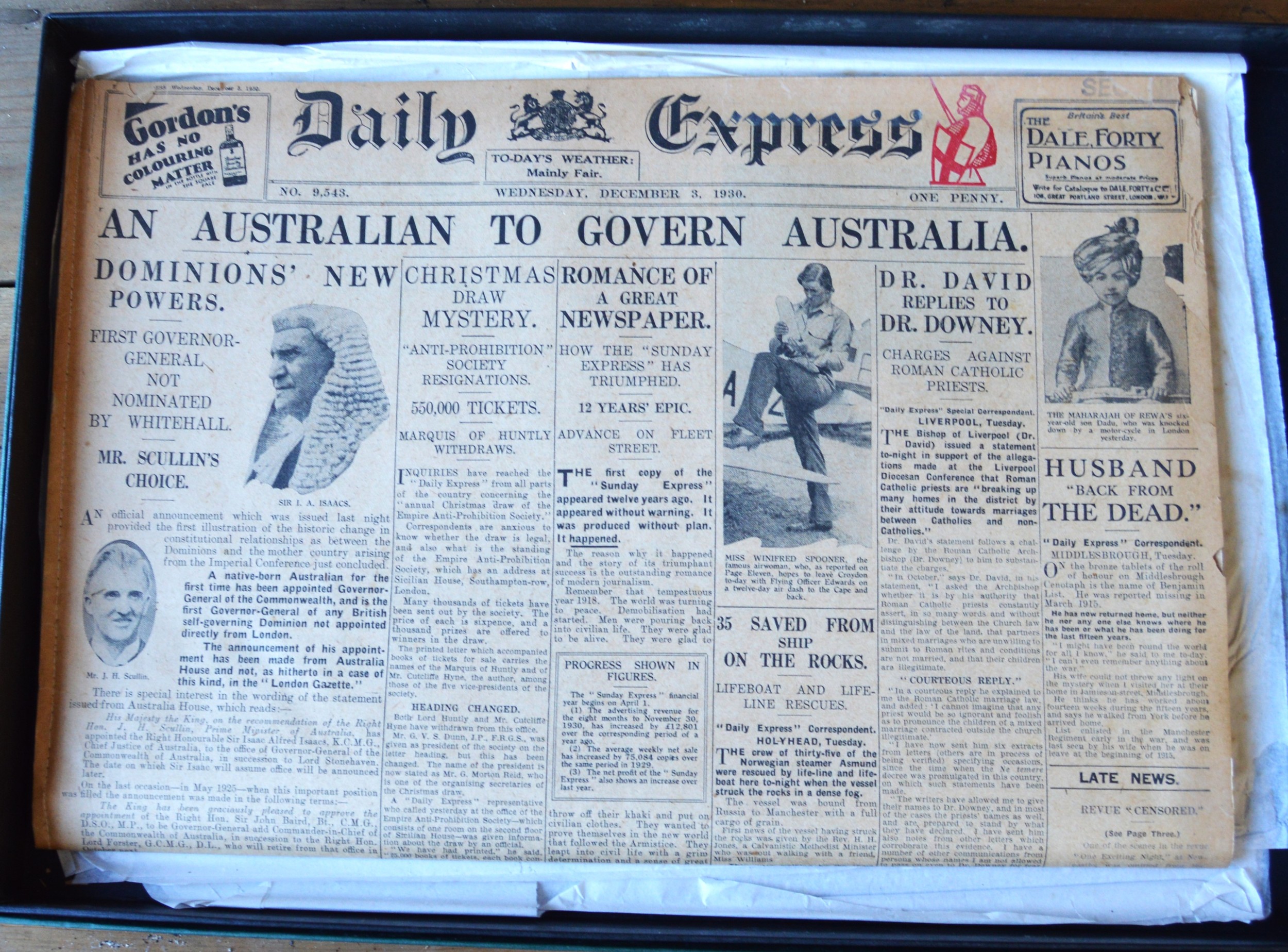 Boxed copy of the Daily Express "Wednesday December 3rd, 1930) - original copy