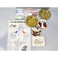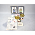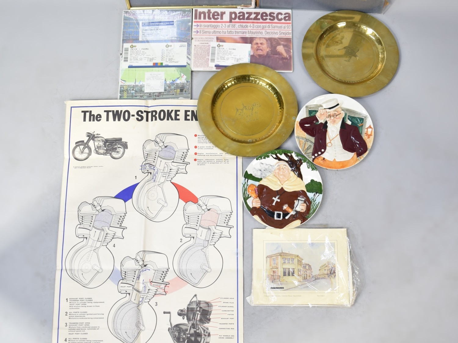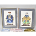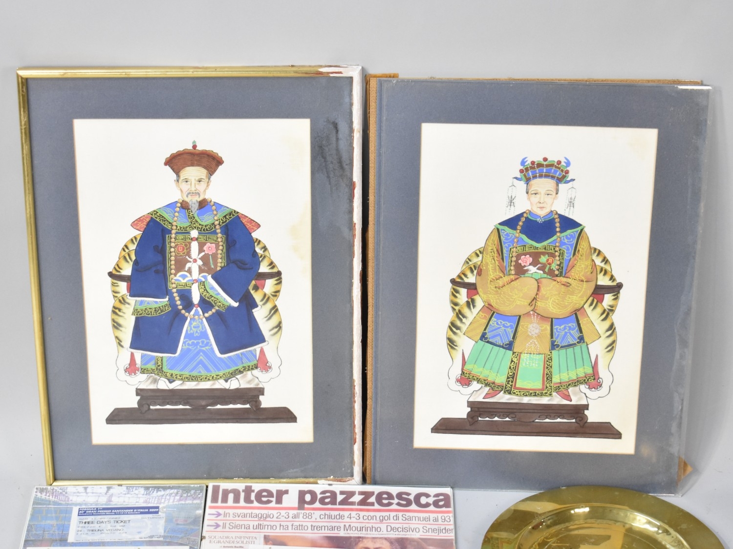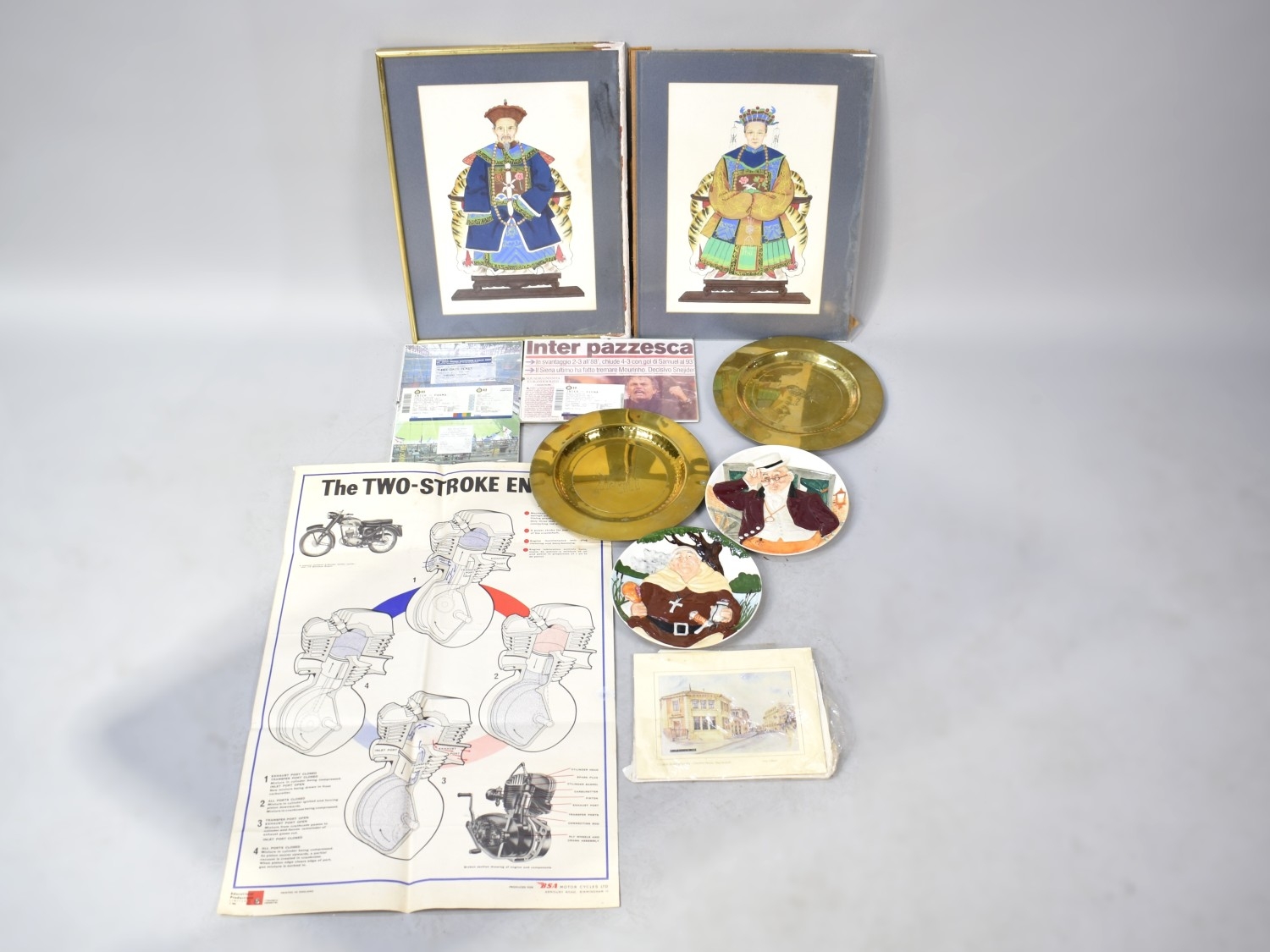 Two Coloured Prints, Chinese Emperors, Two Decorated Plates, Two Brass Chargers Etc